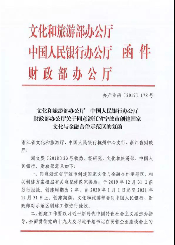 2月10日,文化和旅游部、中國(guó)人民銀行、財(cái)政部正式批復(fù),同意寧波創(chuàng)建國(guó)家文化與金融合作示范區(qū),創(chuàng)建時(shí)間從2020年1月至2021年12月。據(jù)“中經(jīng)文化產(chǎn)業(yè)”了解,目前全國(guó)僅兩個(gè)城市被列為創(chuàng)建國(guó)家文化與金融合作示范區(qū),另一個(gè)是北京市東城區(qū)。寧波憑什么被列為創(chuàng)建國(guó)家文化與金融合作示范區(qū)呢?我們一起來看看。