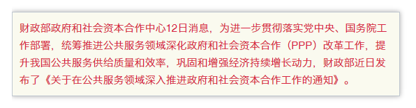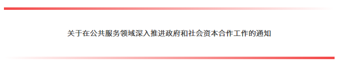 為進(jìn)一步貫徹落實黨中央、國務(wù)院工作部署,統(tǒng)籌推進(jìn)公共服務(wù)領(lǐng)域深化政府和社會資本合作(PPP)改革工作,提升我國公共服務(wù)供給質(zhì)量和效率,鞏固和增強(qiáng)經(jīng)濟(jì)持續(xù)增長動力,現(xiàn)將有關(guān)事項通知如下: