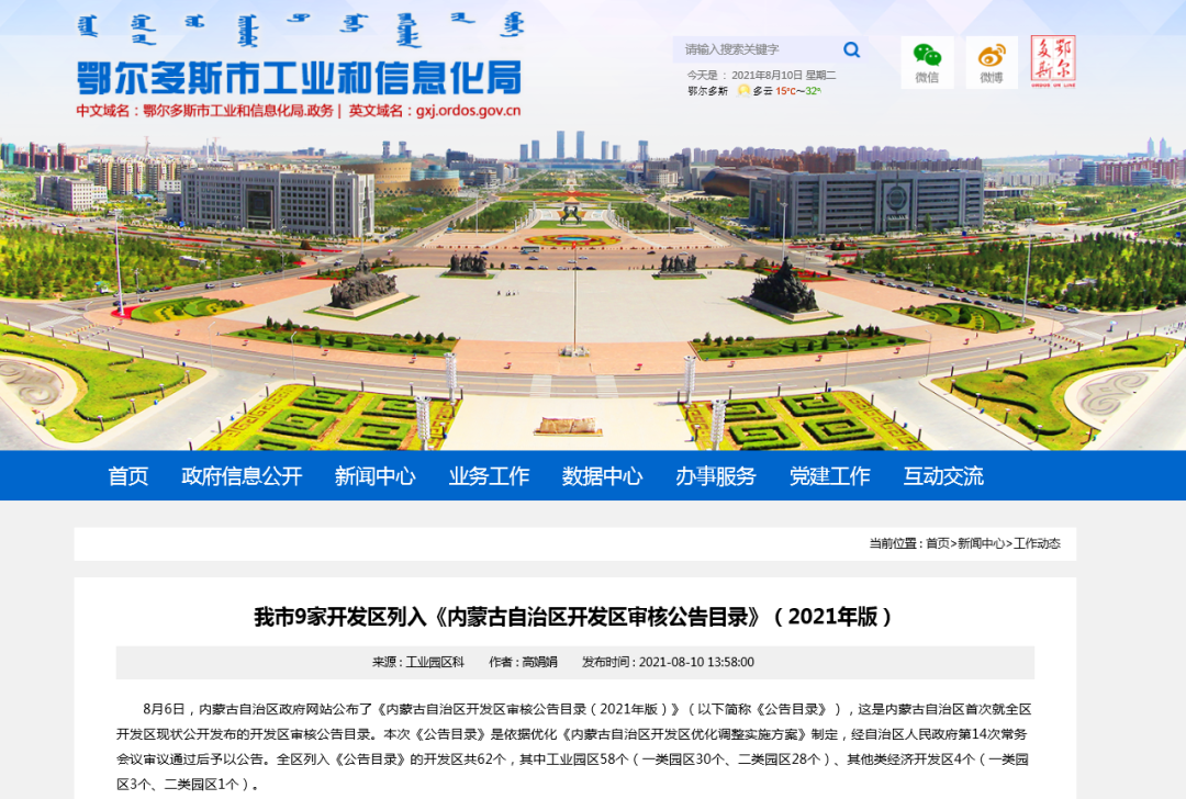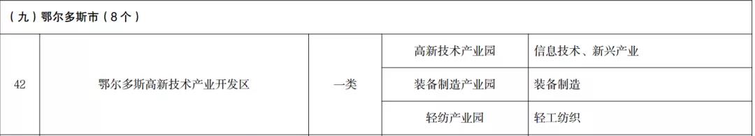 鄂爾多斯市9家開(kāi)發(fā)區(qū)列入《公告目錄》,其中工業(yè)園區(qū)8個(gè)(一類(lèi)園區(qū)7個(gè),二類(lèi)園區(qū)1個(gè)),是由我市原有獨(dú)立運(yùn)行并以工業(yè)為主導(dǎo)的園區(qū)優(yōu)化整合而成,具體為:鄂爾多斯高新技術(shù)產(chǎn)業(yè)開(kāi)發(fā)區(qū)、內(nèi)蒙古鄂爾多斯達(dá)拉特經(jīng)濟(jì)開(kāi)發(fā)區(qū)、內(nèi)蒙古鄂爾多斯準(zhǔn)格爾經(jīng)濟(jì)開(kāi)發(fā)區(qū)、內(nèi)蒙古鄂爾多斯蒙蘇經(jīng)濟(jì)開(kāi)發(fā)區(qū)、內(nèi)蒙古鄂爾多斯蘇里格經(jīng)濟(jì)開(kāi)發(fā)區(qū)、內(nèi)蒙古鄂爾多斯鄂托克經(jīng)濟(jì)開(kāi)發(fā)區(qū)、內(nèi)蒙古鄂爾多斯上海廟經(jīng)濟(jì)開(kāi)發(fā)區(qū)為一類(lèi)園區(qū),內(nèi)蒙古鄂爾多斯杭錦經(jīng)濟(jì)開(kāi)發(fā)區(qū)為二類(lèi)園區(qū);其他類(lèi)經(jīng)濟(jì)開(kāi)發(fā)區(qū)1個(gè)(二類(lèi))為:鄂爾多斯空港物流園區(qū)(鄂爾多斯綜合保稅區(qū))。