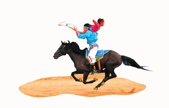只見來自內(nèi)蒙古馬術(shù)隊(duì)及成吉思汗陵雙駿馬術(shù)俱樂部的馬術(shù)表演者們,在馬背上靈活翻轉(zhuǎn),時而如猴子撈月,拾起地上的花籃;時而倒立身姿筆直如青松;時而左右跳躍,像個頑皮的孩童。他們有的一人駕雙馬奔馳;有的一人肩上托舉另一人騎馬前行;有的更是六人疊羅漢駕三匹馬飛奔,高超的馬術(shù)技巧獲得在場觀眾陣陣熱烈的掌聲。表演過程中,內(nèi)蒙古馬術(shù)隊(duì)一位馬術(shù)隊(duì)員突然摔下馬,之后他迅速站起,走向一邊,不禁讓觀眾為他捏了把汗。
