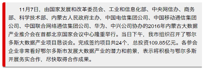 在剛剛閉幕不久的中國共產(chǎn)黨鄂爾多斯市第四次代表大會(huì)上,市委書記白玉剛提出:“要加快發(fā)展以云計(jì)算、大數(shù)據(jù)、移動(dòng)互聯(lián)網(wǎng)為代表的新一代信息技術(shù)產(chǎn)業(yè),構(gòu)筑產(chǎn)業(yè)集群發(fā)展優(yōu)勢,建設(shè)服務(wù)全國的云計(jì)算數(shù)據(jù)中心、備份中心和應(yīng)用中心?!?