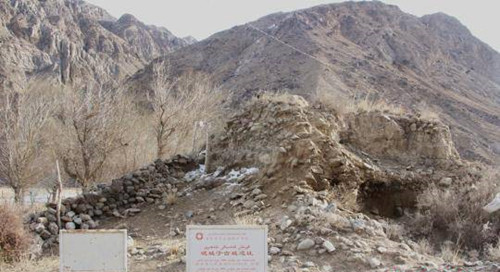 如今,已看不見古城的大門,只看到靠近城門墻的東邊是一個(gè)高臺(tái),可以看見城墻是以卵礫石和黃泥土混筑,中間還夾雜一層木條或樹枝,北面和西面的山崖之間連接一道石頭砌成的欄墻,一直延伸到兩邊的山體,由此可見,古城和欄墻構(gòu)筑了一座易守難攻的關(guān)隘。