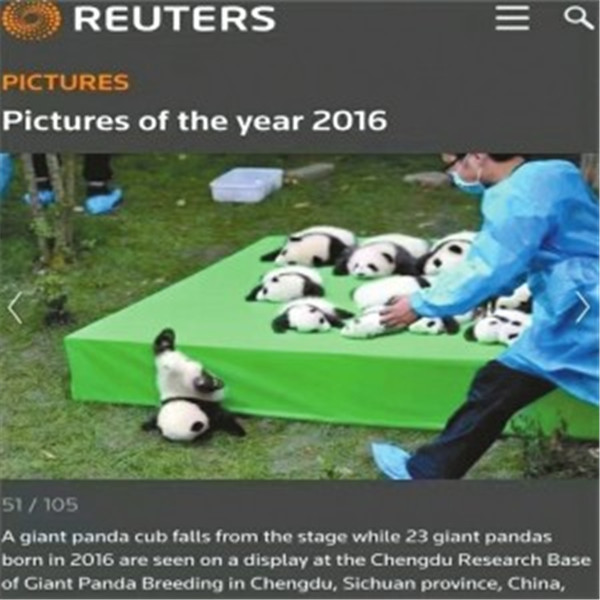 這條消息稱(chēng),去年9月,成都大熊貓繁育研究基地內(nèi),2016年度出生的23只大熊貓寶寶,全部被工作人員抱出來(lái)集體亮相,萌態(tài)十足吸引了眾多游客。一只熊貓寶寶不慎從“舞臺(tái)”上摔落,這一幕被攝影師捕捉下來(lái)。該照片入選路透社2016年度圖片,被美國(guó)《時(shí)代周刊》評(píng)為“2016年度動(dòng)物類(lèi)照片50佳”。
