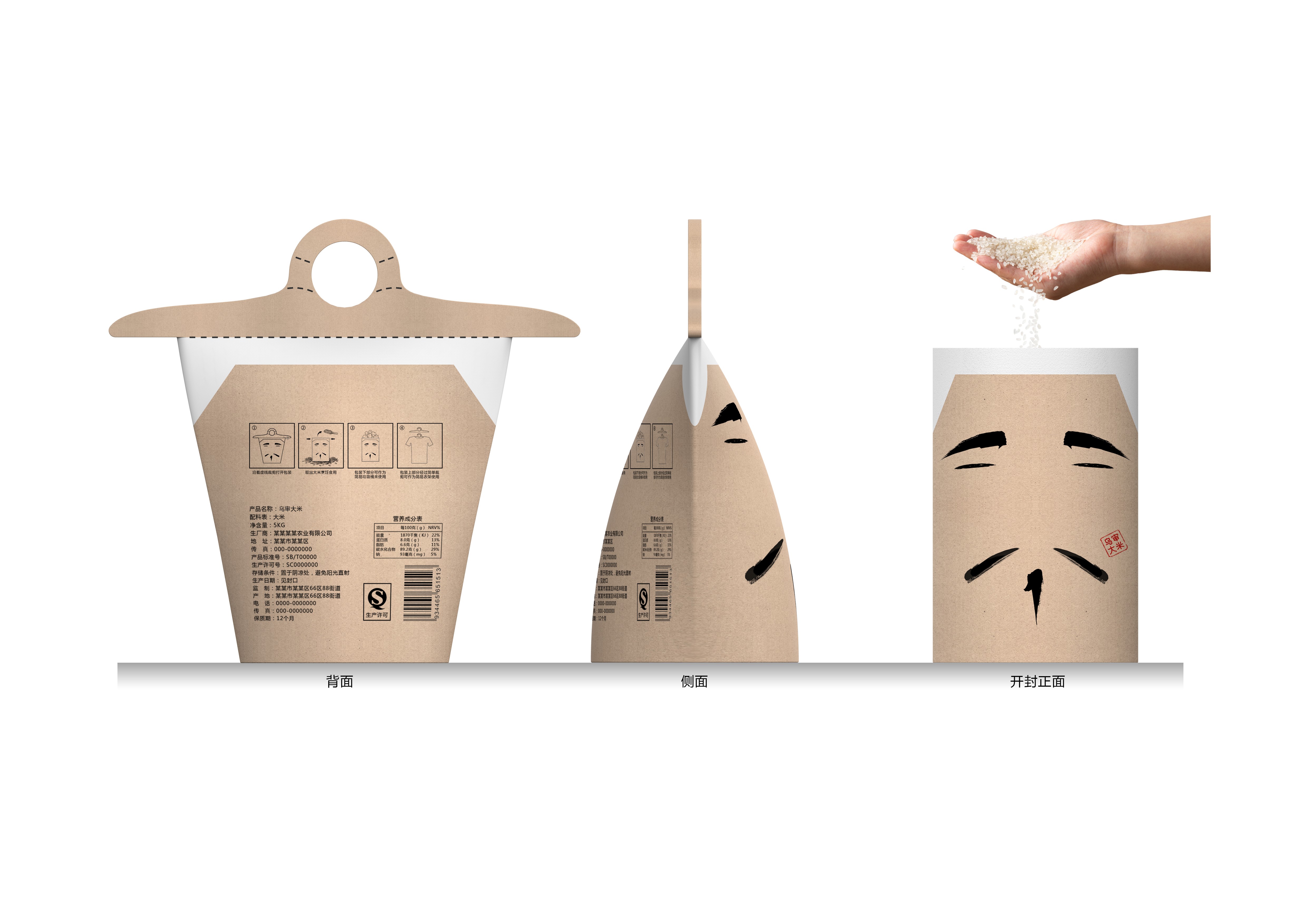 這款烏審大米的包裝設(shè)計(jì)遵循,實(shí)用、簡(jiǎn)單、趣味以及環(huán)??沙掷m(xù)為定位,包裝整體摒棄傳統(tǒng)大米包裝的產(chǎn)品信息繁雜性,通過(guò)簡(jiǎn)畫的描述,趣味化的表現(xiàn)出培育種植大米的農(nóng)民伯伯精神面貌,傳達(dá)給人們?cè)谙碛么竺椎倪^(guò)程中對(duì)于辛勤農(nóng)民伯伯的勞動(dòng)付出應(yīng)存敬仰之心,且做到節(jié)約糧食的行動(dòng)表現(xiàn)。另外,這款大米包裝設(shè)計(jì)在除含有基本的容器作用之外,使用完的包裝經(jīng)過(guò)簡(jiǎn)單的裁剪還能作為簡(jiǎn)易的衣架和垃圾桶來(lái)使用。