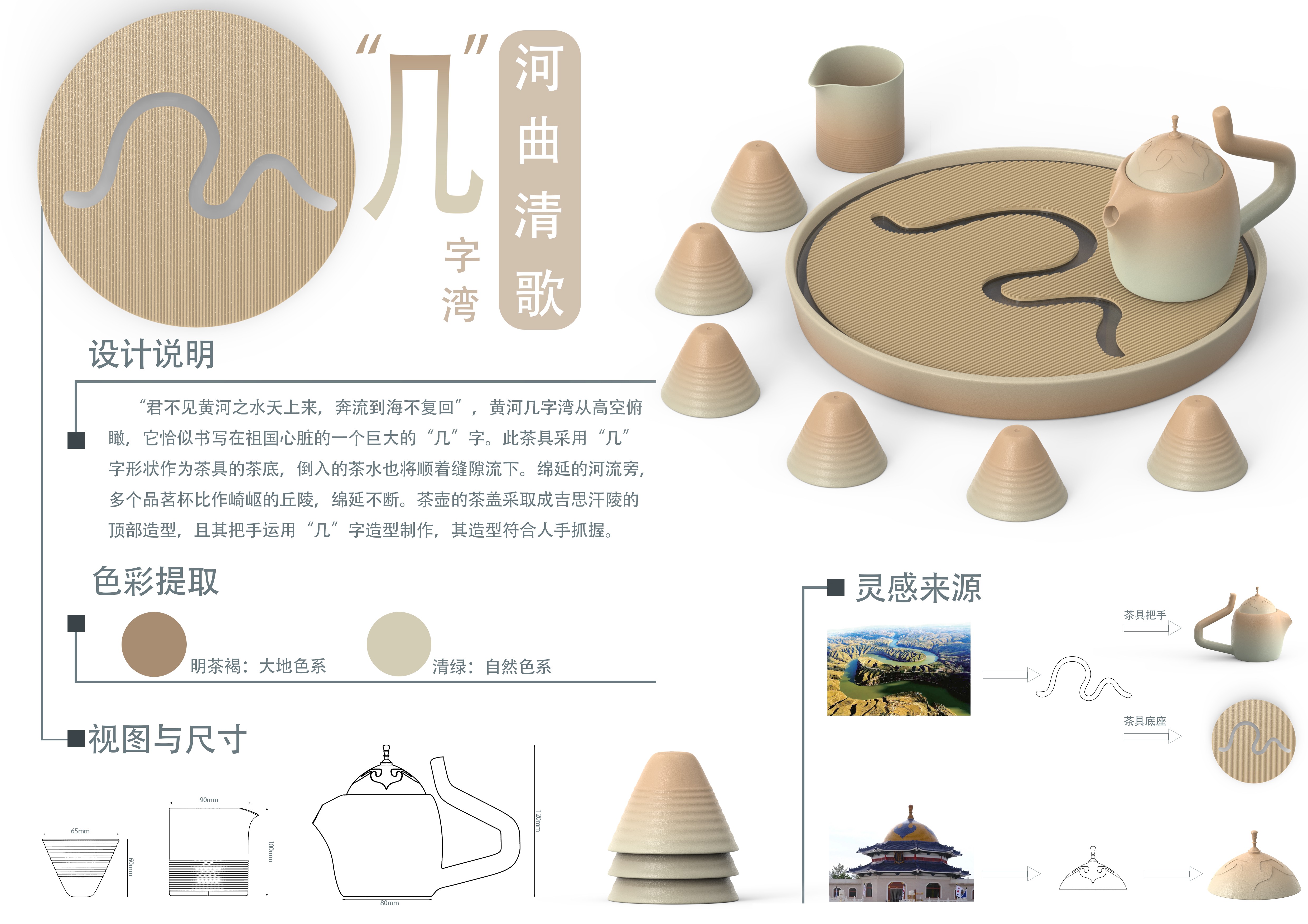 創(chuàng)作思路:結(jié)合黃河“幾”字灣的地形和色彩制作出一套茶具