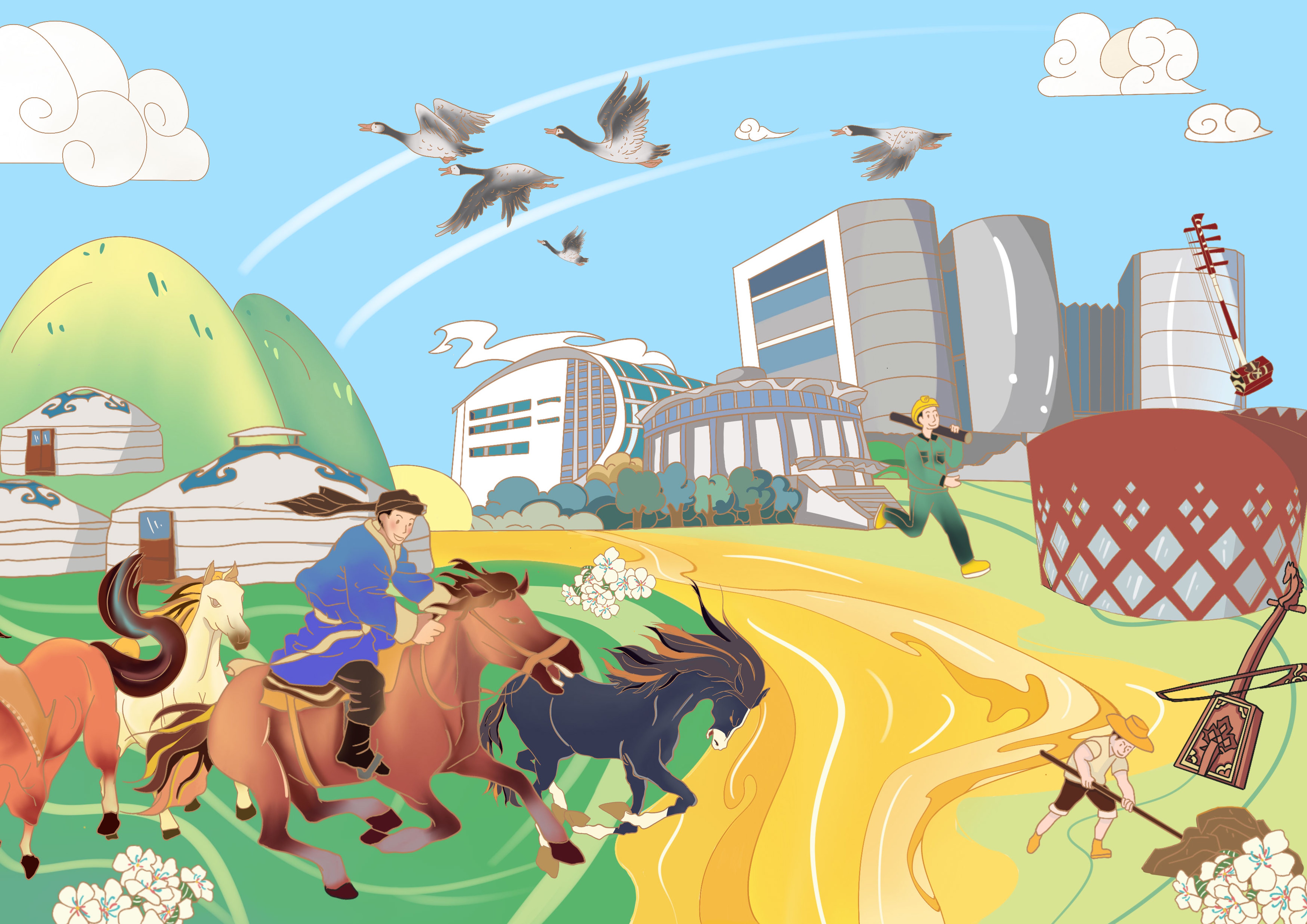 創(chuàng)作思路:主要?jiǎng)?chuàng)意來自于近年來鄂爾多斯城市的飛速發(fā)展,人民轉(zhuǎn)變美好家園的過程。