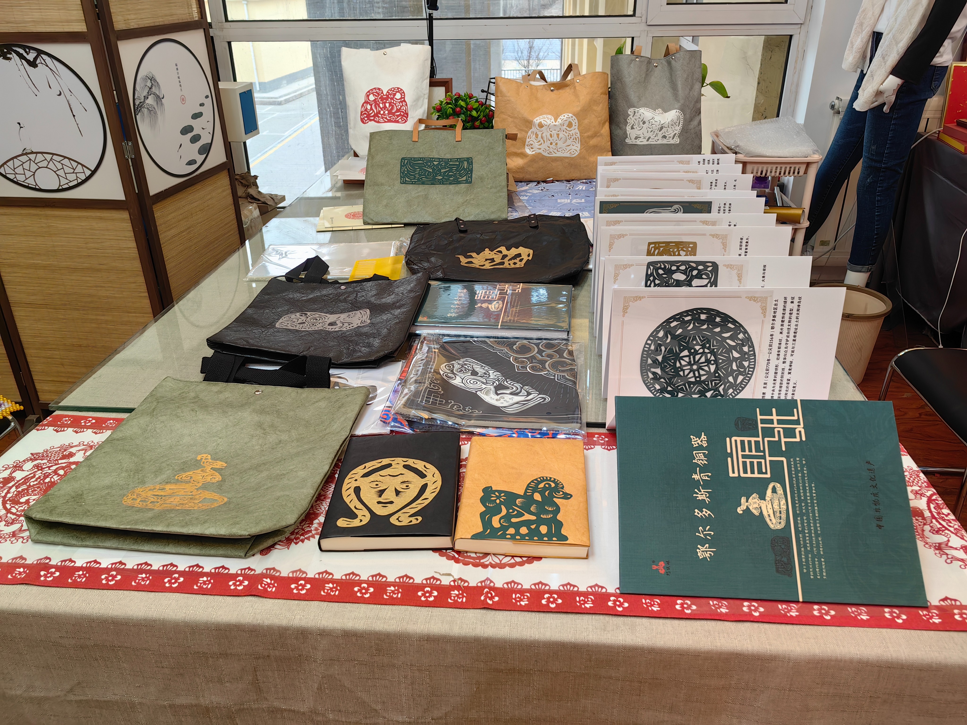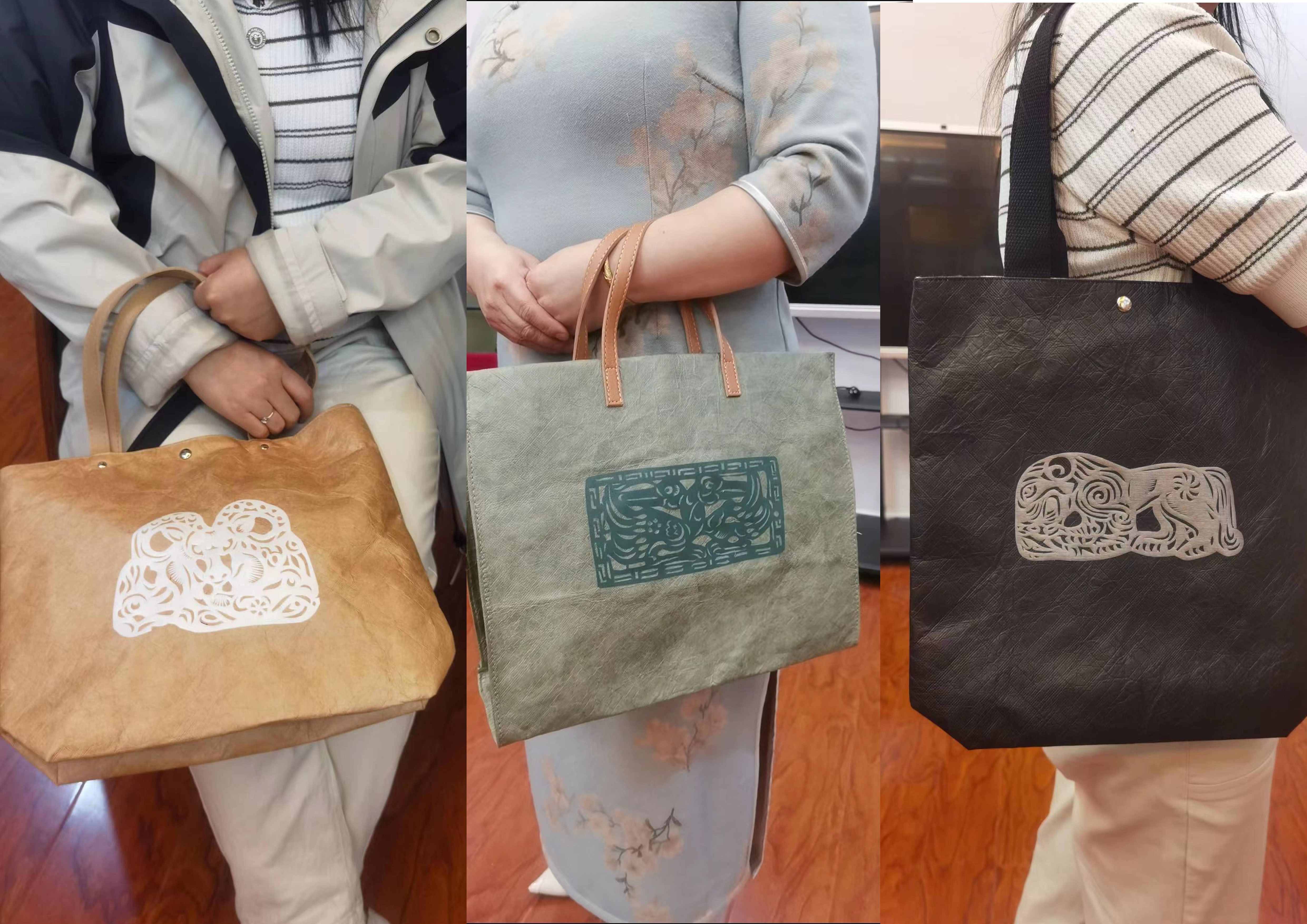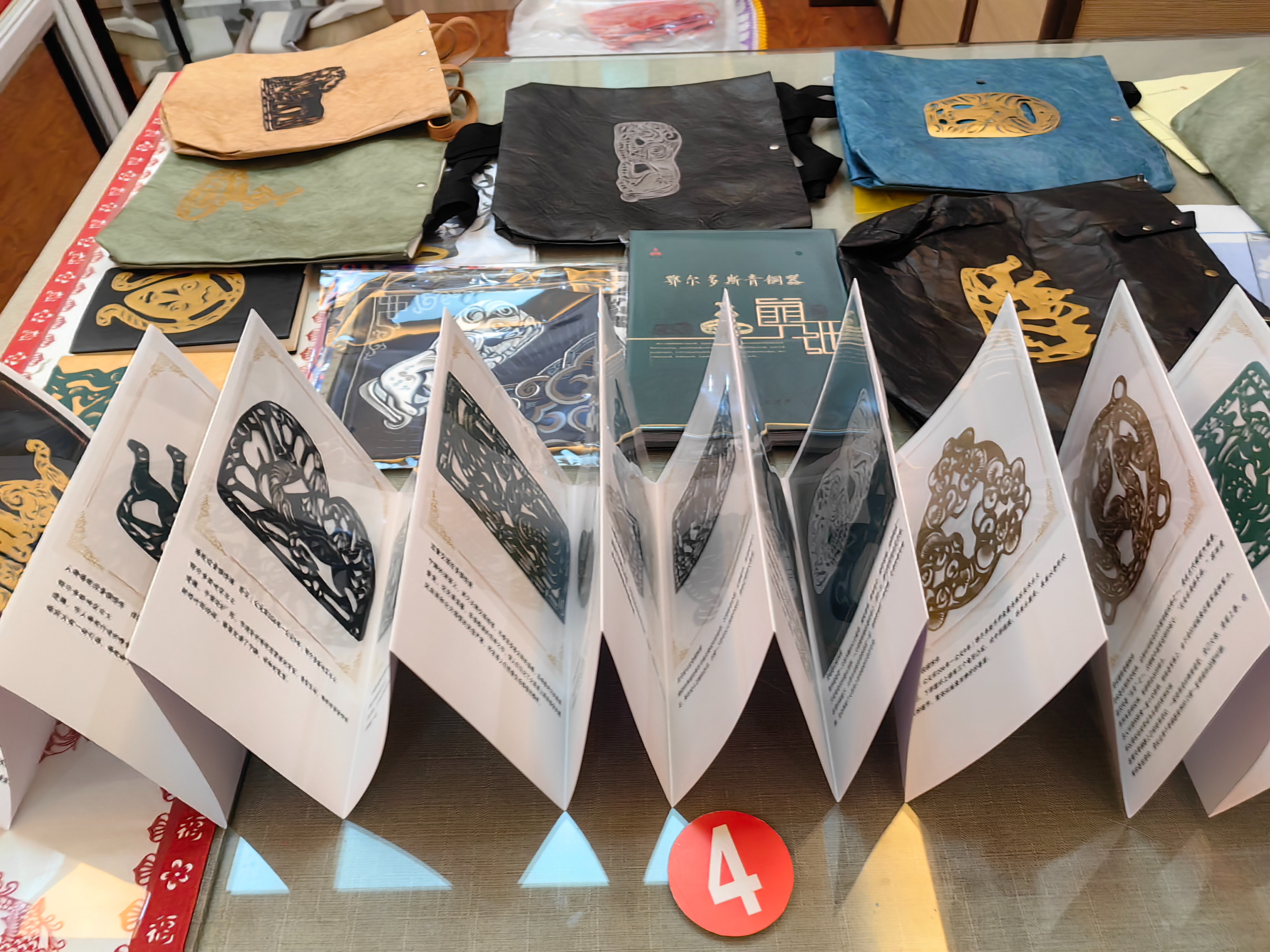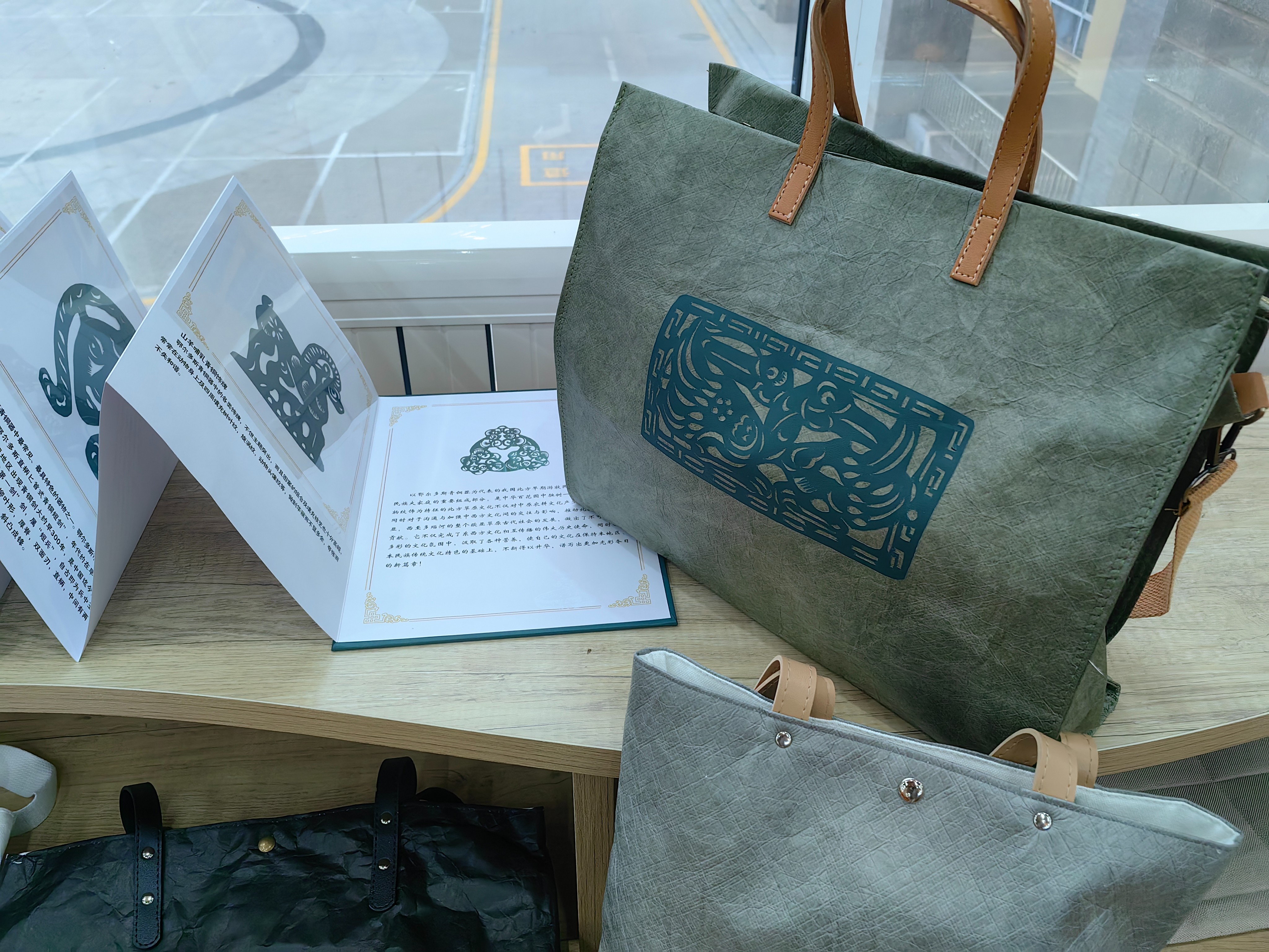 創(chuàng)作思路:鄂爾多斯青銅器其文化內(nèi)涵豐富、造型生動(dòng)、具有很高的觀賞價(jià)值和藝術(shù)價(jià)值,剪紙冊采用風(fēng)琴頁設(shè)計(jì),剪紙可以單獨(dú)展示也可以長卷展示。里面精選具有代表性的20張青銅器剪紙作品。包包是采用俗稱“會(huì)呼吸的紙”杜邦紙制作而成,上面飾以各種青銅剪紙紋樣,柔韌抗撕裂,防水、防曬,好清潔,環(huán)保 可降解。相比起普通純色包包更耐看和精致。