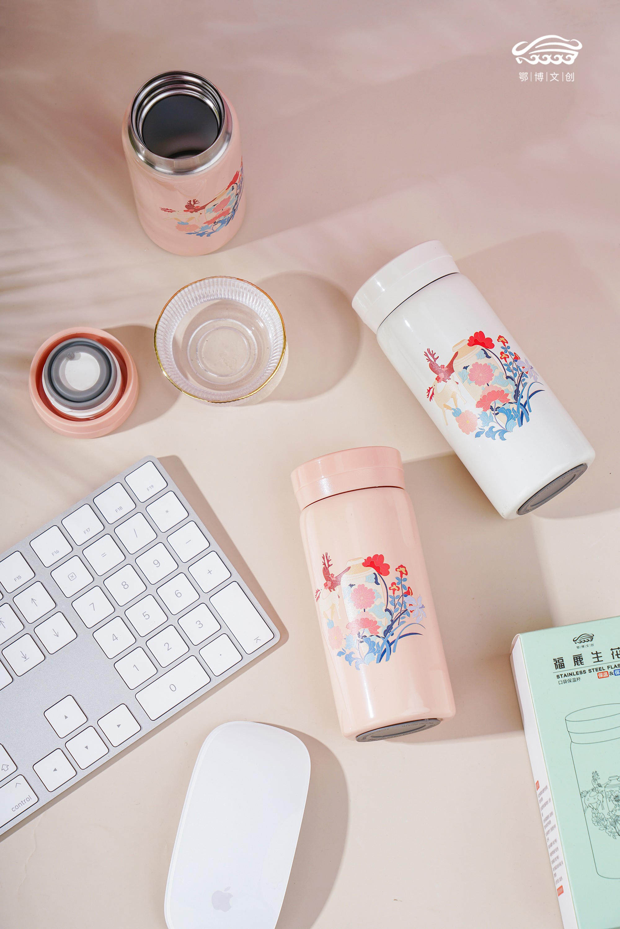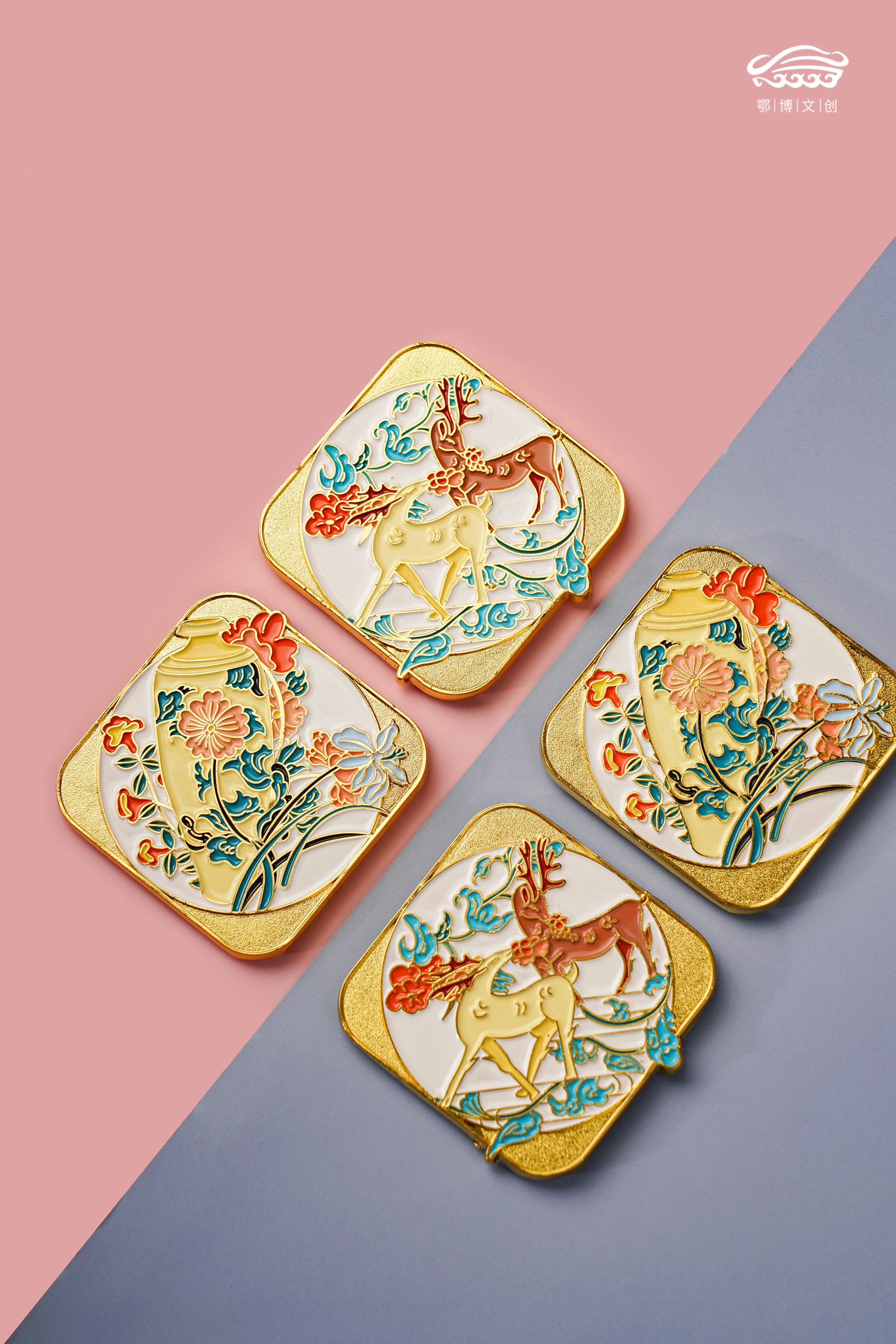 創(chuàng)作思路:圖案來源于鄂爾多斯市博物院館藏文物,西夏牡丹紋褐釉剔花瓶,提取文物中回首鹿(寓意福祿)、牡丹圖案紋飾(寓意富貴),結(jié)合馬蘭花等元素,繪制原創(chuàng)主題插畫,衍生為“福鹿生花”系列產(chǎn)品。