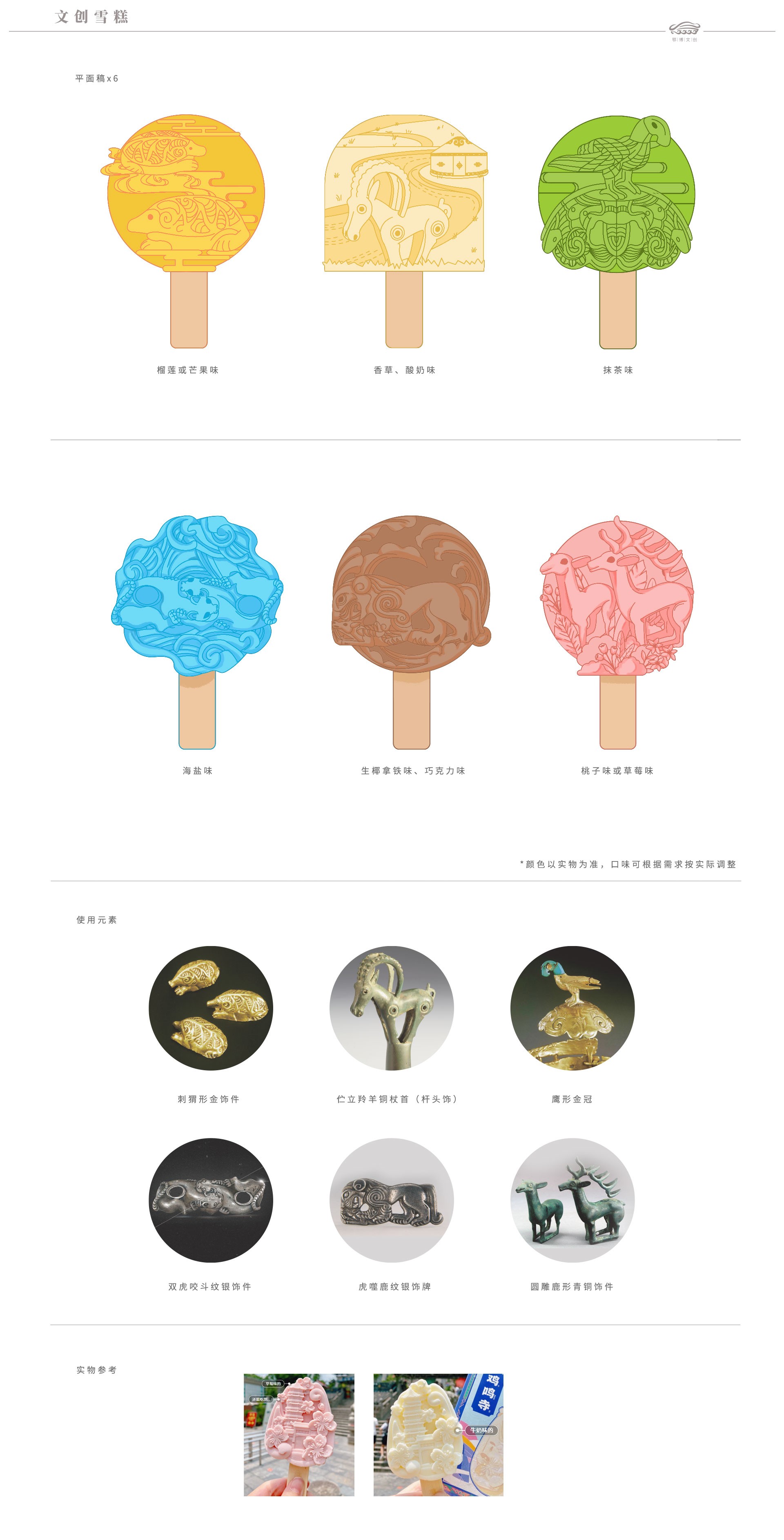 創(chuàng)作思路:選取鄂爾多斯青銅器中六件精美的文物,提取文物上的動(dòng)物造型及紋飾,設(shè)計(jì)為文創(chuàng)雪糕,讓大眾品嘗特色文創(chuàng)雪糕的同時(shí),也可以感受鄂爾多斯?fàn)N爛的文化,通過拍照打卡,讓更多人了解額爾地拍搜、來到鄂爾多斯。