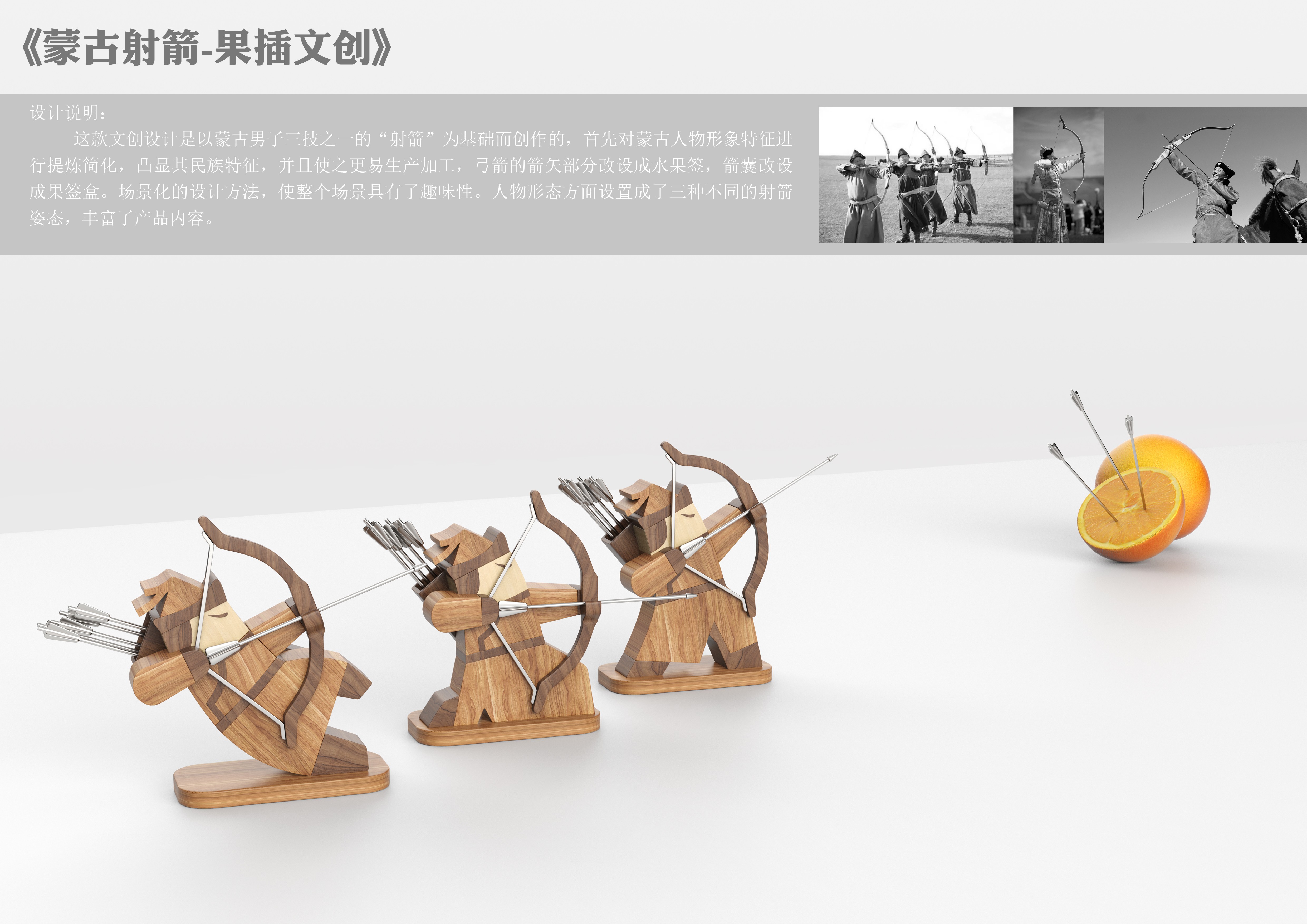 創(chuàng)作思路:這款文創(chuàng)設(shè)計是以蒙古男子三技之一的“射箭”為基礎(chǔ)而創(chuàng)作的,首先對蒙古人物形象特征進行提煉簡化,凸顯其民族特征,并且使之更易生產(chǎn)加工,弓箭的箭矢部分改設(shè)成水果簽,箭囊改設(shè)成果簽盒