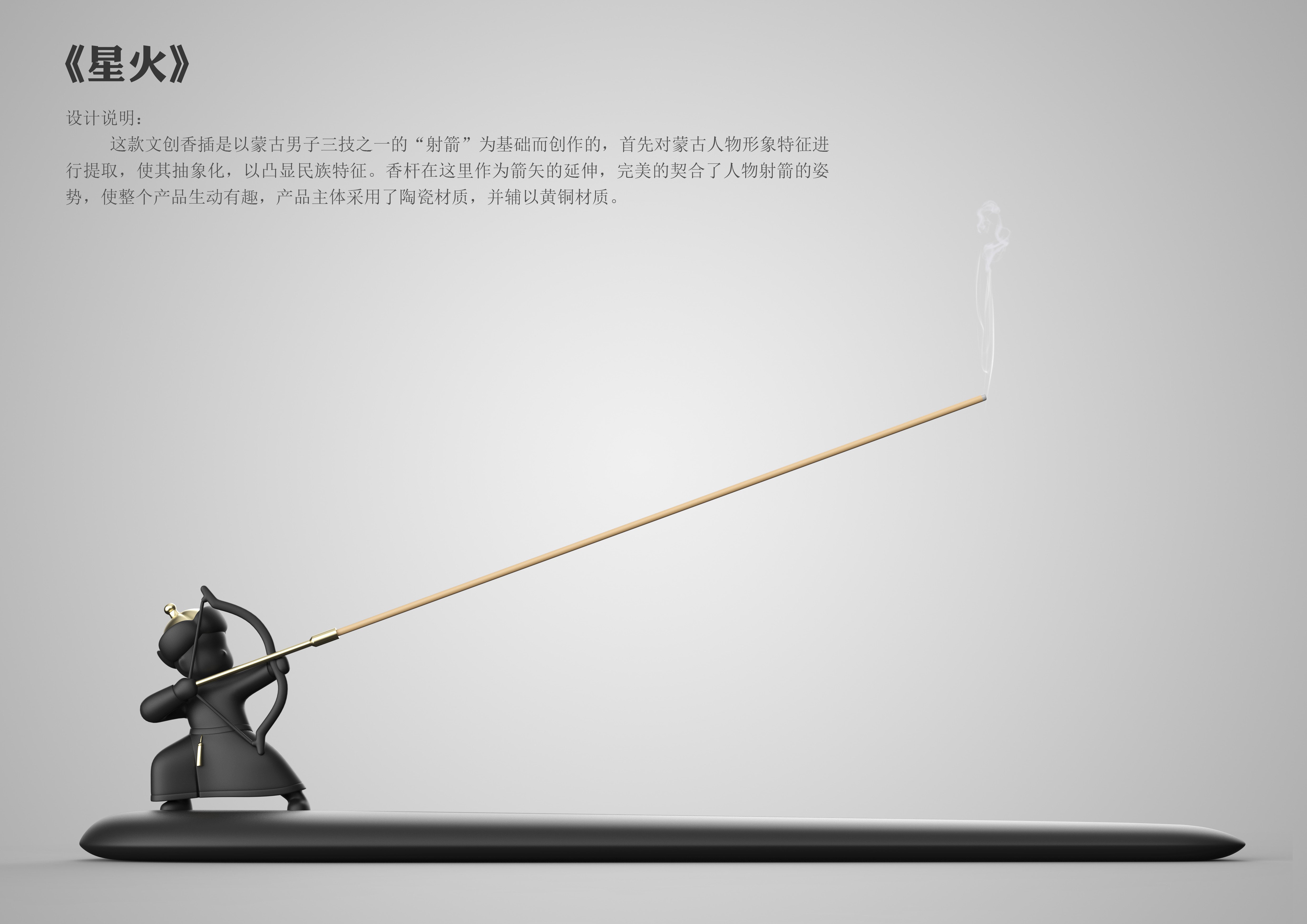 設(shè)計(jì)理念:利用香桿的造型作為箭矢的延伸,完美的契合了人物射箭的姿勢,使整個(gè)產(chǎn)品生動(dòng)有趣。凸顯了名族特征。