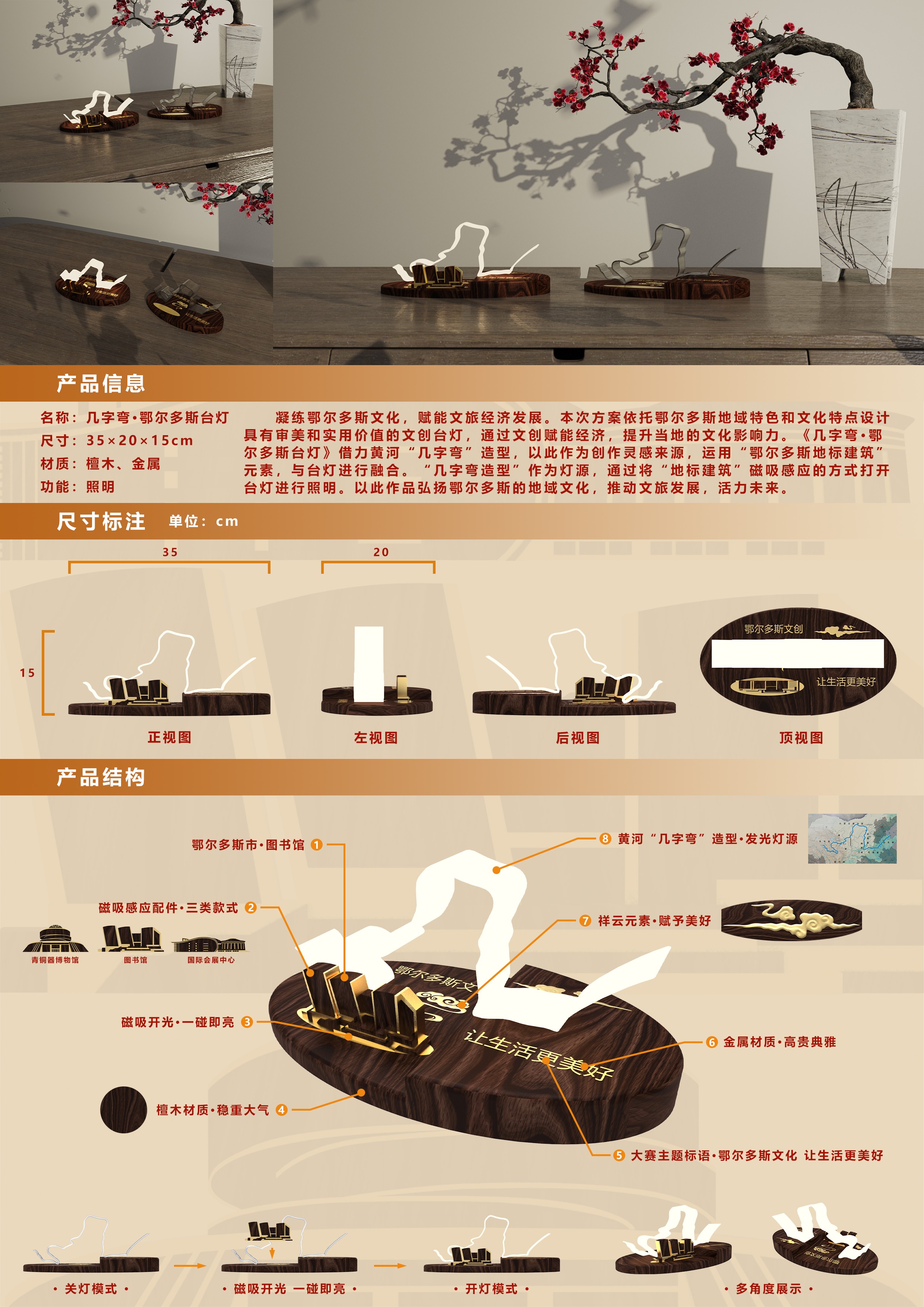凝練鄂爾多斯文化,賦能文旅經(jīng)濟發(fā)展。本次方案依托鄂爾多斯地域特色和文化特點設計具有審美和實用價值的文創(chuàng)臺燈,通過文創(chuàng)賦能經(jīng)濟,提升當?shù)氐奈幕绊懥?。《幾字彎·鄂爾多斯臺燈》借力黃河“幾字彎”造型,以此作為創(chuàng)作靈感來源,運用“鄂爾多斯地標建筑”元素,與臺燈進行融合。“幾字彎造型”作為燈源,通過將“地標建筑”磁吸感應的方式打開臺燈進行照明。以此作品弘揚鄂爾多斯的地域文化,推動文旅發(fā)展,活力未來。