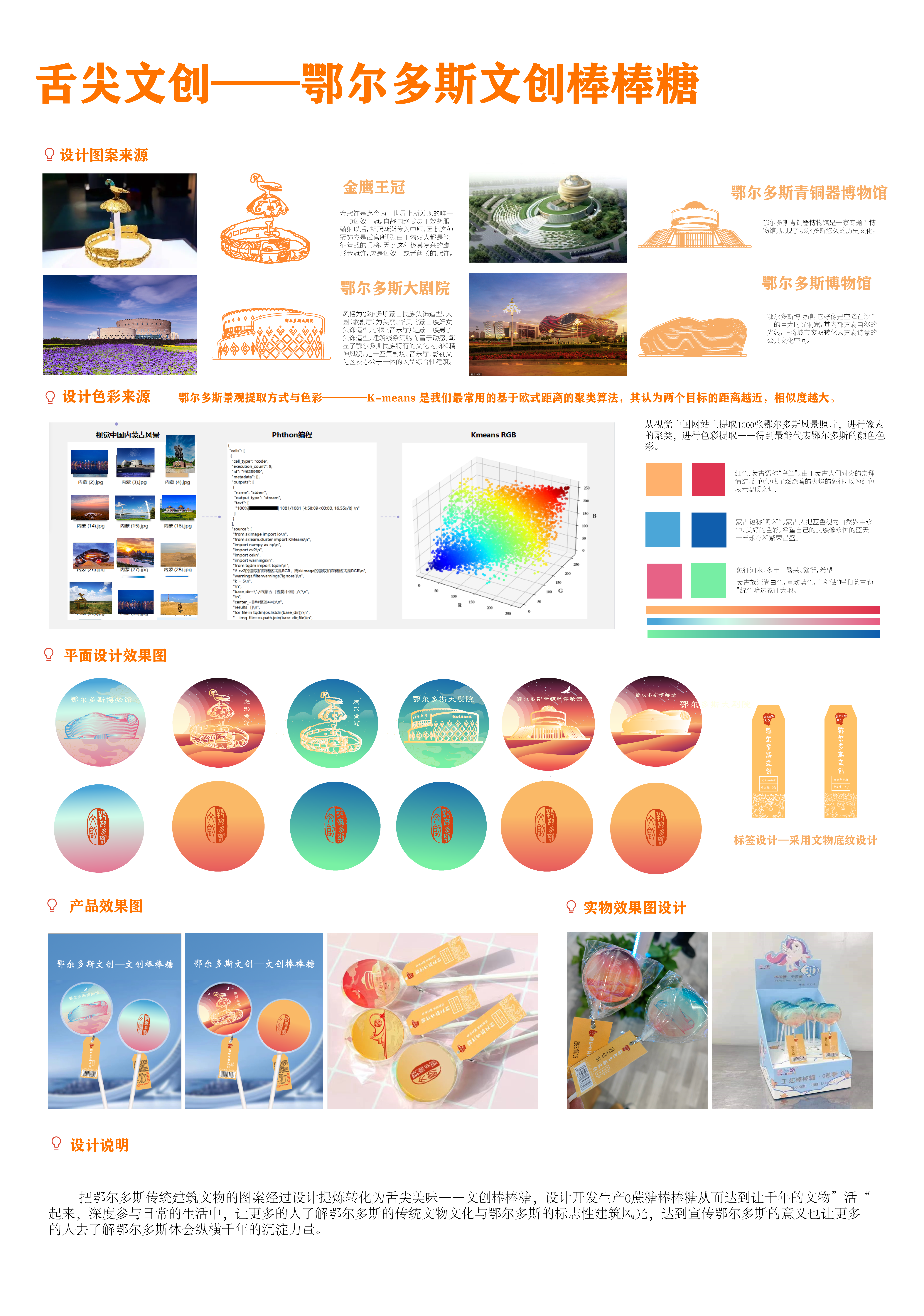創(chuàng)作思路:把鄂爾多斯傳統(tǒng)建筑文物的圖案經(jīng)過設(shè)計提煉轉(zhuǎn)化為舌尖美味——文創(chuàng)棒棒糖,設(shè)計開發(fā)生產(chǎn)0蔗糖棒棒糖從而達到讓千年的文物”活起來,深度參與日常的生活中,讓更多的人了解鄂爾多斯的傳統(tǒng)文物文化與鄂爾多斯的標(biāo)志性建筑風(fēng)光,達到宣傳鄂爾多斯的意義也讓更多的人去了解鄂爾多斯體會縱橫千年的沉淀力量。