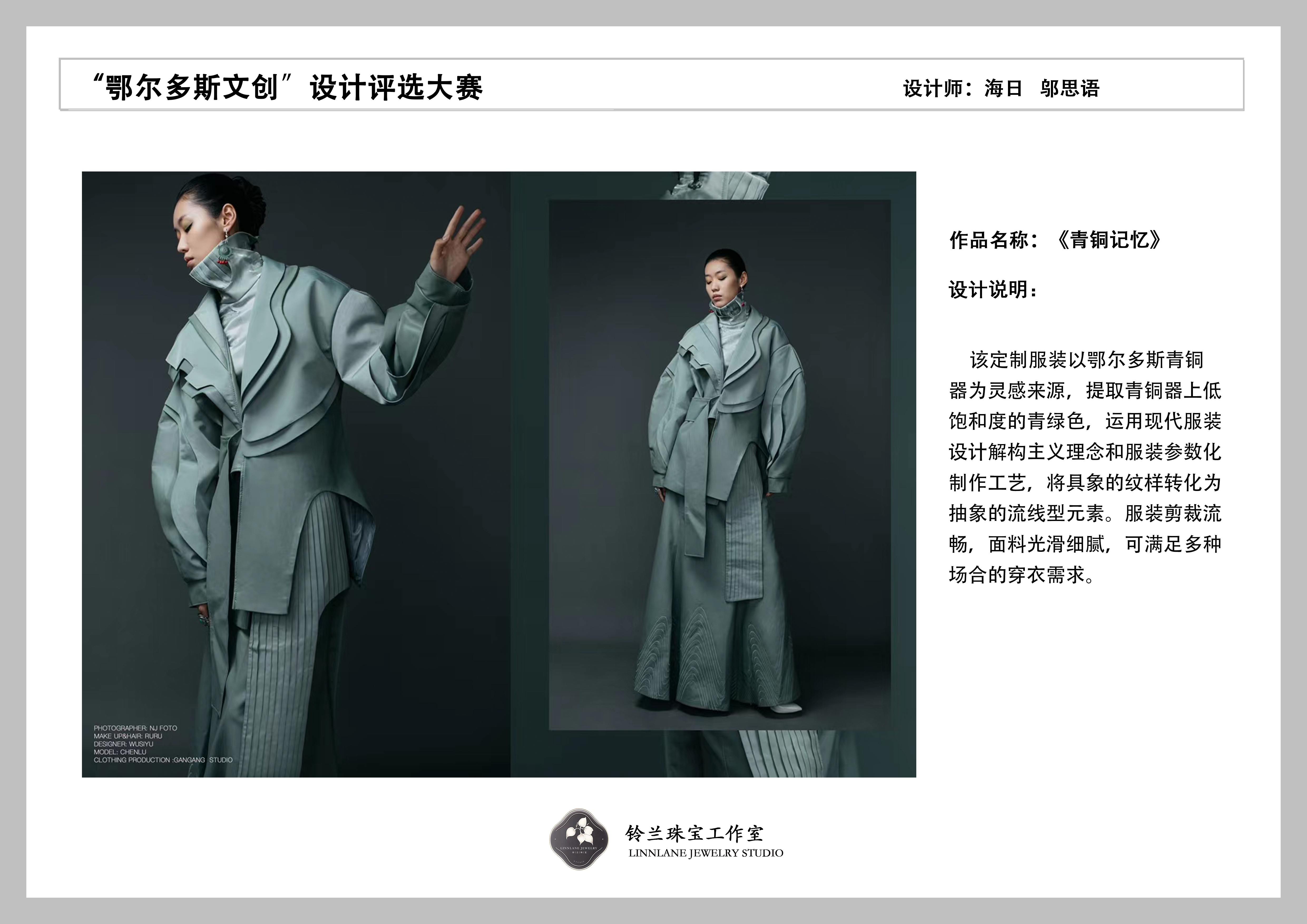 創(chuàng)作思路:該定制服裝以鄂爾多斯青銅器為靈感來源,提取青銅器上低飽和度的青綠色,運用現(xiàn)代服裝設計解構主義理念和服裝參數(shù)化制作工藝,將具象的紋樣轉化為抽象的流線型元素。服裝剪裁流暢,面料光滑細膩,可滿足多種場合的穿衣需求。