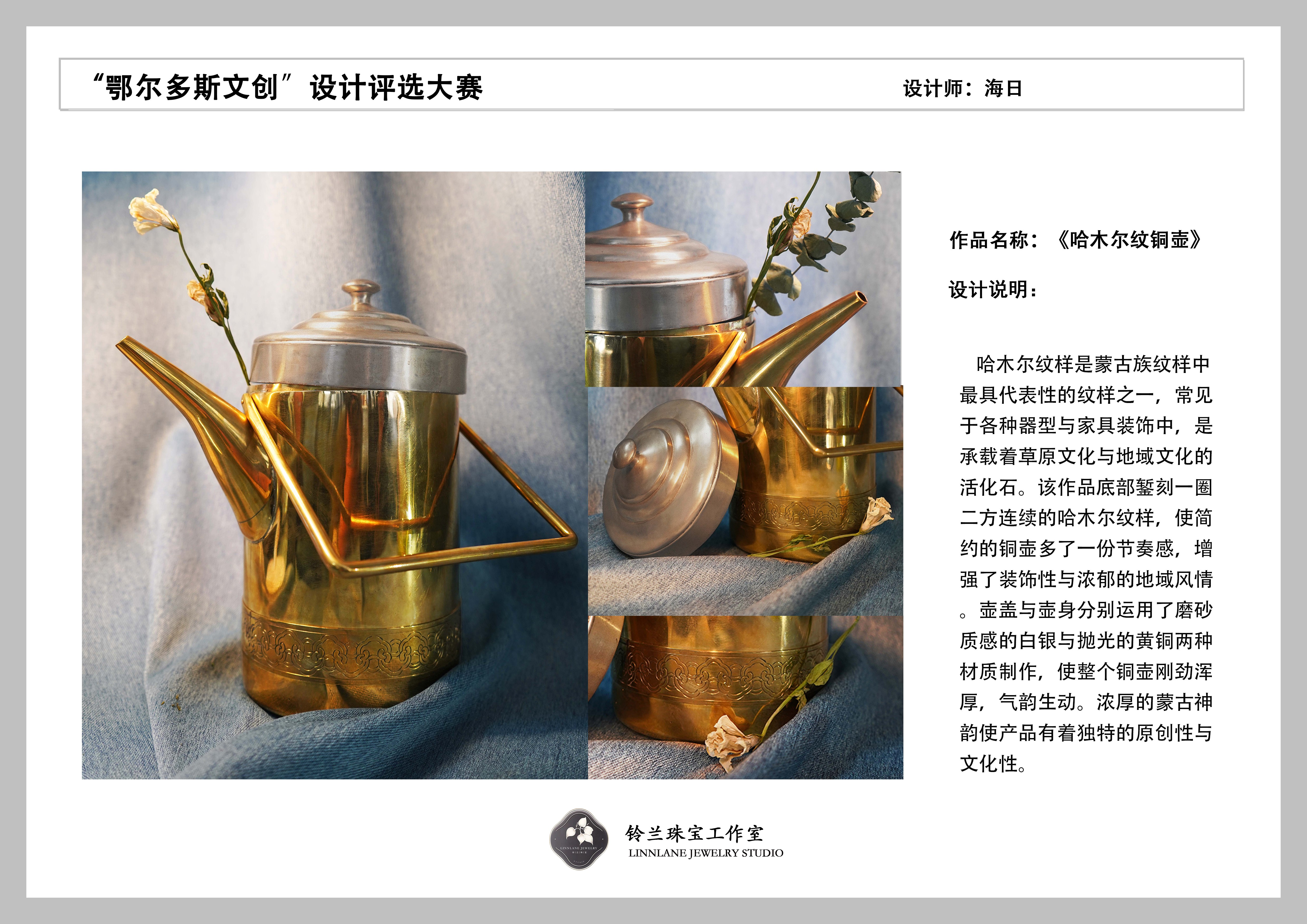 創(chuàng)作思路:哈木爾紋樣是蒙古族紋樣中最具代表性的紋樣之一,常見于各種器型與家具裝飾中,是承載著草原文化與地域文化的活化石。該作品底部璽刻一圈二方連續(xù)的哈木爾紋樣,使簡約的銅壺多了一份節(jié)奏感,增強了裝飾性與濃郁的地域風情。壺蓋與壺身分別運用了磨砂質(zhì)感的白銀與拋光的黃銅兩種材質(zhì)制作,使整個銅壺剛勁渾厚,氣韻生動。濃厚的蒙古神韻使產(chǎn)品有著獨特的原創(chuàng)性與文化性。