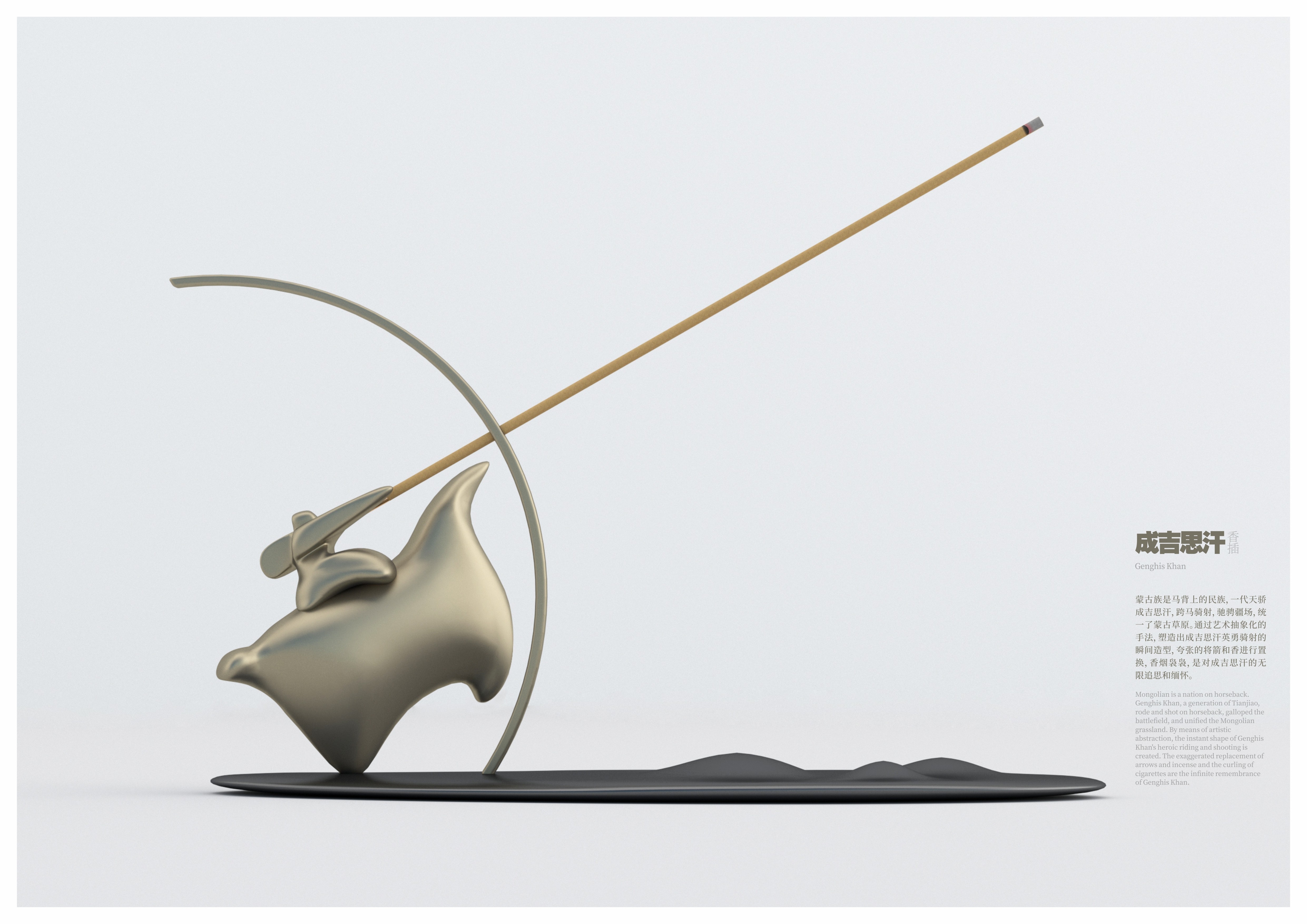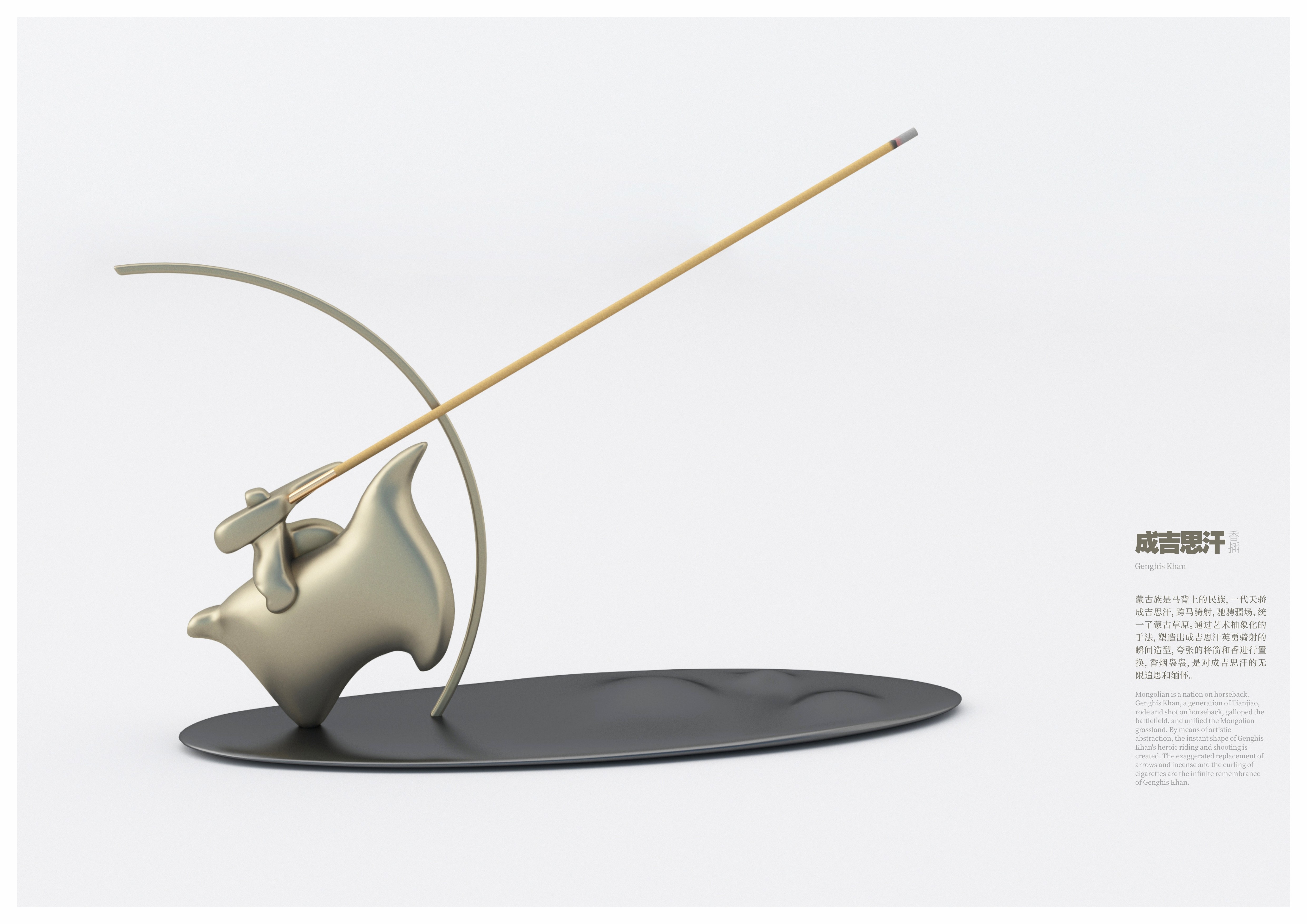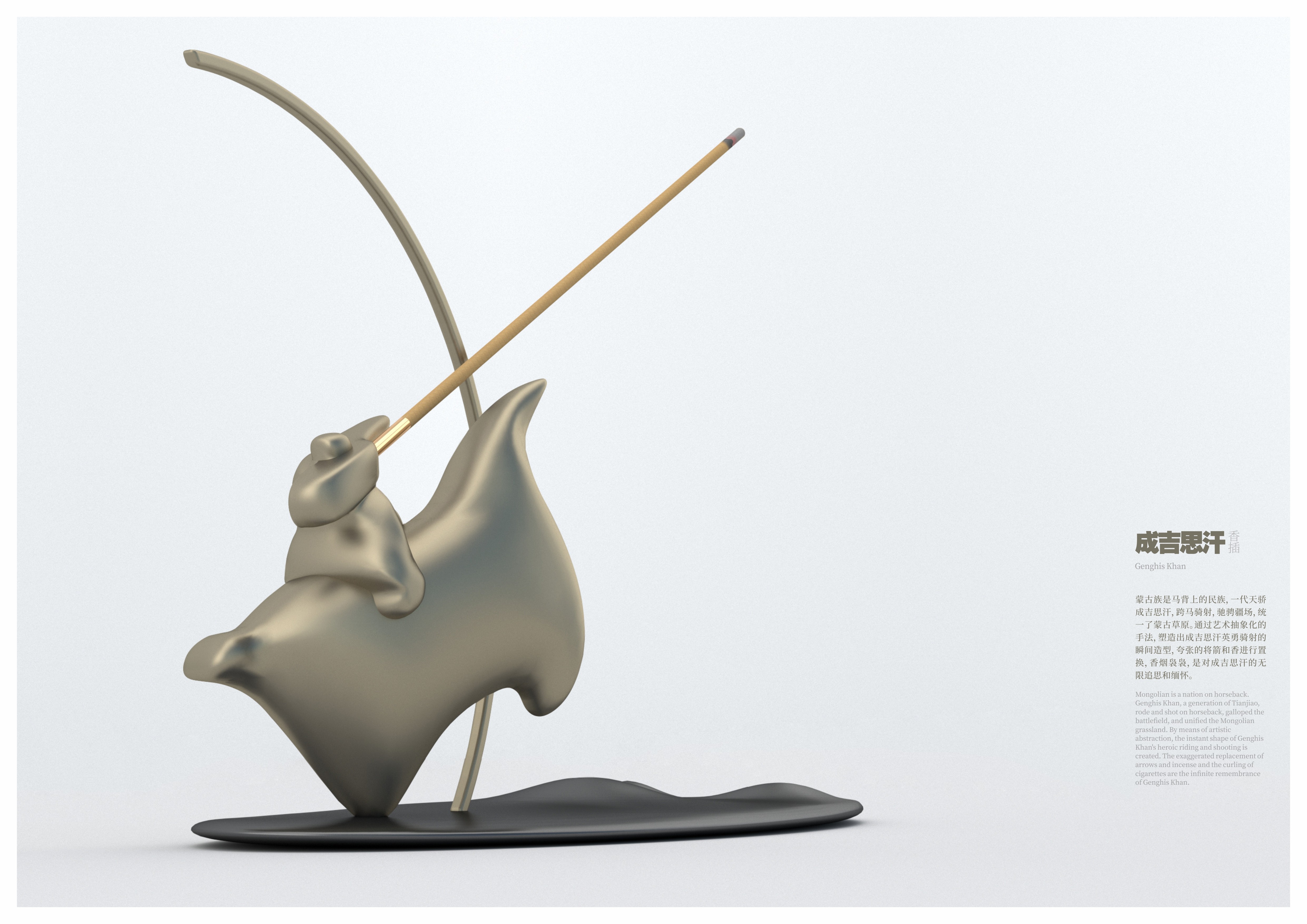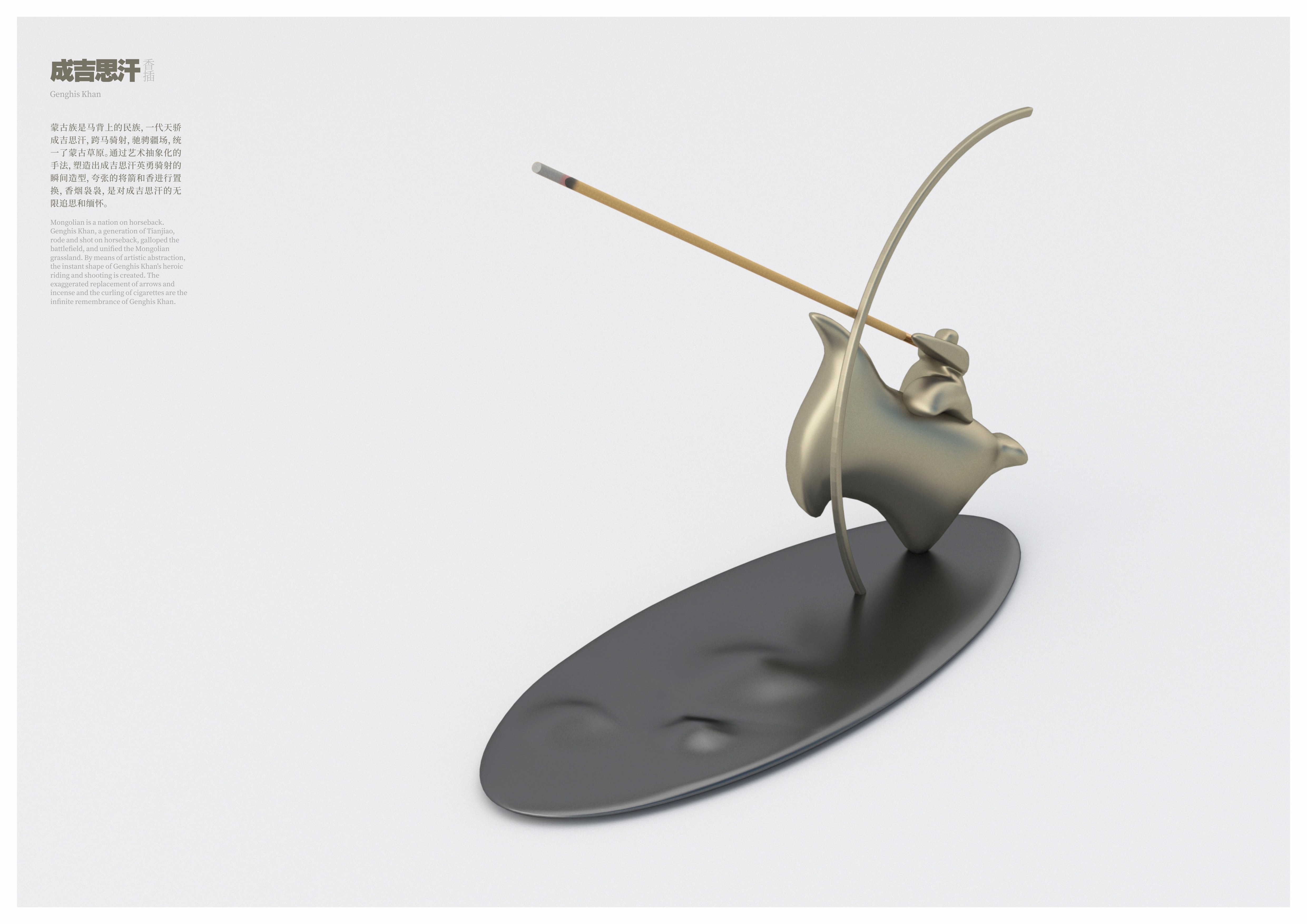 創(chuàng)作思路:蒙古族是馬背上的民族,一代天驕成吉思汗,跨馬騎射,馳騁疆場,統(tǒng)一了蒙古草原。通過藝術(shù)抽象化的手法,塑造出成吉思汗英勇騎射的瞬間造型,將箭和香進(jìn)行置換,香煙裊裊,是對成吉思汗的無限追思和緬懷。