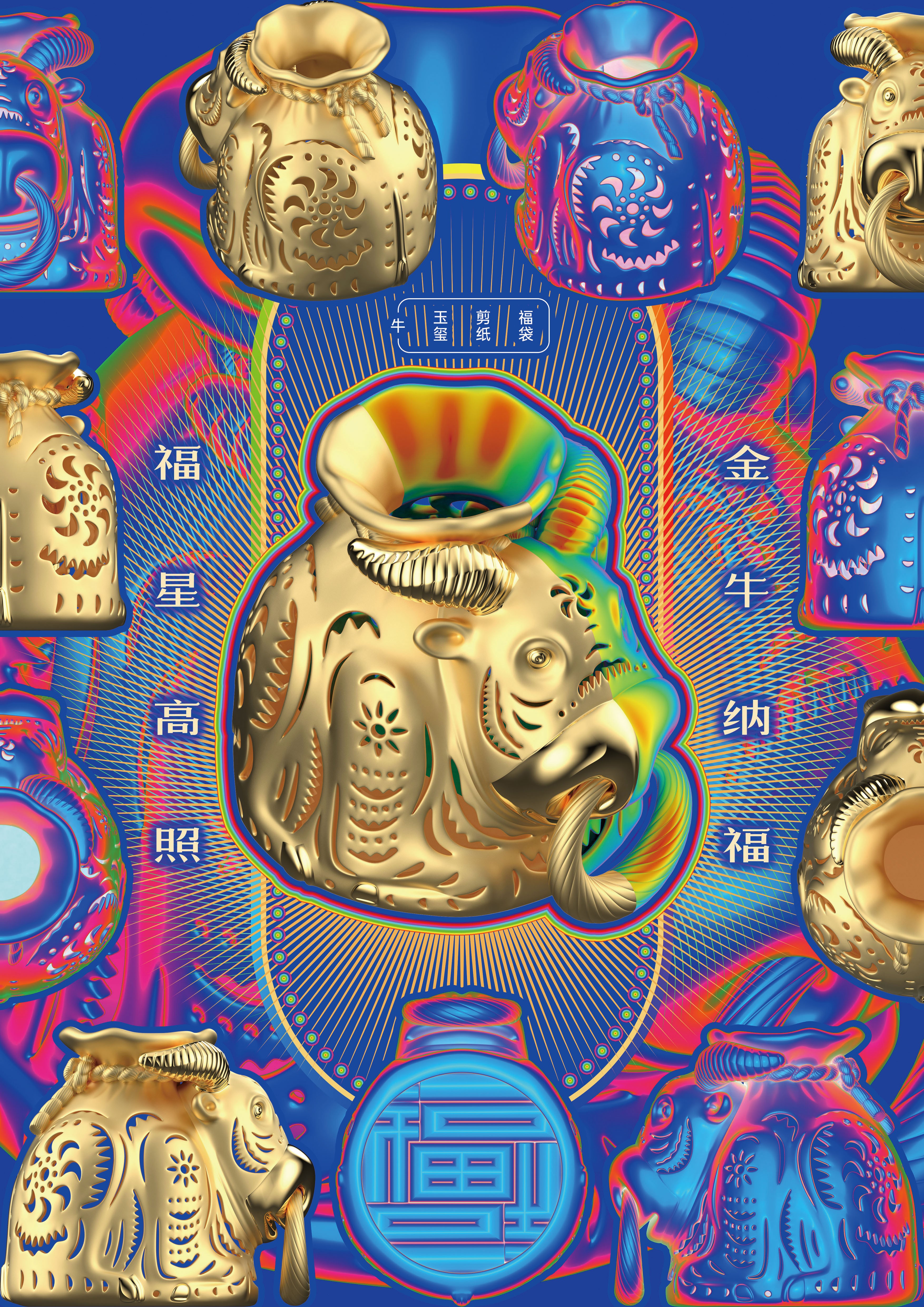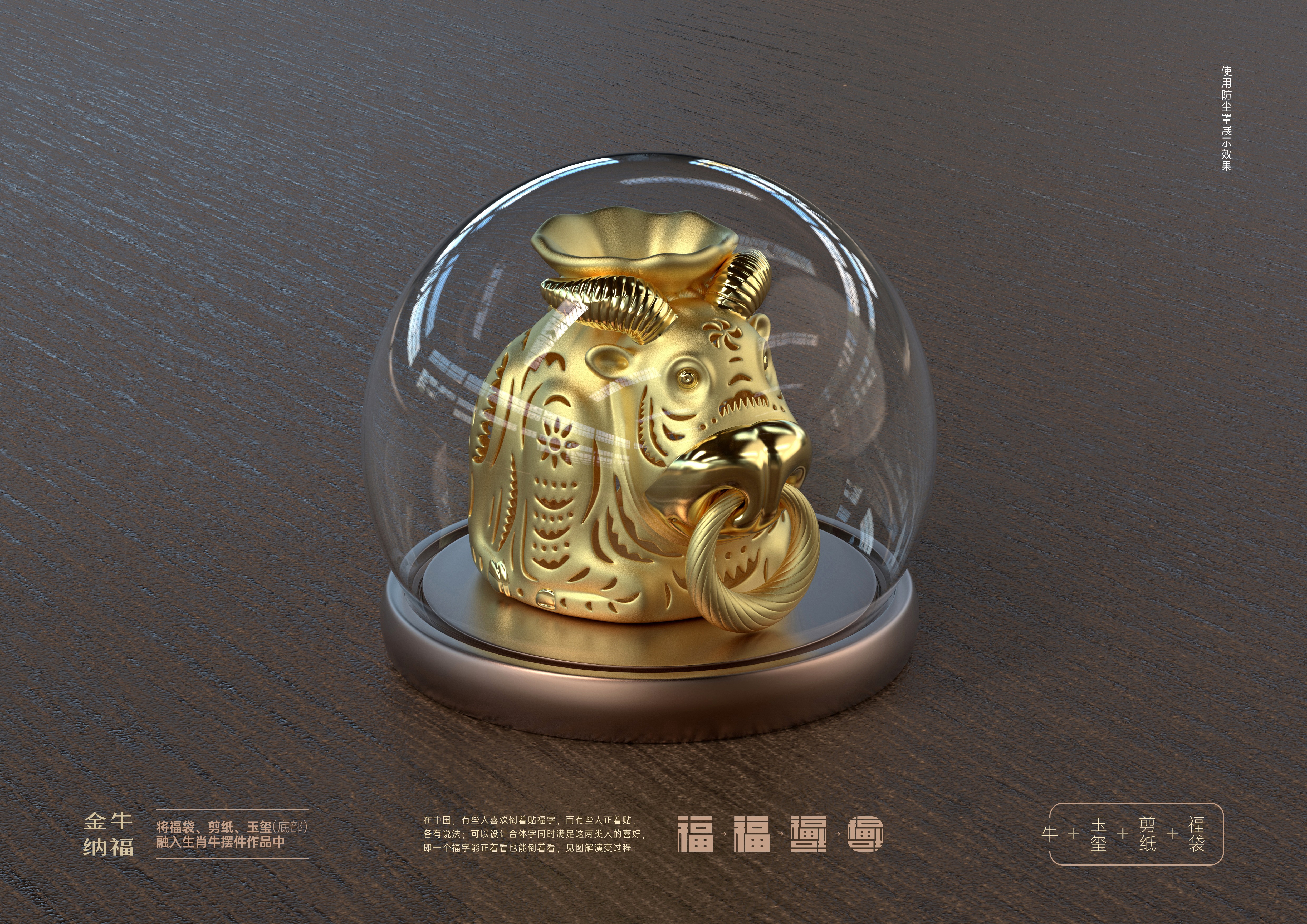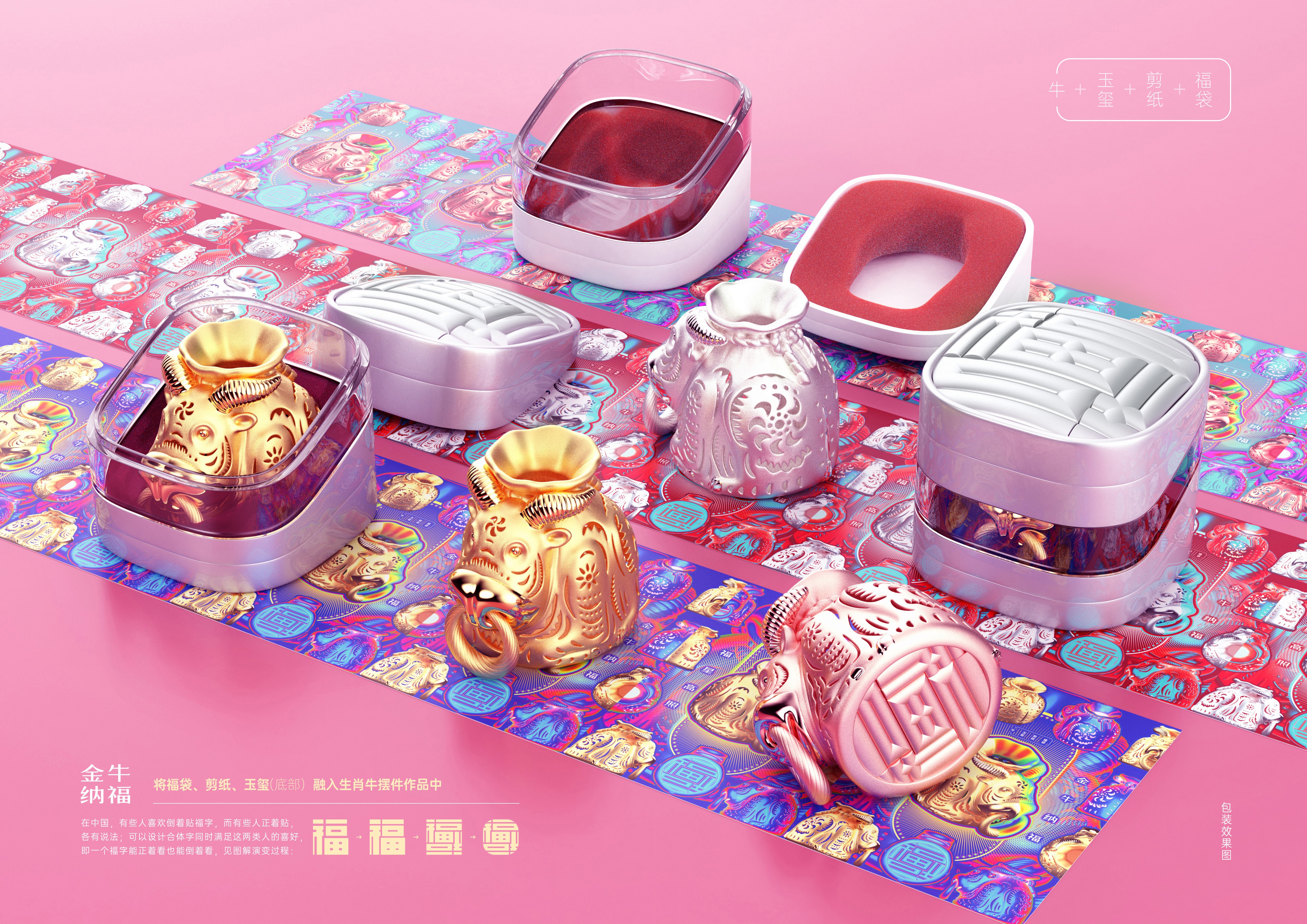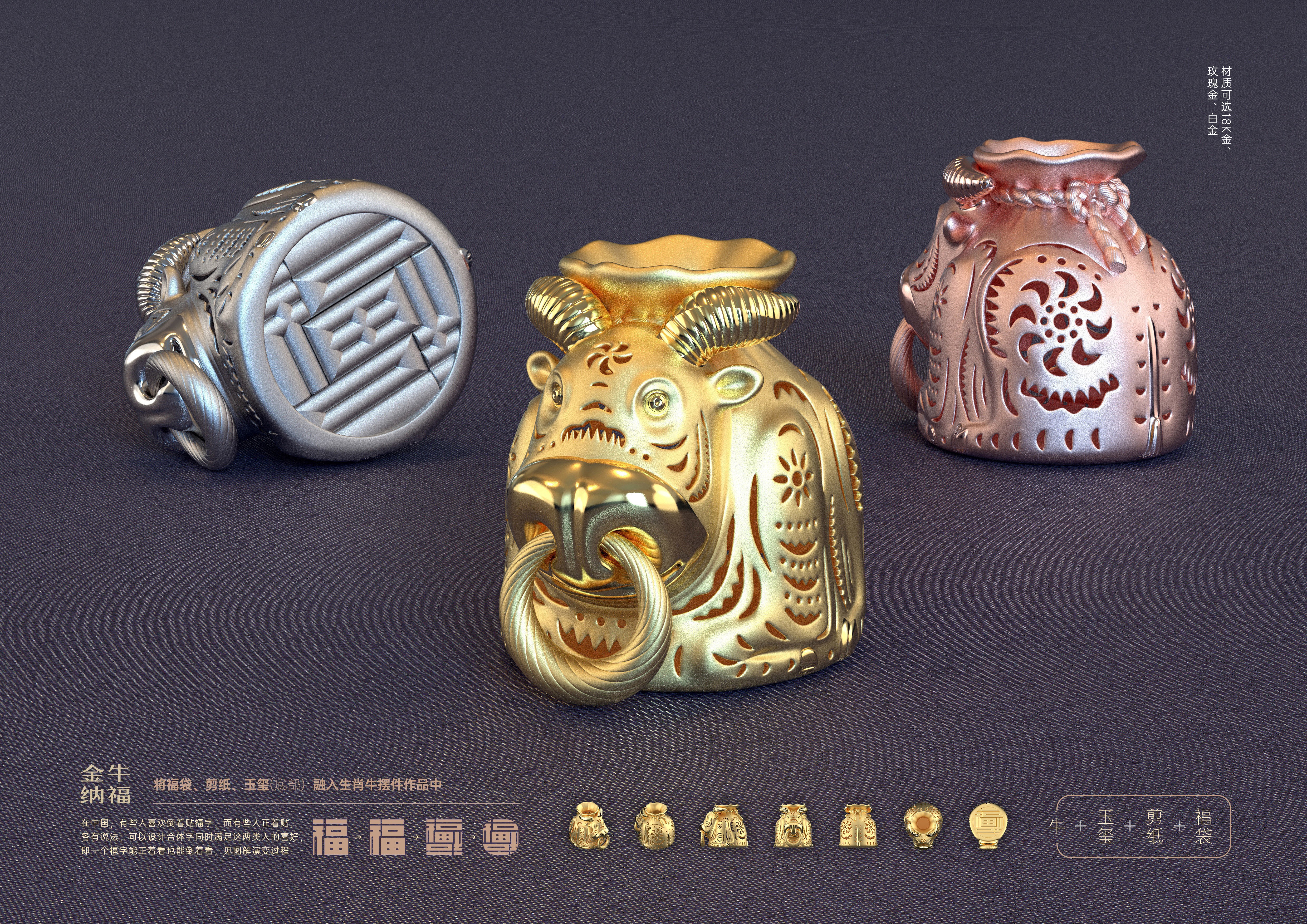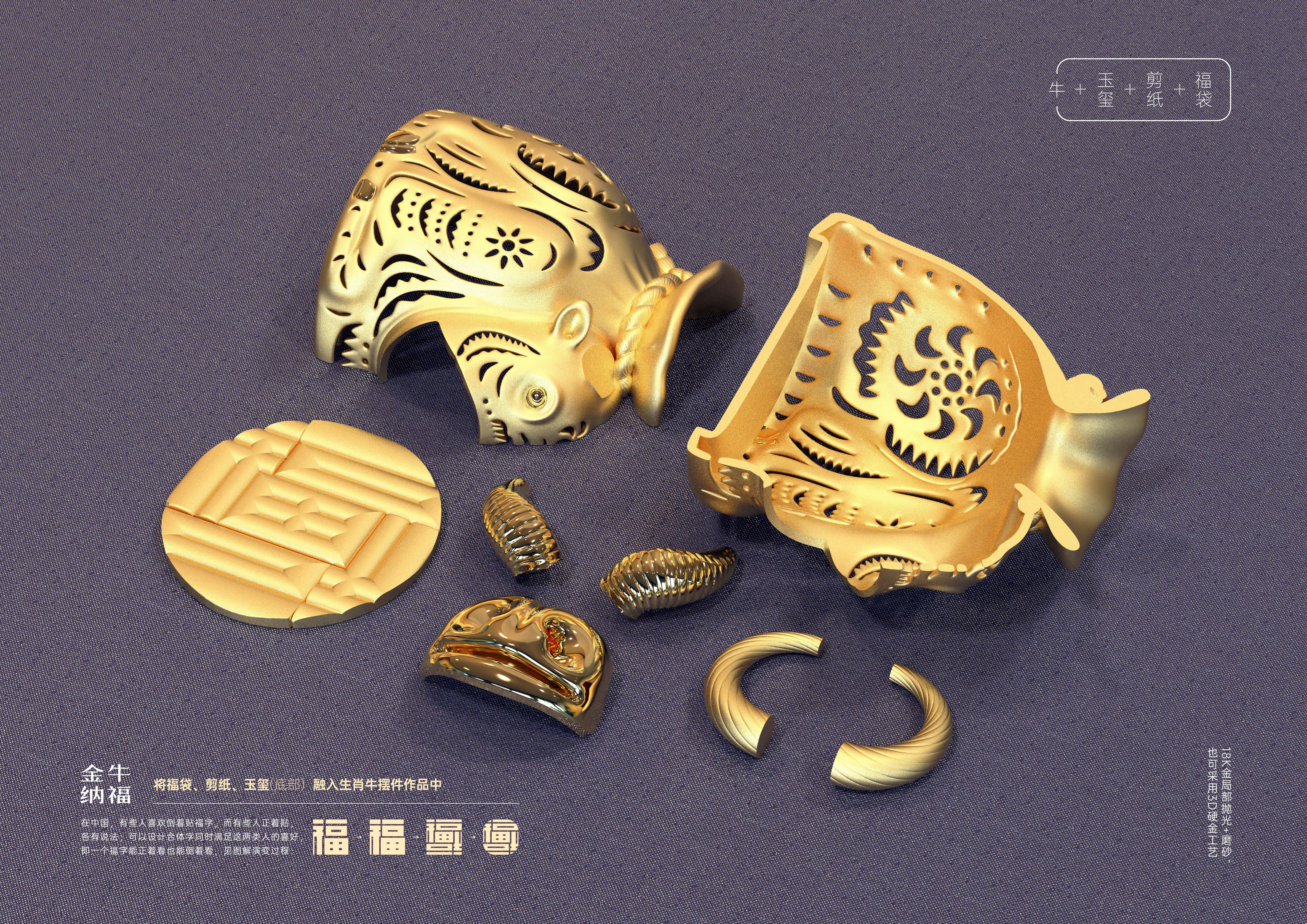 設(shè)計(jì)理念:將福袋、剪紙、玉璽(底部)這些傳統(tǒng)文化元素融入生肖牛擺件作品中。