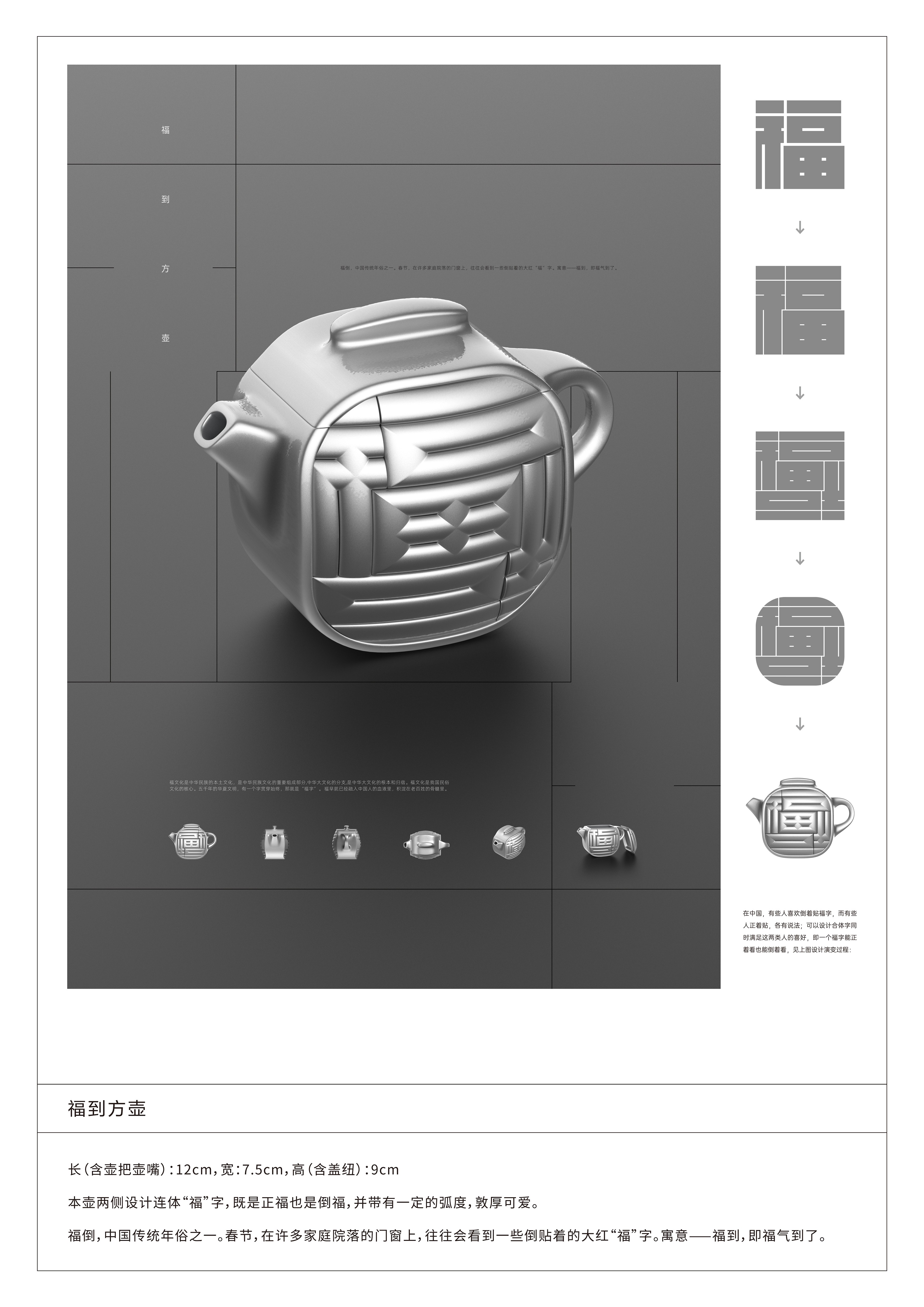 創(chuàng)作思路:本銀壺兩側(cè)設(shè)計(jì)連體“?!弊?,既是正福也是倒福,并帶有一定的弧度,敦厚可愛(ài)
