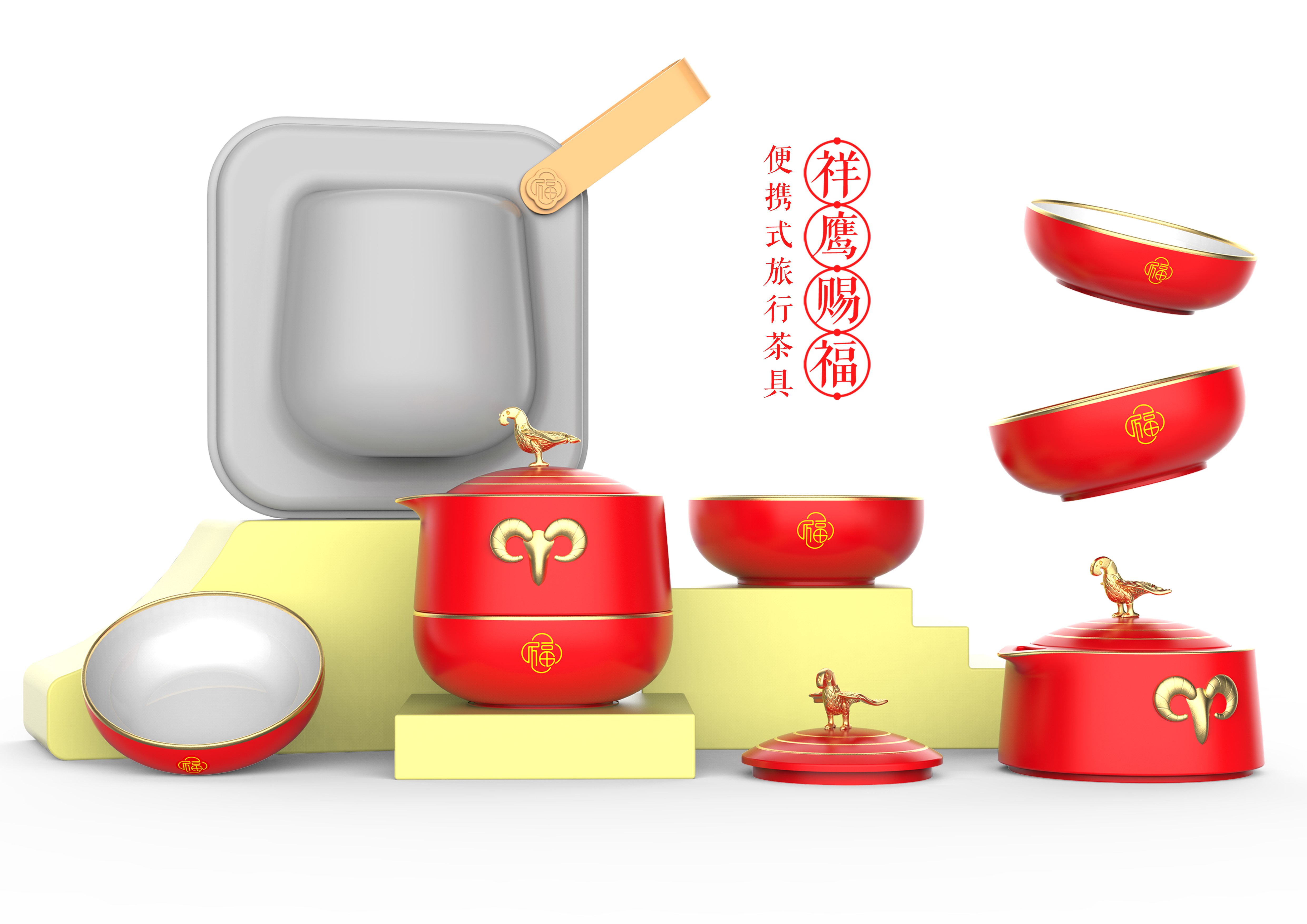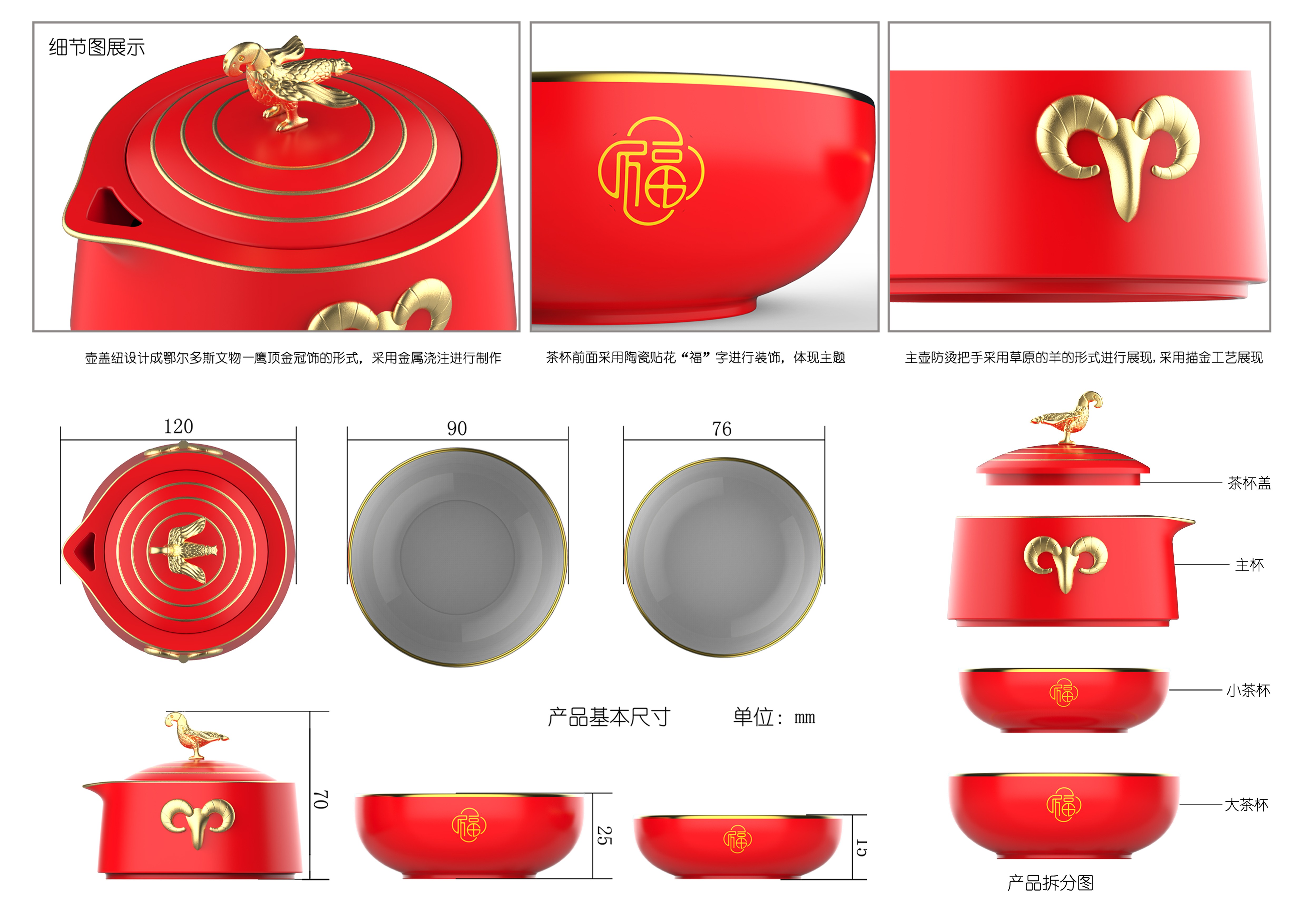 創(chuàng)作思路:這套茶具將鄂爾多斯的文物鷹頂金冠飾、鄂爾多斯草原羊、中國福文化等意象融入其中進行設(shè)計,整套茶具由一壺兩杯組合而成,主壺采用陶瓷材質(zhì)進行制作,主壺的壺蓋紐采用簡化的鷹頂金冠飾造型進行展現(xiàn),材質(zhì)為金屬材質(zhì),中間采用凸出的水波紋描金進行裝飾。主壺兩側(cè)的防燙把手也采用草原羊的形式進行展現(xiàn),采用陶瓷描金工藝進行制作,美觀且實用。裝飾上采用陶瓷貼花和描金進行裝飾,邊緣和壺蓋紐則采用描金。