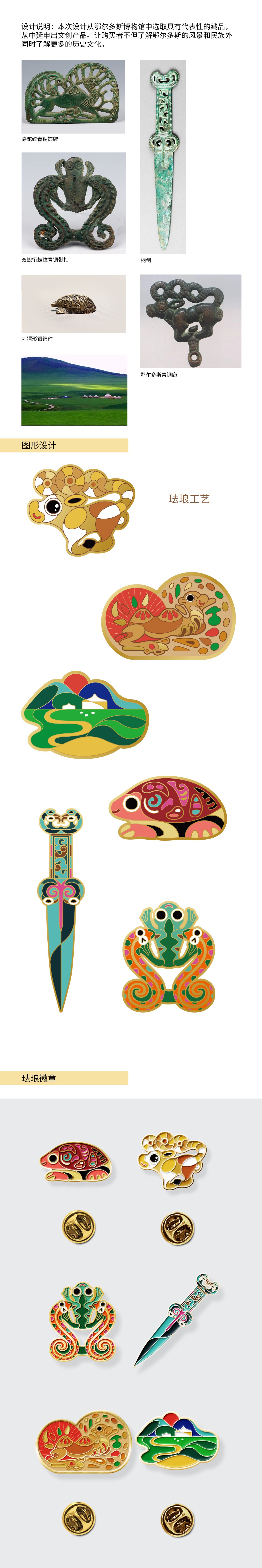 創(chuàng)作思路:將鄂爾多斯的歷史人文等元素結合。從鄂爾多斯博物館中的青銅器如手,創(chuàng)新設計,加入更多新鮮元素,讓現(xiàn)代的人更好的接受。設計時選用琺瑯+皮革的鑰匙扣、金屬鏤空書簽、和琺瑯胸針這幾個方向來展現(xiàn)。在日常使用時十分實用。自用和送禮都非常有意義。