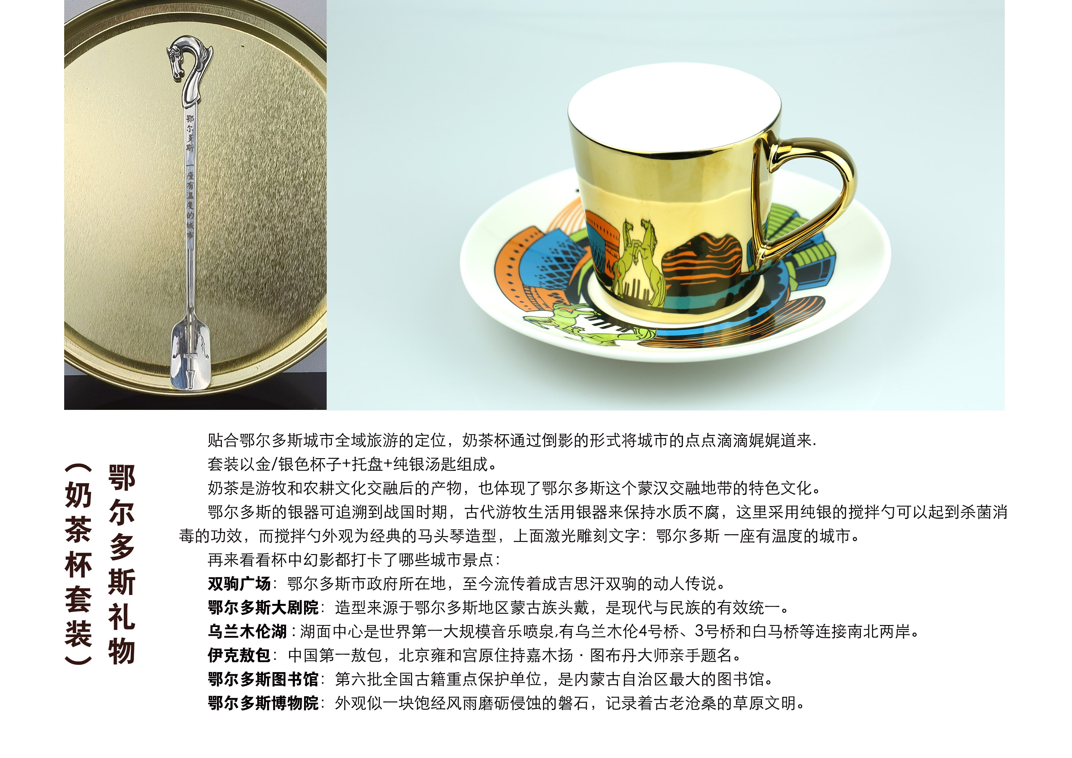 設(shè)計理念:采用純銀的攪拌勺可以起到殺菌消毒的功效,而攪拌勺外觀為經(jīng)典的馬頭琴造型,上面激光雕刻文字:鄂爾多斯 一座有溫度的城市。奶茶杯通過倒影的形式將城市的點點滴滴娓娓道來.