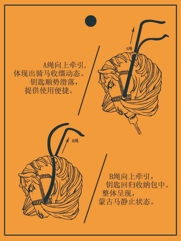 設(shè)計理念:將騎馬收韁的動態(tài)應(yīng)用于產(chǎn)品之中,除收納功能以外,在一拉一收中體會騎馬的樂趣。輸出蒙古馬精神,弘揚地域文化。