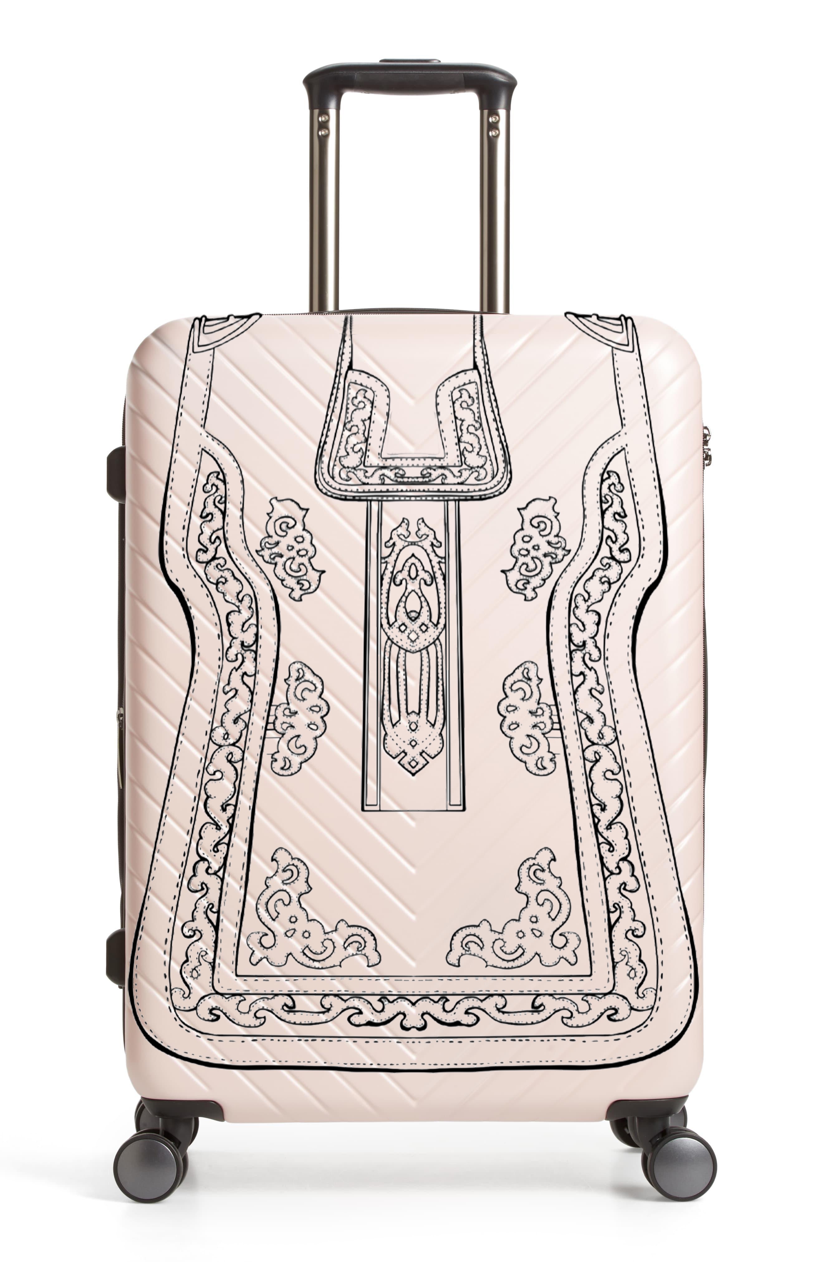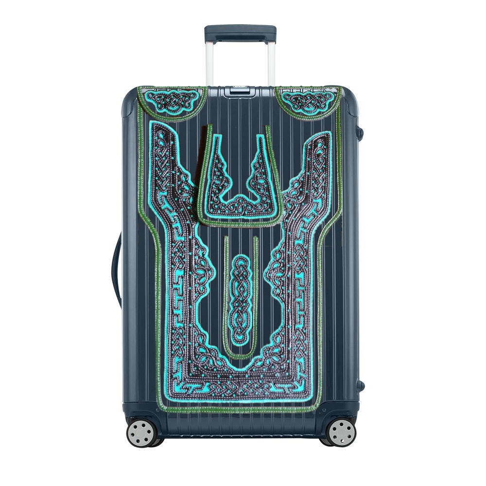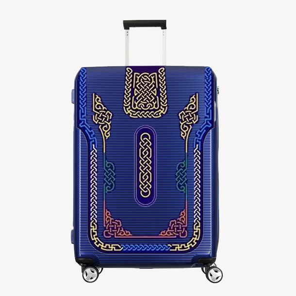 創(chuàng)作思路:作為旅游城市的鄂爾多斯,機場車站隨處可見坐在行李箱上休息的人們,雖場景與時代有變,行李箱與鄂爾多斯馬鞍的功能卻有某種程度的相似,都可作為出行、騎坐的用具,因此,設計選取鄂爾多斯馬鞍中鞍韂形態(tài)及其圖案元素置于行李箱保護套的外觀設計上。