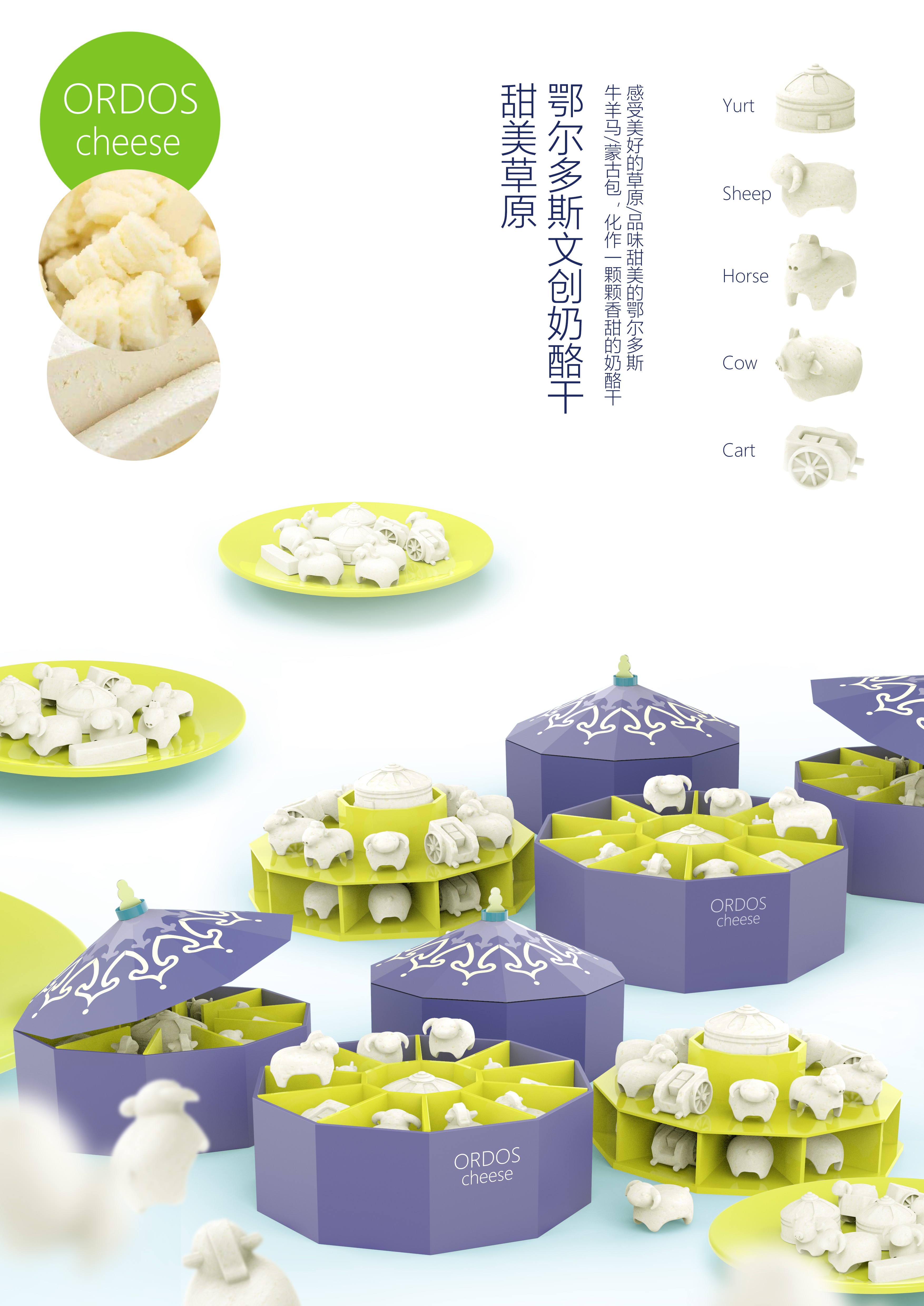 設計理念:用蒙古包元素的包裝來裝原創(chuàng)造型的奶酪干,把牛羊馬車等造型做成小巧的奶酪干,讓草原特色美食變得有趣。