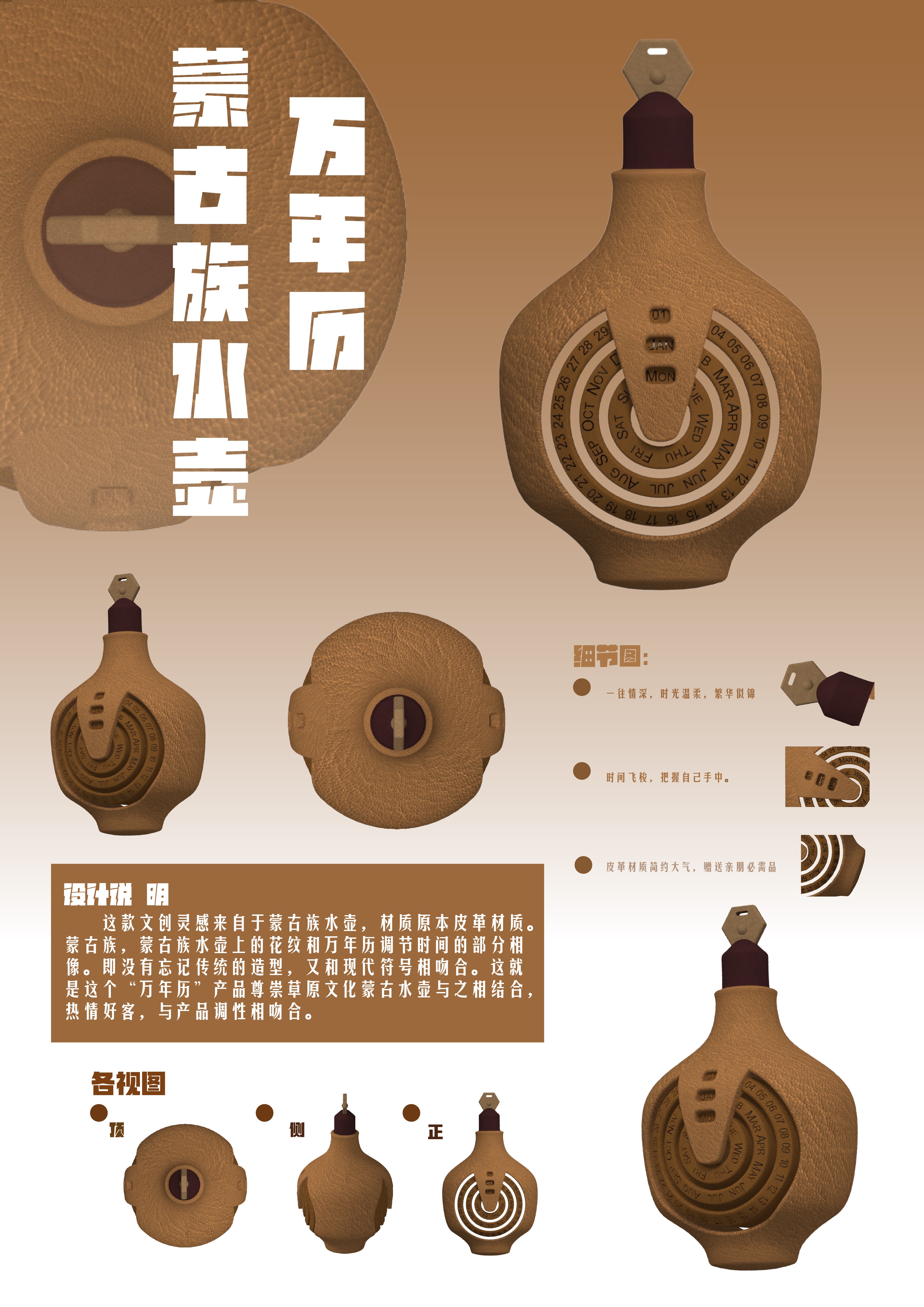 創(chuàng)作思路:這款文創(chuàng)靈感來自于蒙古族水壺,材質(zhì)原本皮革材質(zhì)。蒙古族,蒙古族水壺上的花紋和萬年歷調(diào)節(jié)時間的部分相