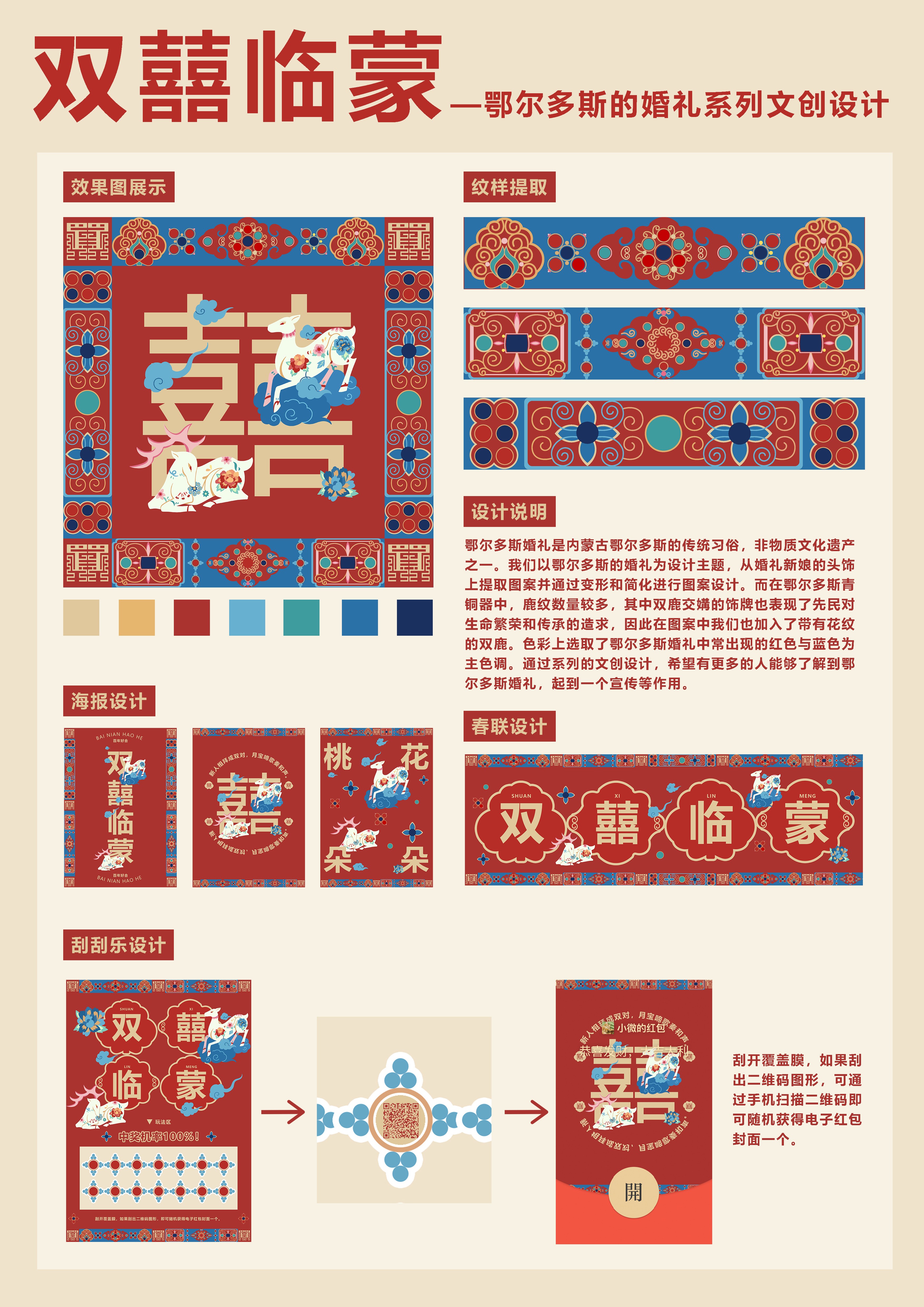 設(shè)計(jì)理念:在鄂爾多斯青銅器中,雙鹿交媾的飾牌表現(xiàn)了先民對(duì)生命繁榮和傳承的造求,在圖案中我們也加入了帶有花紋的雙鹿;色彩上選取了鄂爾多斯婚禮中常出現(xiàn)的紅色與藍(lán)色為主色調(diào),希望以此為鄂爾多斯的文化進(jìn)行宣傳。