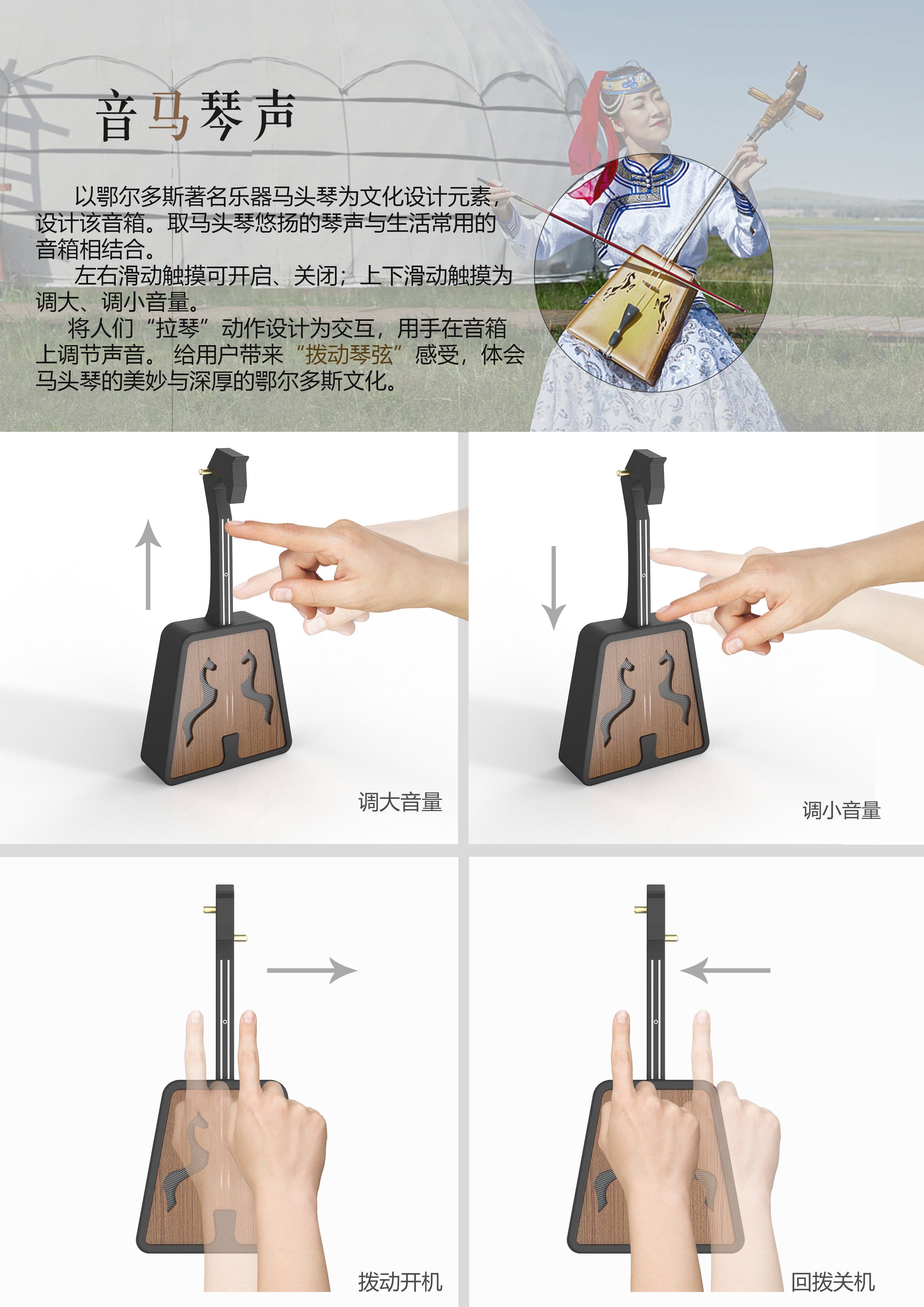 設(shè)計理念:運(yùn)用通感設(shè)計,將“拉琴”與“撥動琴弦”與調(diào)節(jié)音箱聲音的感受結(jié)合,讓人們通過動手,感受馬頭琴的美妙與鄂爾多斯市馬頭琴音樂文化,并進(jìn)行傳播。