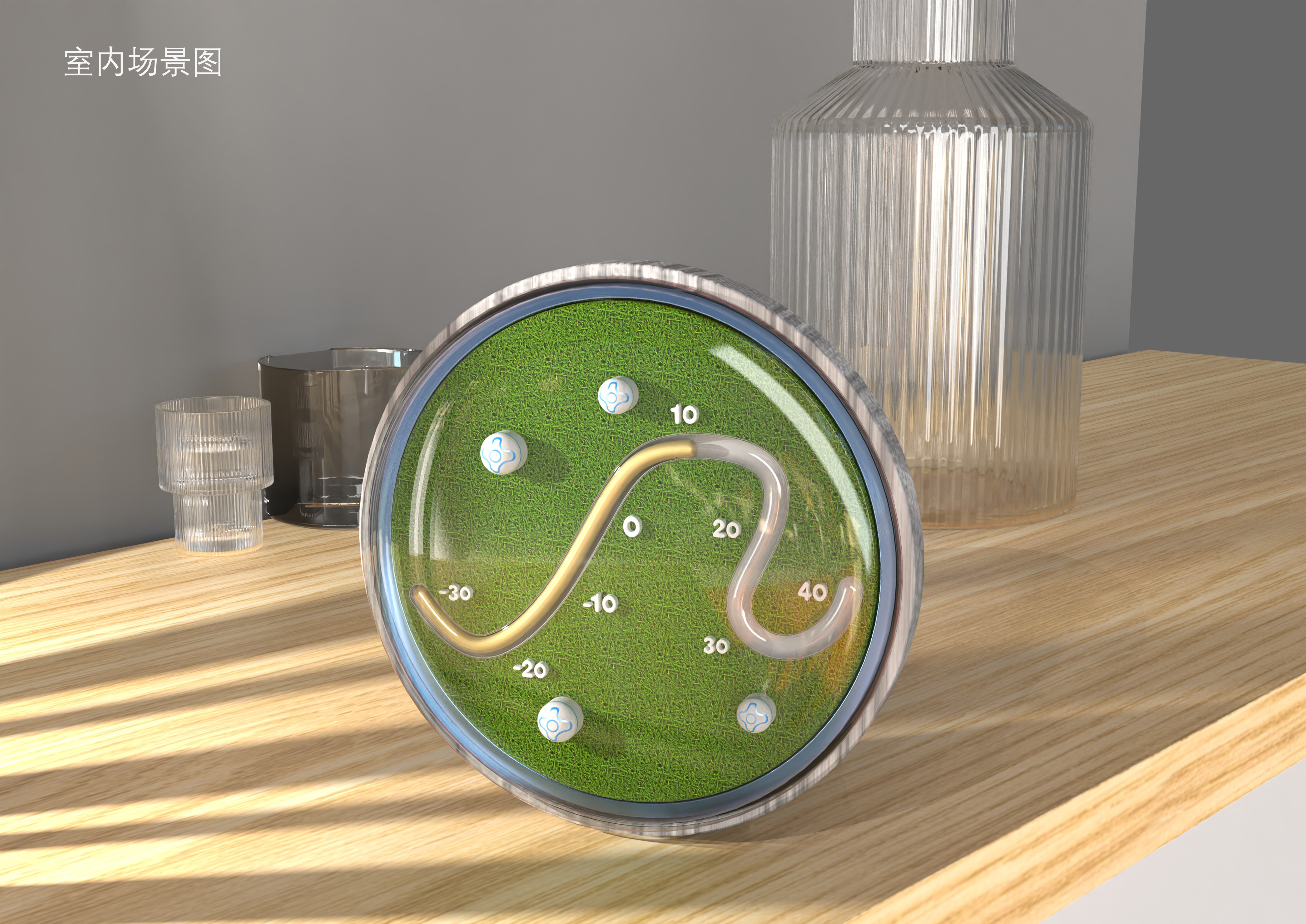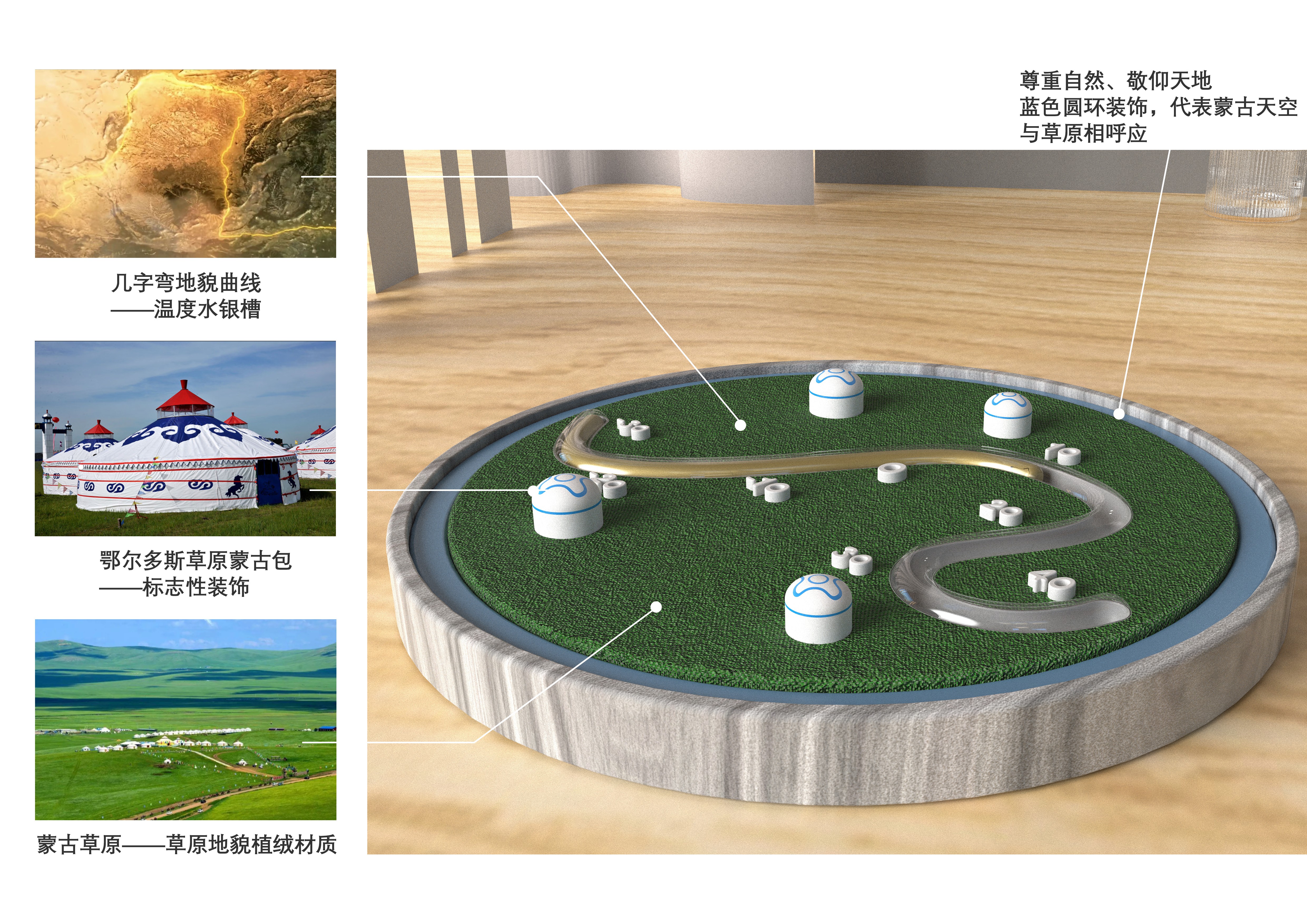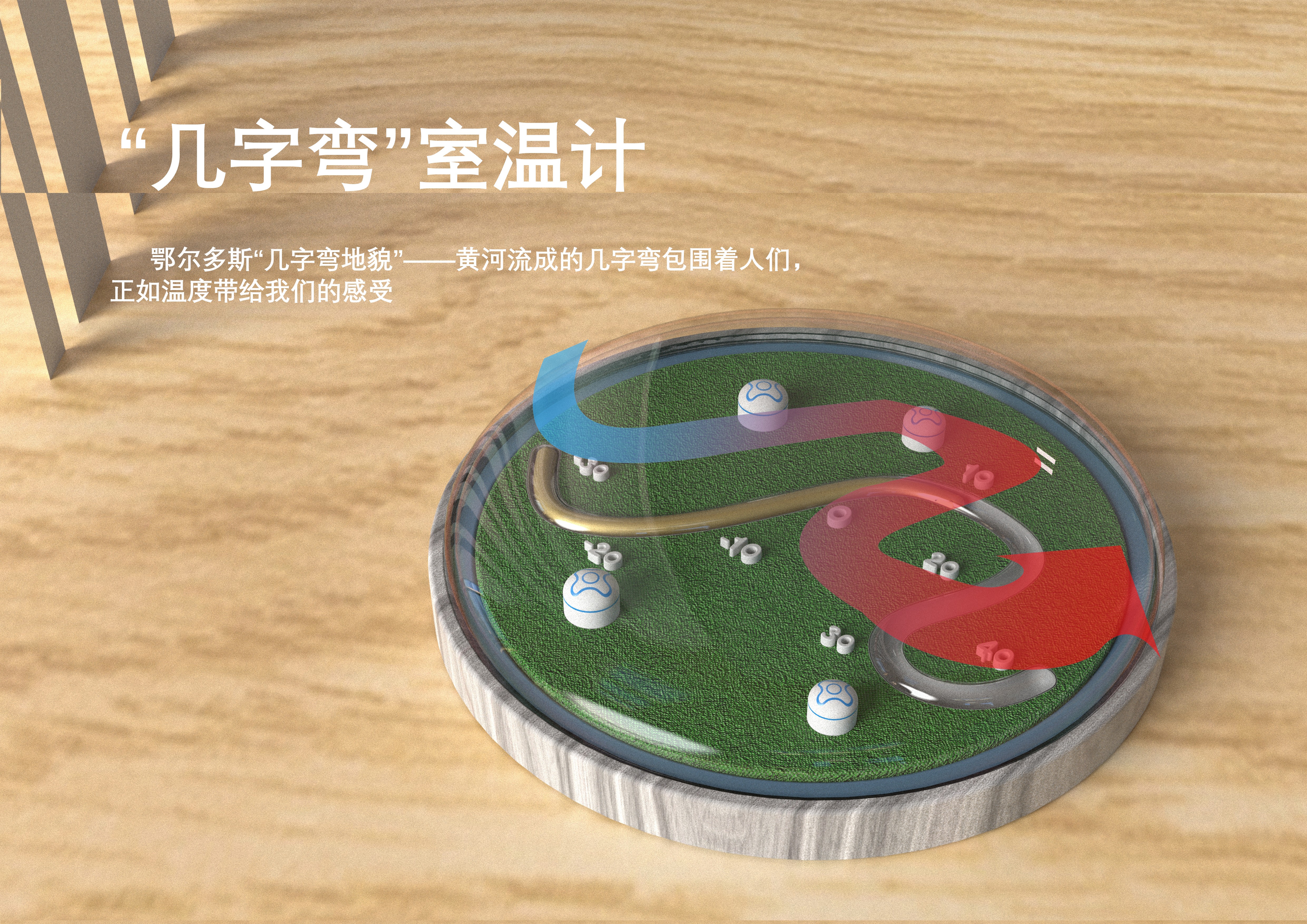提取幾字彎的輪廓線條進行簡化概括,設計為室溫計的水銀槽,將水銀因為溫度變化熱脹冷縮原理與黃河水流出的感覺進行通感結(jié)合。周邊圍繞蒙古包與草原。整體造型還原了鄂爾多斯草原的俯視圖,仿佛將一個迷你的蒙古草原帶回家。
