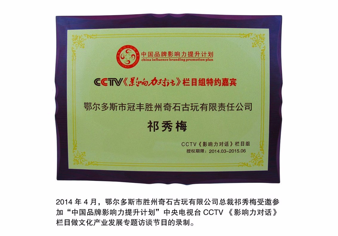 2014年4月,勝州古玩城總裁祁秀梅受邀參加“中國(guó)品牌影響力提升計(jì)劃”CCTV 《影響力對(duì)話》欄目,關(guān)于文化產(chǎn)業(yè)專題訪談節(jié)目的錄制。