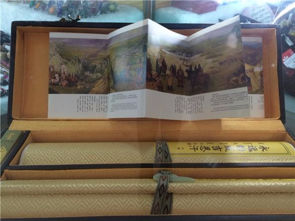 《永遠(yuǎn)的成吉思汗》卷軸分上下兩卷,每卷長達(dá)37米,每套定價1560元,《蒙古歷史長卷》小畫冊短小精悍,當(dāng)前每冊定價38元,藝術(shù)地再現(xiàn)了1162年成吉思汗誕生至1368年北元建立的206年的重大歷史史實,備受中外游客喜愛。