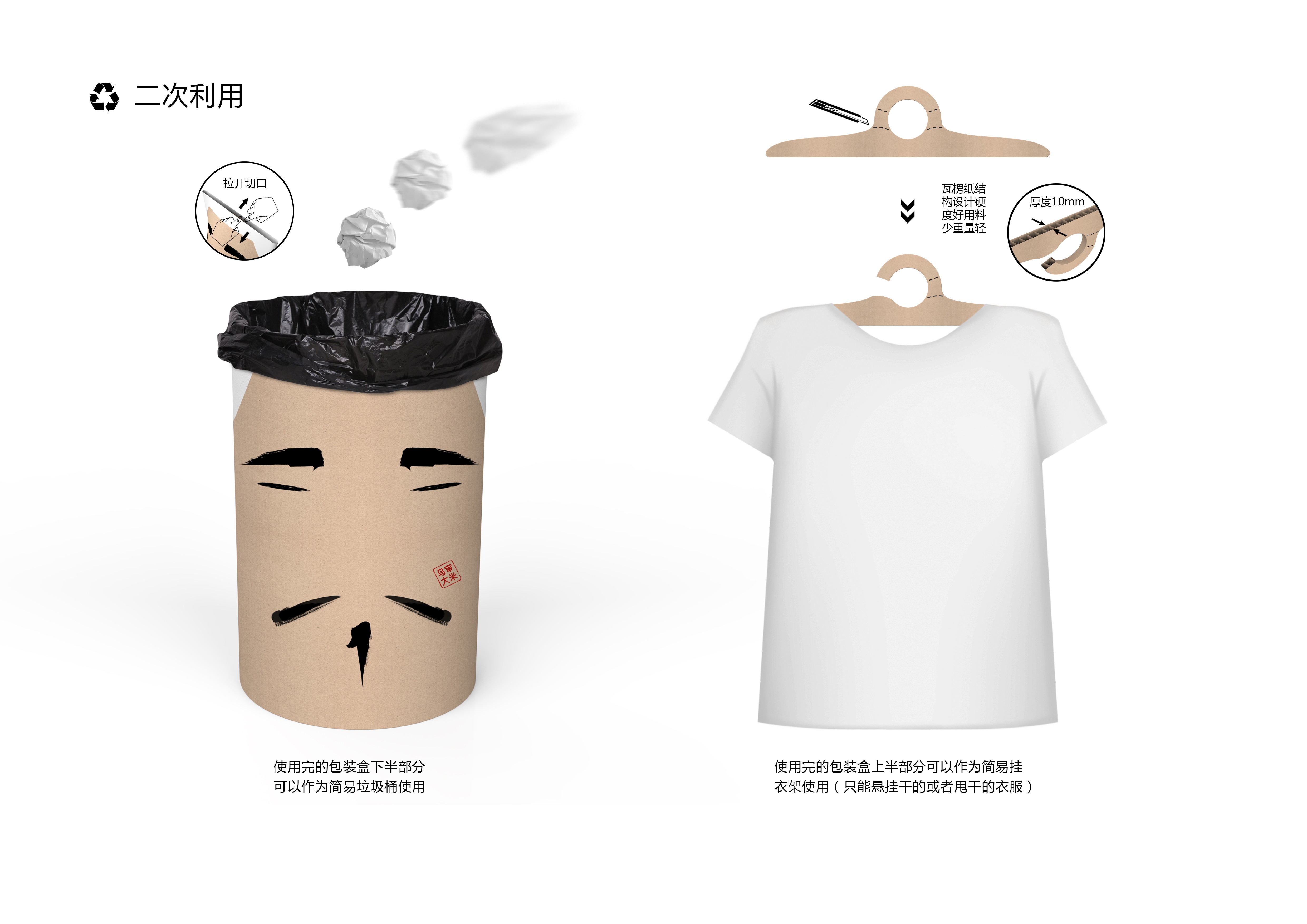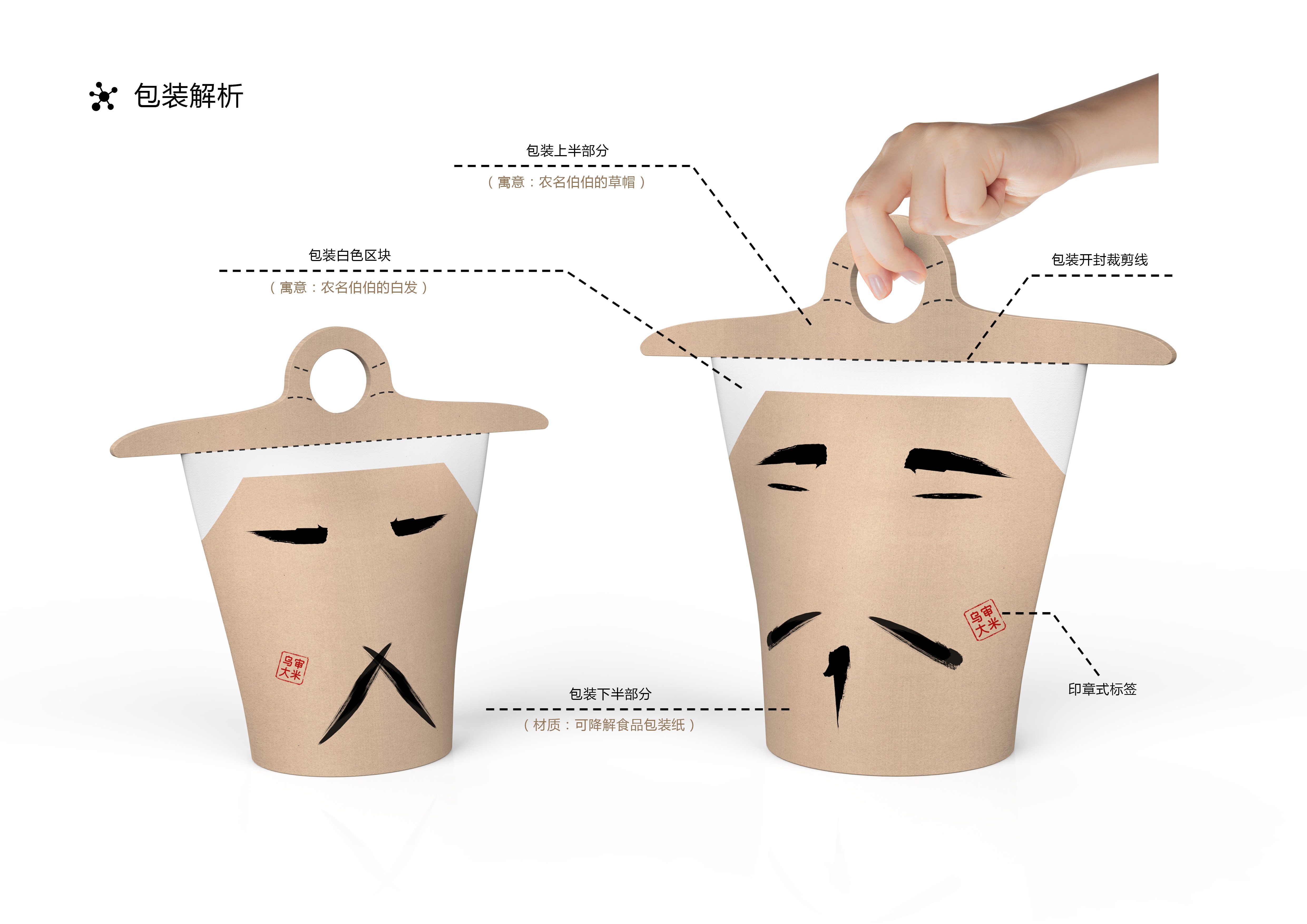 這款烏審大米的包裝設(shè)計(jì)遵循,實(shí)用、簡(jiǎn)單、趣味以及環(huán)??沙掷m(xù)為定位,包裝整體摒棄傳統(tǒng)大米包裝的產(chǎn)品信息繁雜性,通過(guò)簡(jiǎn)畫的描述,趣味化的表現(xiàn)出培育種植大米的農(nóng)民伯伯精神面貌,傳達(dá)給人們?cè)谙碛么竺椎倪^(guò)程中對(duì)于辛勤農(nóng)民伯伯的勞動(dòng)付出應(yīng)存敬仰之心,且做到節(jié)約糧食的行動(dòng)表現(xiàn)。另外,這款大米包裝設(shè)計(jì)在除含有基本的容器作用之外,使用完的包裝經(jīng)過(guò)簡(jiǎn)單的裁剪還能作為簡(jiǎn)易的衣架和垃圾桶來(lái)使用。