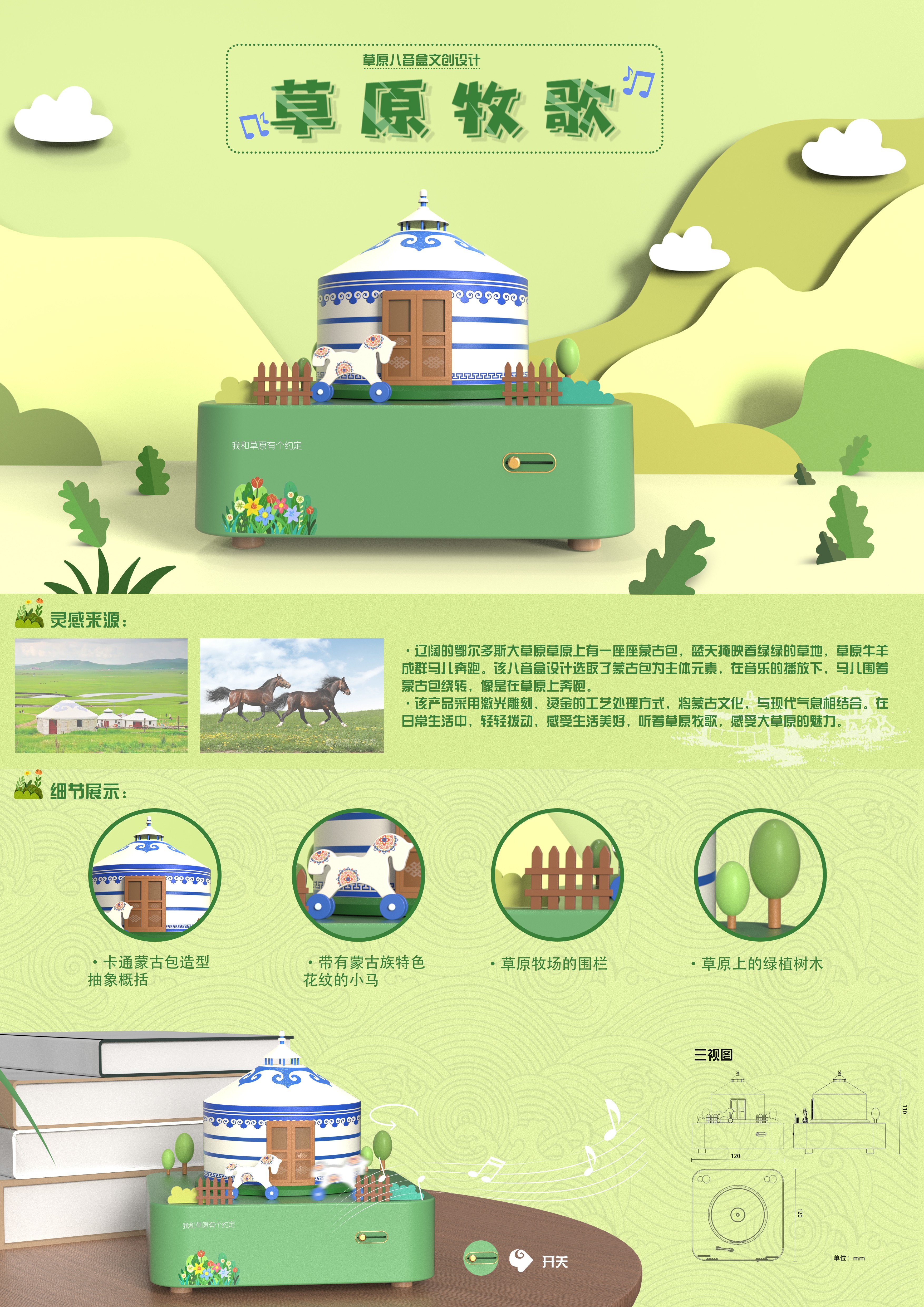 創(chuàng)作思路:遼闊的鄂爾多斯大草原草原上有一座座蒙古包,藍(lán)天掩映著綠綠的草地,草原牛羊成群馬兒奔跑。該八音盒設(shè)計(jì)選取了蒙古包為主體元素,在音樂(lè)的播放下,馬兒圍著蒙古包繞轉(zhuǎn),像是在草原上奔跑。