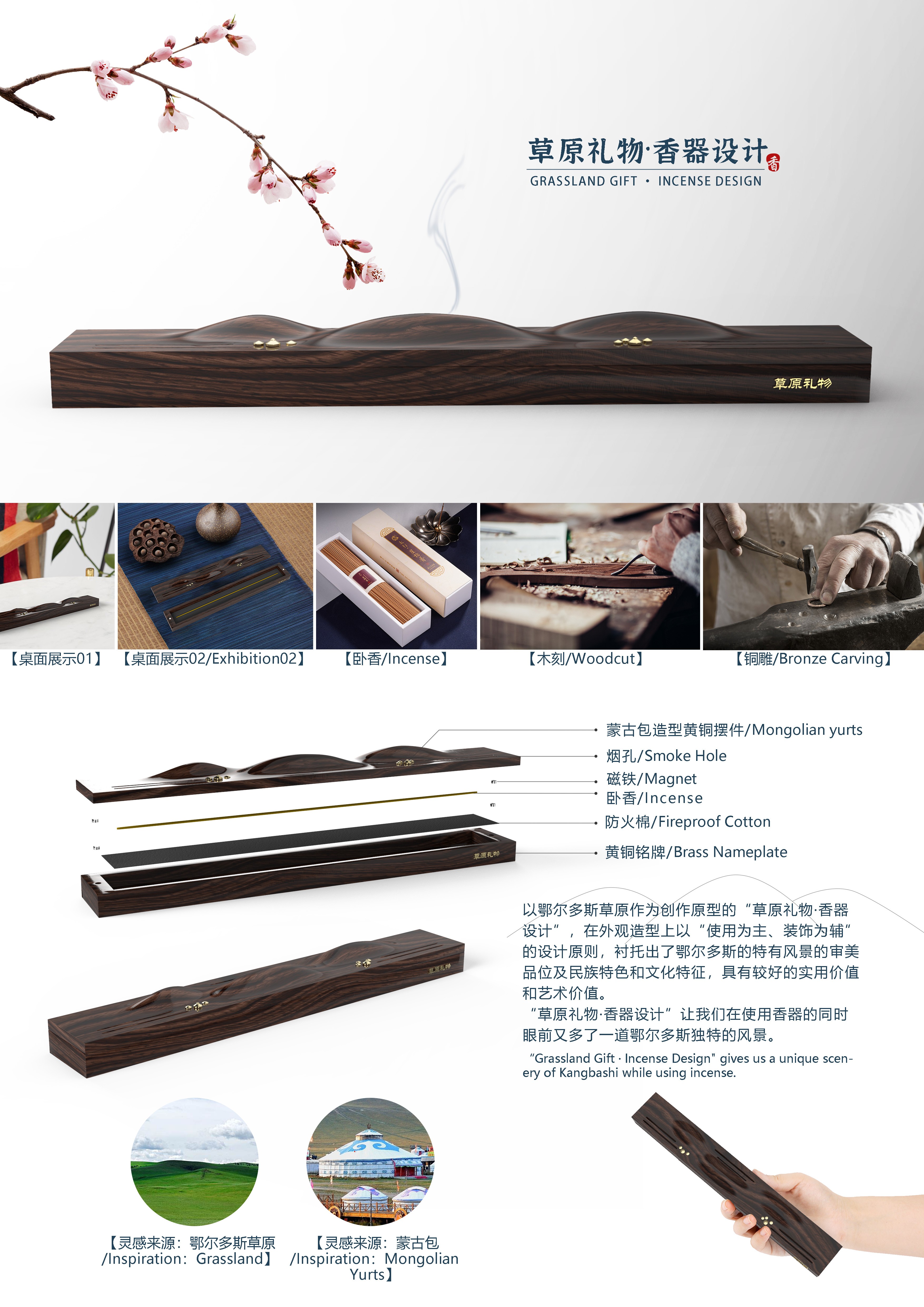 以鄂爾多斯草原作為創(chuàng)作原型的“草原禮物·香器設(shè)計(jì)”,在外觀造型上以“使用為主、裝飾為輔”的設(shè)計(jì)原則,襯托出了鄂爾多斯的特有風(fēng)景的審美品位及民族特色和文化特征,具有較好的實(shí)用價(jià)值和藝術(shù)價(jià)值。