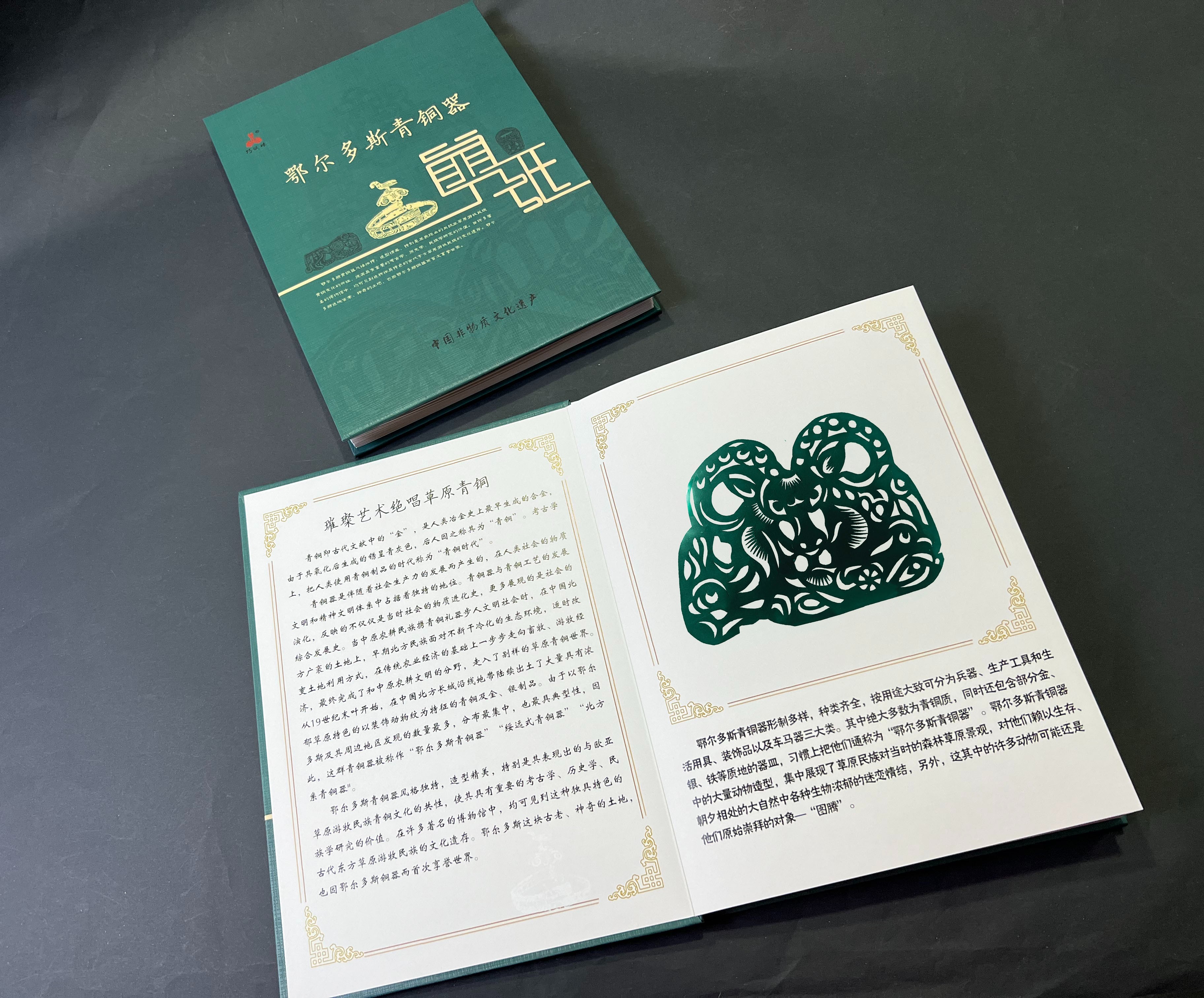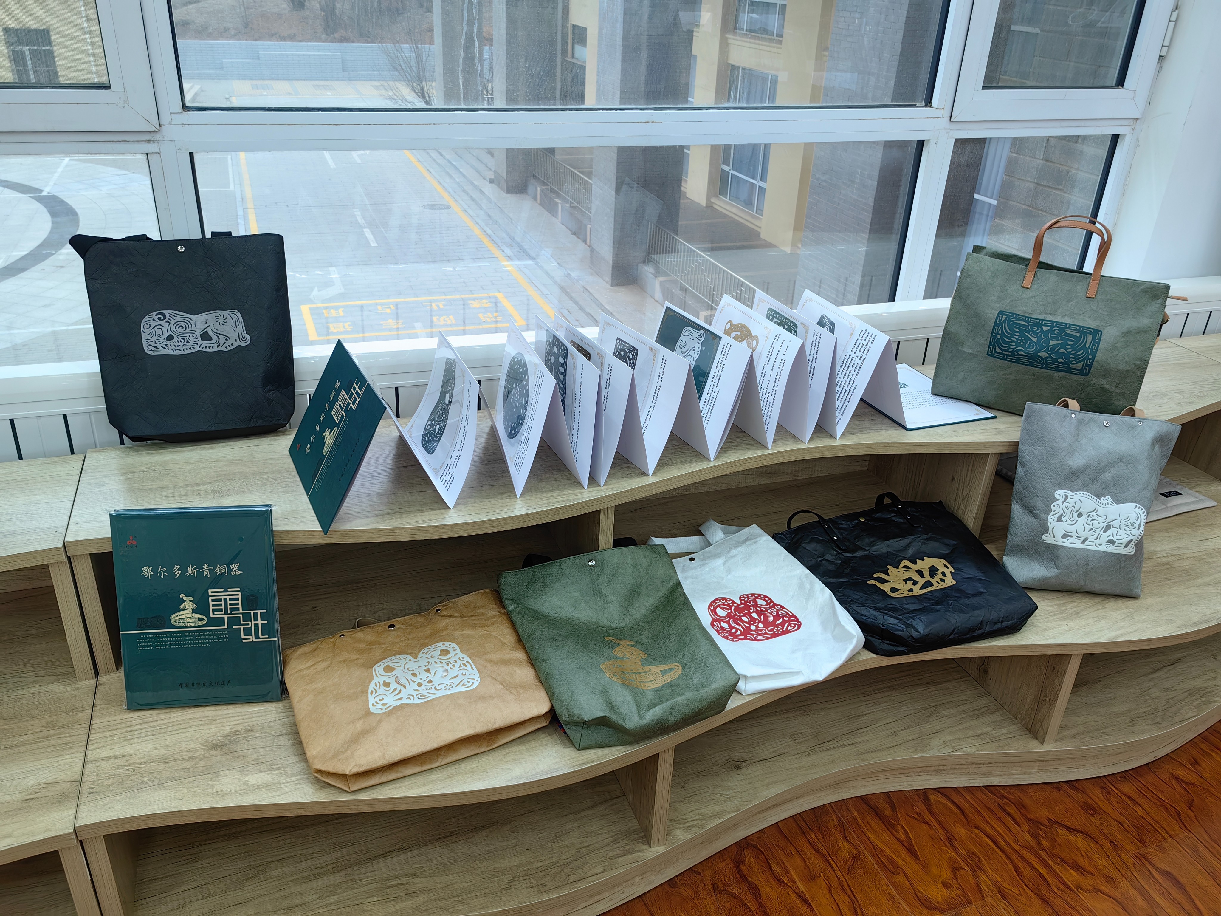 創(chuàng)作思路:鄂爾多斯青銅器其文化內(nèi)涵豐富、造型生動(dòng)、具有很高的觀賞價(jià)值和藝術(shù)價(jià)值,剪紙冊采用風(fēng)琴頁設(shè)計(jì),剪紙可以單獨(dú)展示也可以長卷展示。里面精選具有代表性的20張青銅器剪紙作品。包包是采用俗稱“會(huì)呼吸的紙”杜邦紙制作而成,上面飾以各種青銅剪紙紋樣,柔韌抗撕裂,防水、防曬,好清潔,環(huán)保 可降解。相比起普通純色包包更耐看和精致。