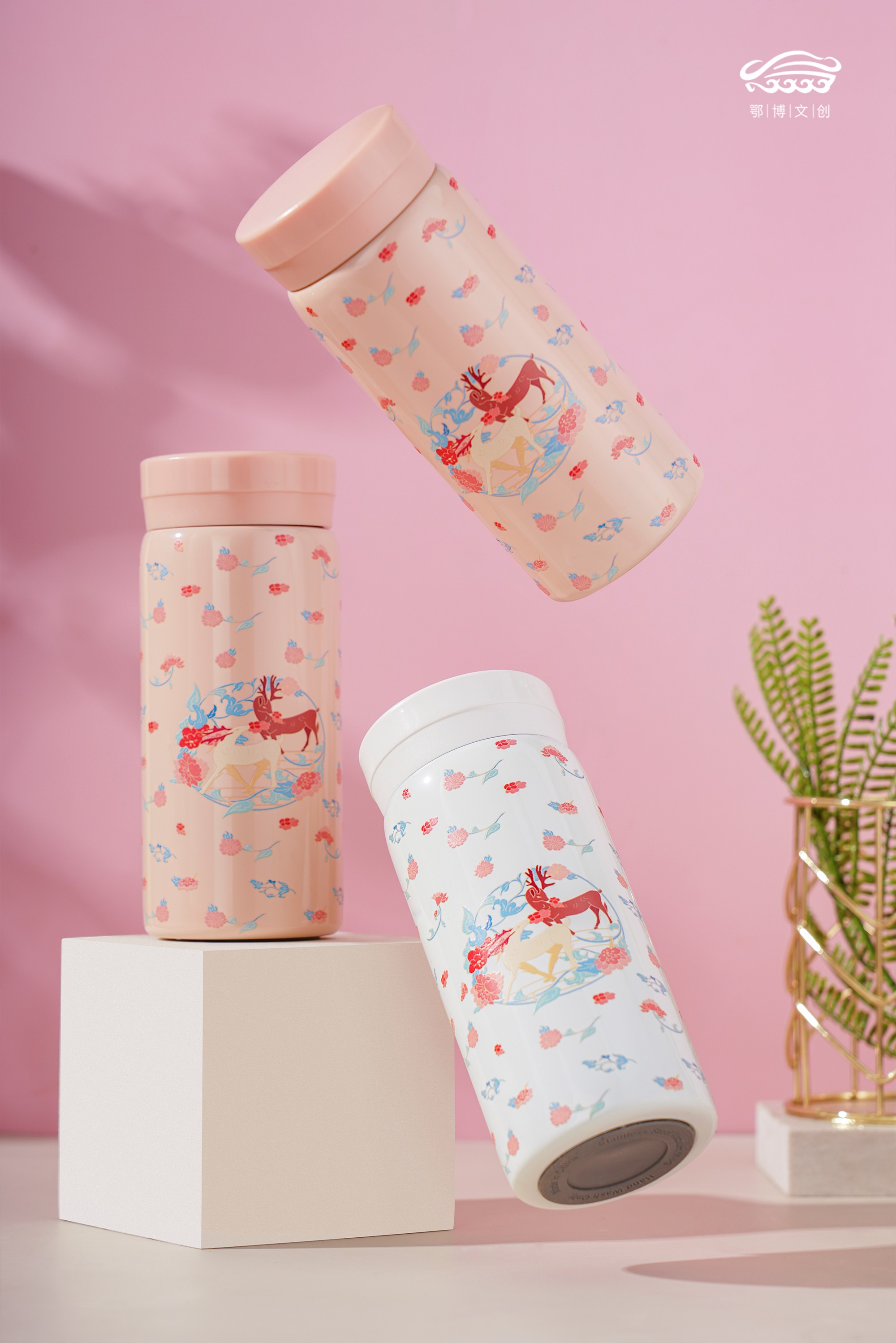 創(chuàng)作思路:圖案來源于鄂爾多斯市博物院館藏文物,西夏牡丹紋褐釉剔花瓶,提取文物中回首鹿(寓意福祿)、牡丹圖案紋飾(寓意富貴),結(jié)合馬蘭花等元素,繪制原創(chuàng)主題插畫,衍生為“福鹿生花”系列產(chǎn)品。