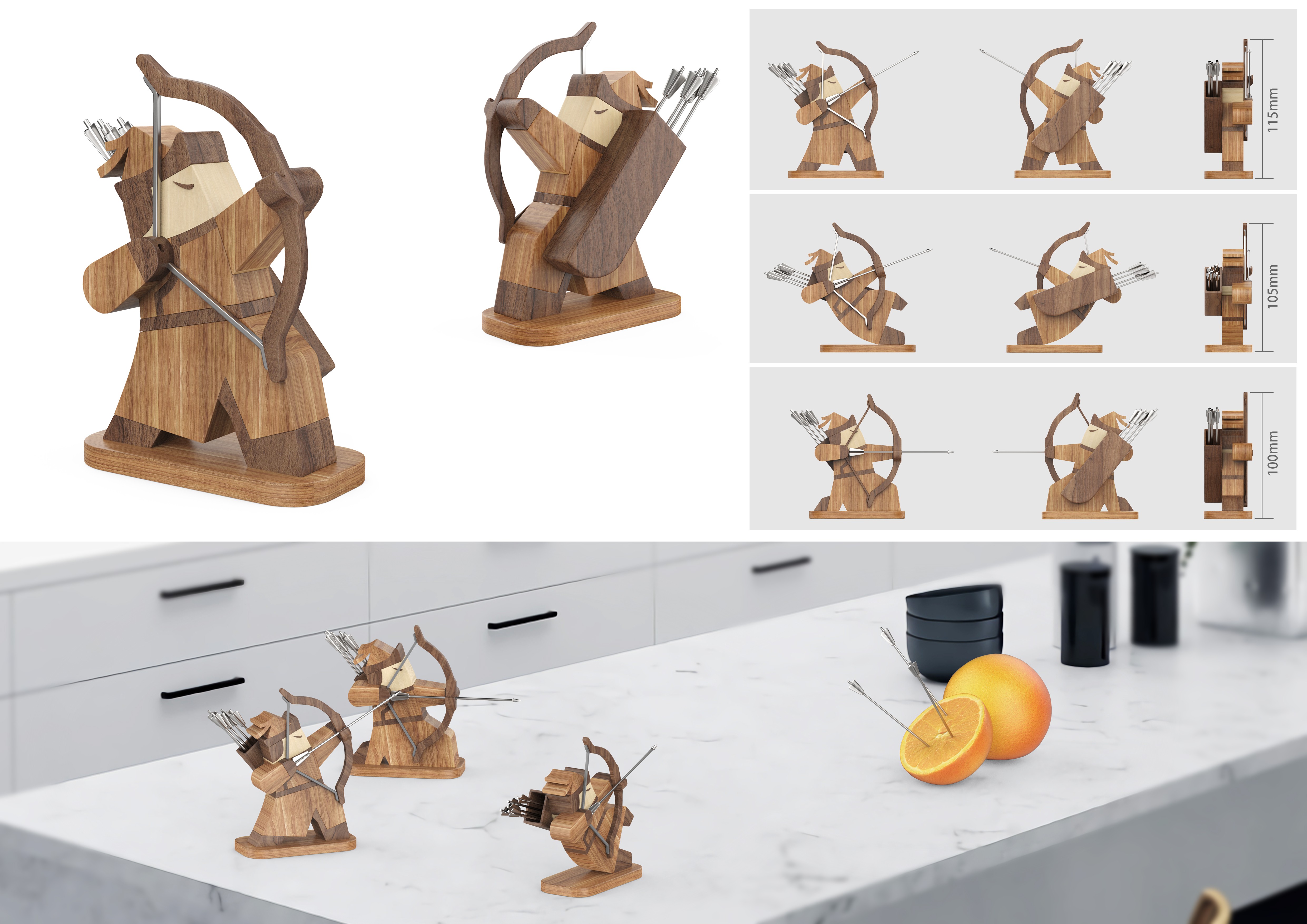 創(chuàng)作思路:這款文創(chuàng)設(shè)計是以蒙古男子三技之一的“射箭”為基礎(chǔ)而創(chuàng)作的,首先對蒙古人物形象特征進行提煉簡化,凸顯其民族特征,并且使之更易生產(chǎn)加工,弓箭的箭矢部分改設(shè)成水果簽,箭囊改設(shè)成果簽盒