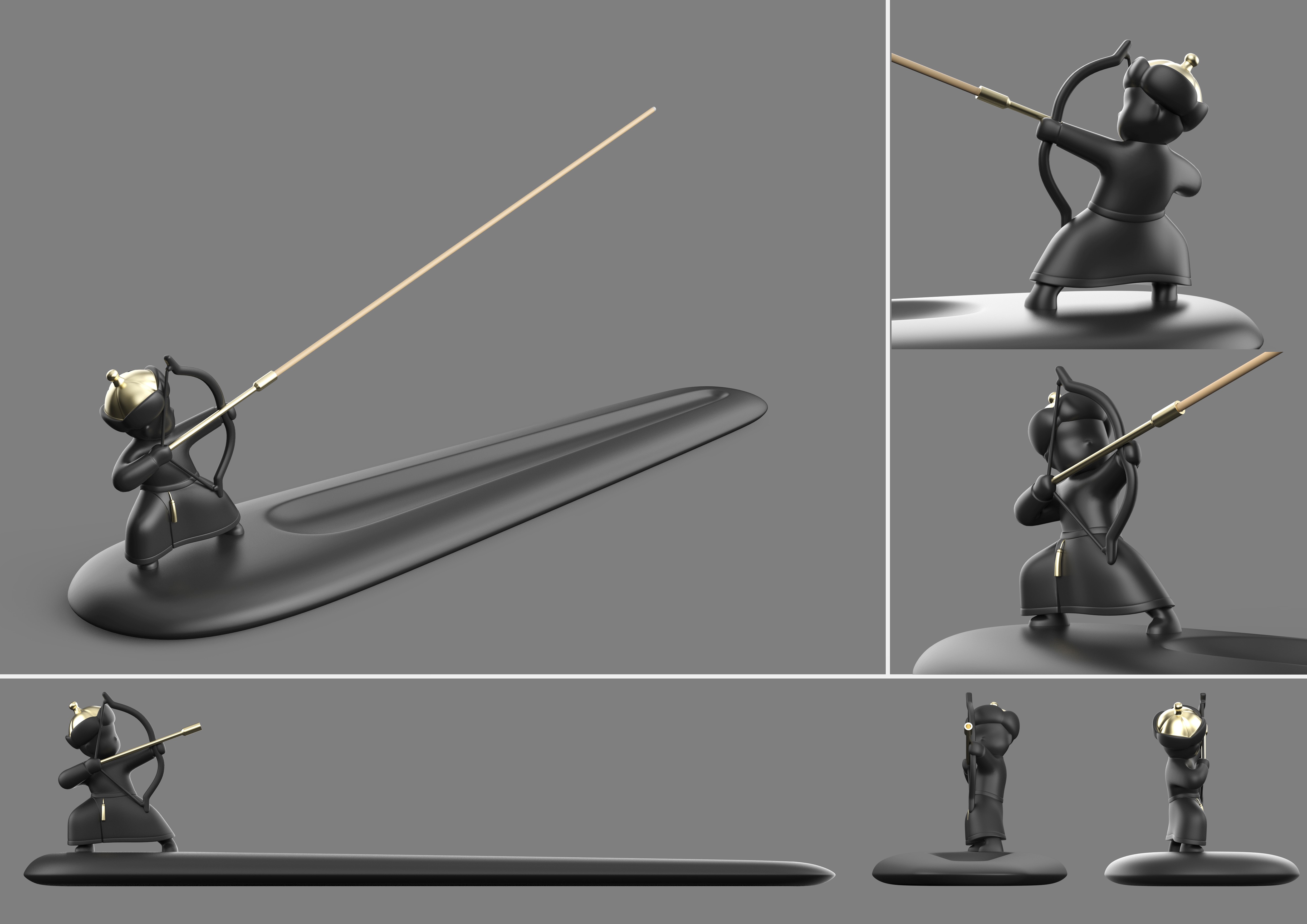 設(shè)計(jì)理念:利用香桿的造型作為箭矢的延伸,完美的契合了人物射箭的姿勢,使整個(gè)產(chǎn)品生動(dòng)有趣。凸顯了名族特征。