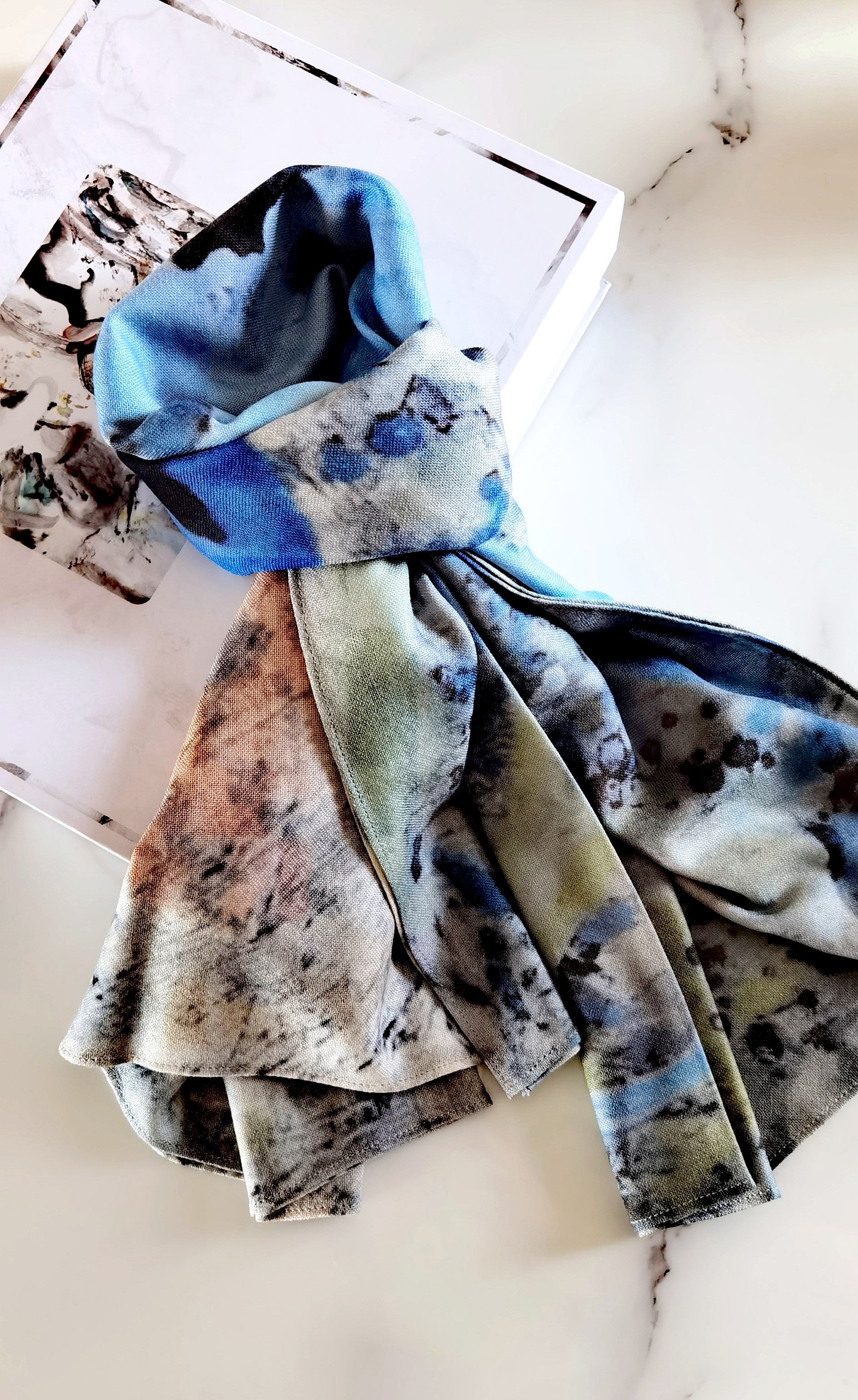 設(shè)計理念:以畫作設(shè)計成羊絨披肩,是畫家心情的真實表達和率性而作。