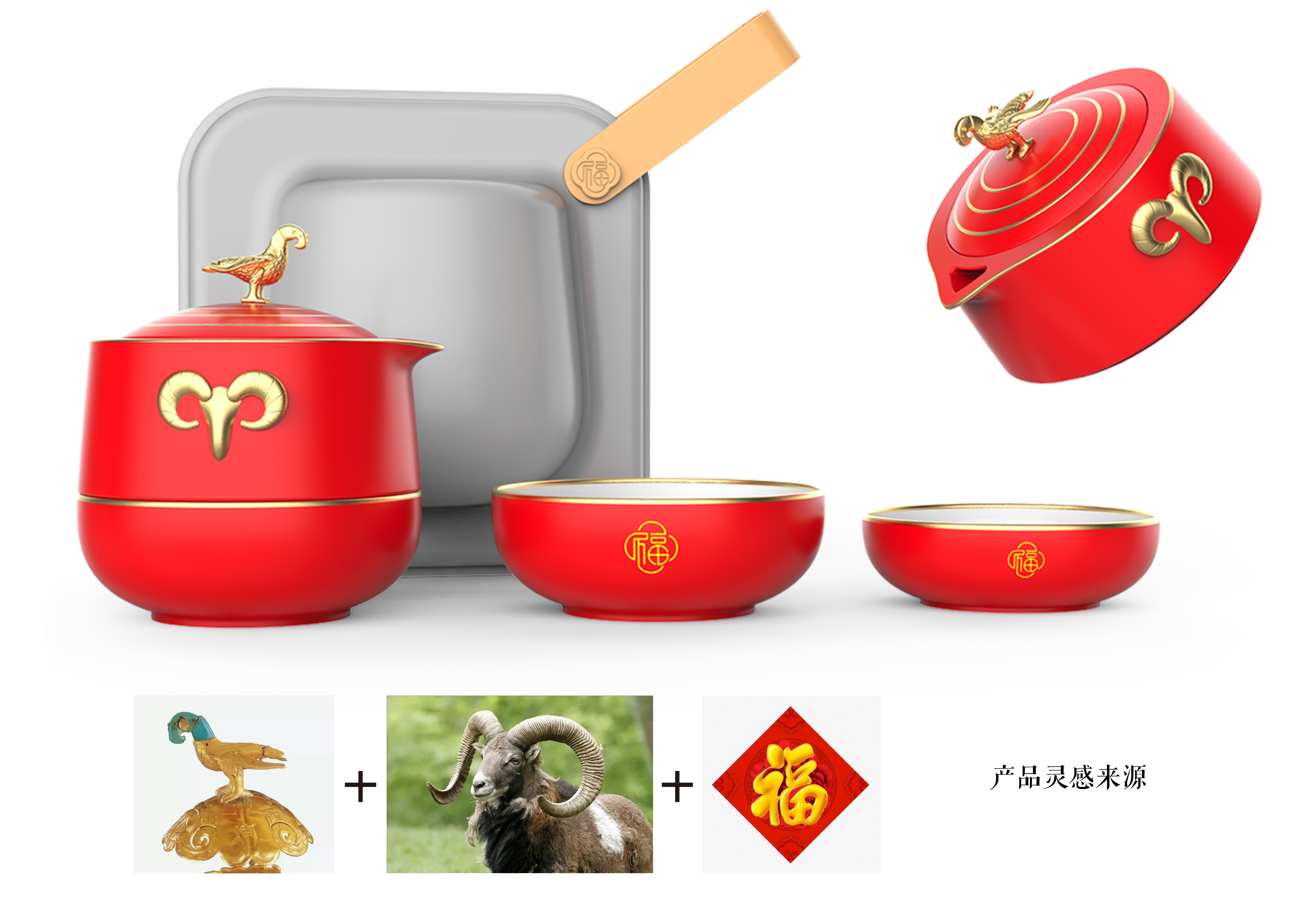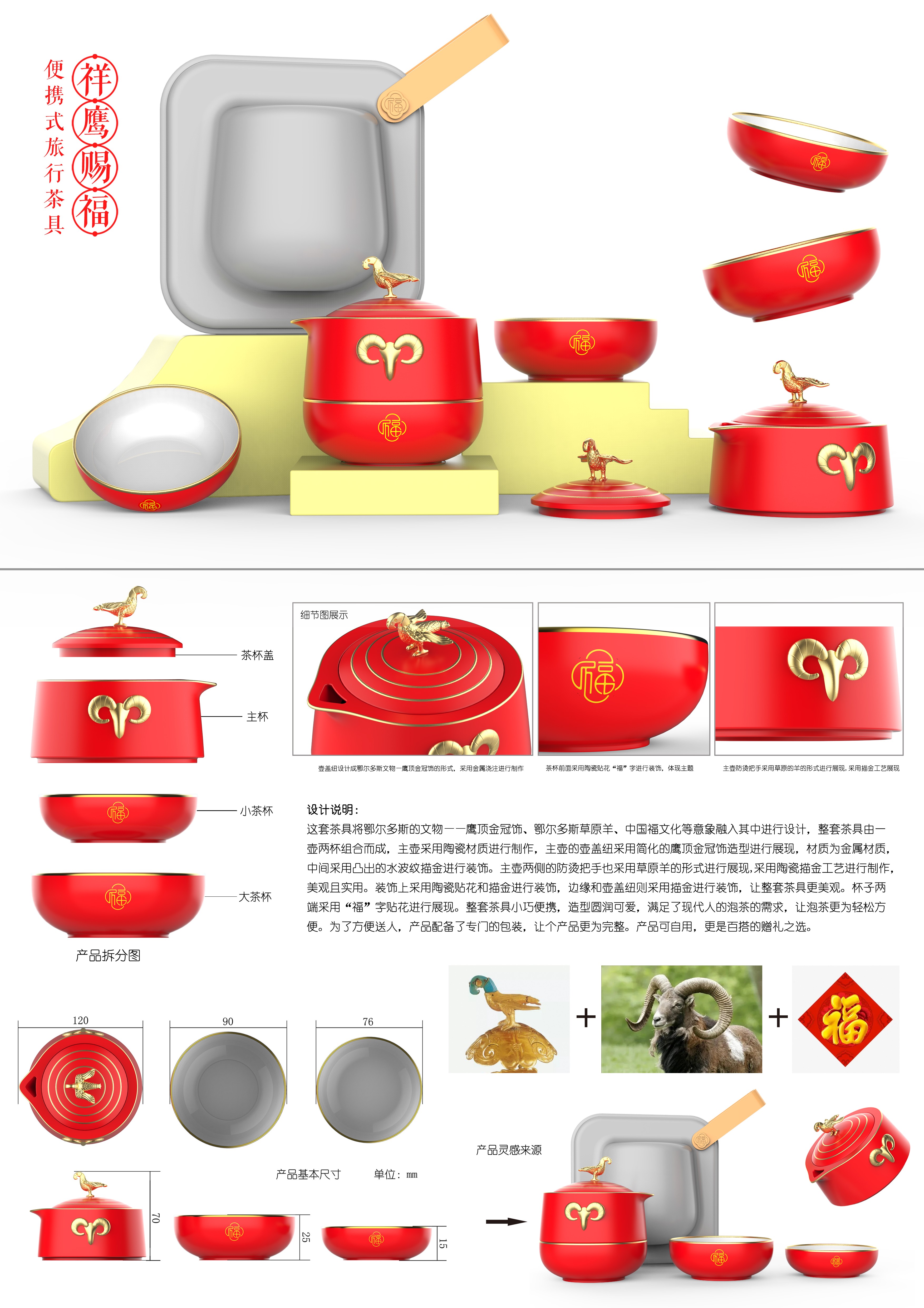 創(chuàng)作思路:這套茶具將鄂爾多斯的文物鷹頂金冠飾、鄂爾多斯草原羊、中國福文化等意象融入其中進行設(shè)計,整套茶具由一壺兩杯組合而成,主壺采用陶瓷材質(zhì)進行制作,主壺的壺蓋紐采用簡化的鷹頂金冠飾造型進行展現(xiàn),材質(zhì)為金屬材質(zhì),中間采用凸出的水波紋描金進行裝飾。主壺兩側(cè)的防燙把手也采用草原羊的形式進行展現(xiàn),采用陶瓷描金工藝進行制作,美觀且實用。裝飾上采用陶瓷貼花和描金進行裝飾,邊緣和壺蓋紐則采用描金。