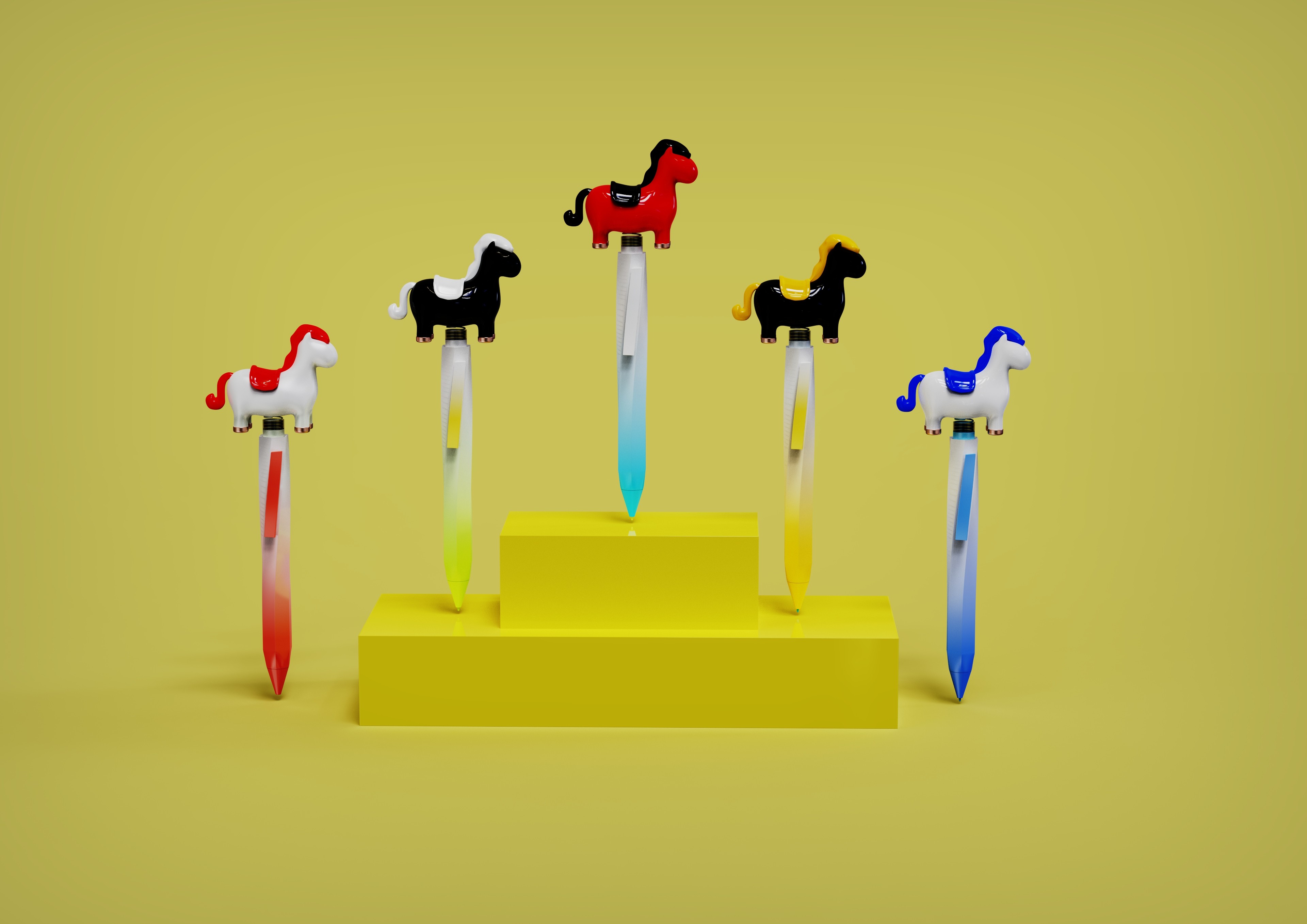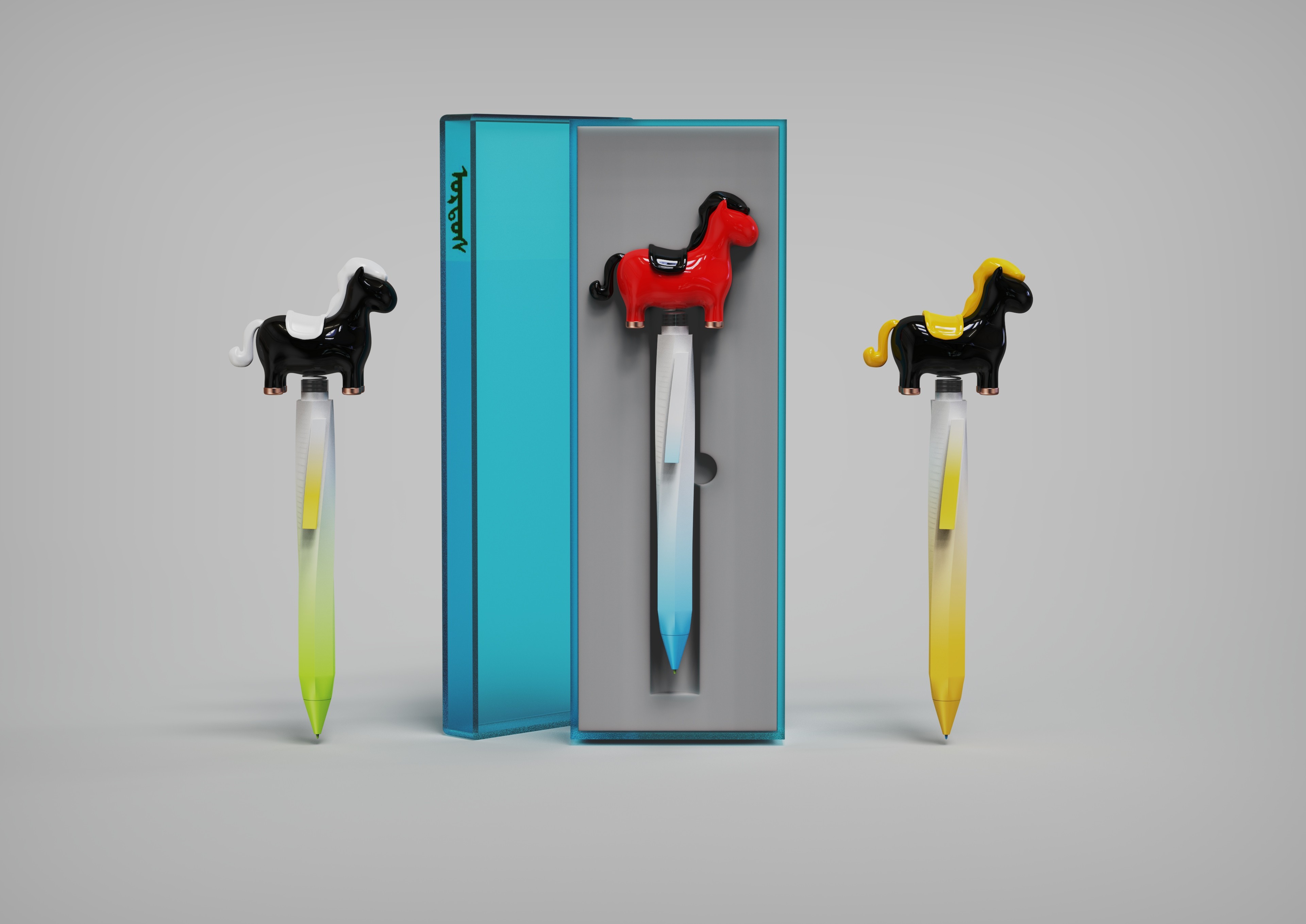 創(chuàng)作思路:靈感源于草原騎馬的樂(lè)趣,設(shè)想以家庭單位旅游,定位便攜送小朋友的紀(jì)念品,設(shè)計(jì)一支可以玩的寫(xiě)字筆。