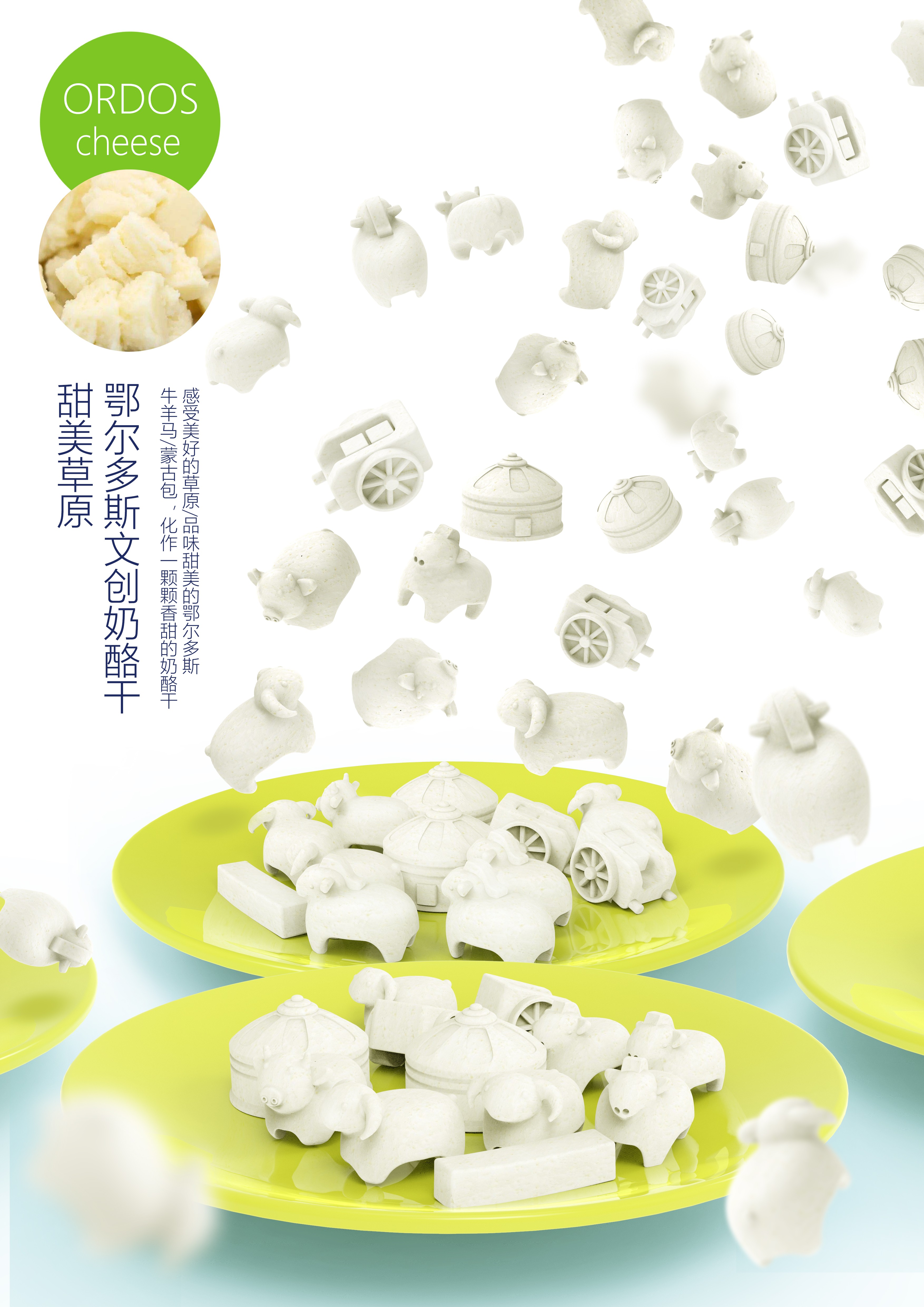 設計理念:用蒙古包元素的包裝來裝原創(chuàng)造型的奶酪干,把牛羊馬車等造型做成小巧的奶酪干,讓草原特色美食變得有趣。
