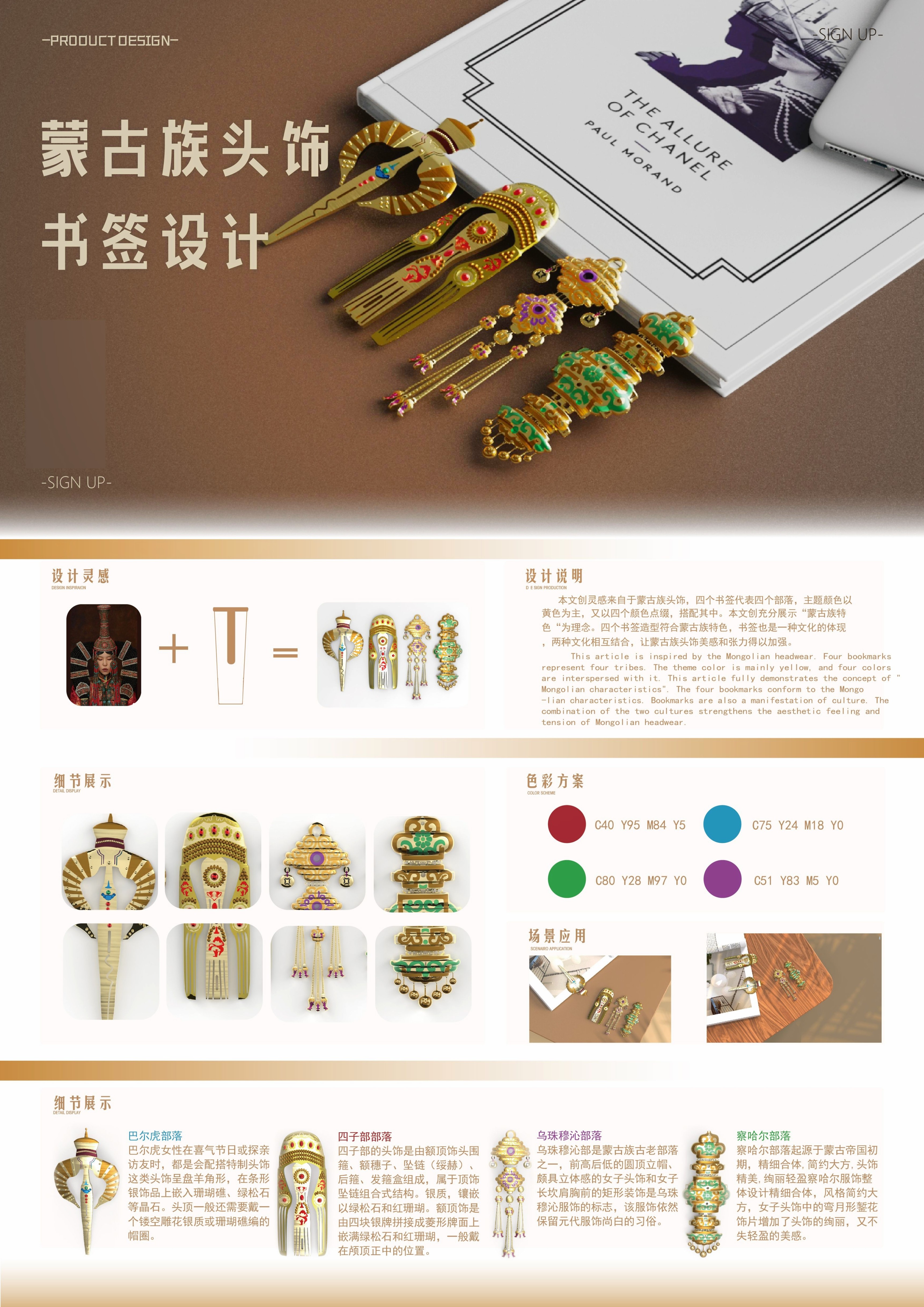 創(chuàng)作思路:本文創(chuàng)設(shè)計思路來源于蒙古族女性頭飾,四個書簽代表四個部落,主體顏色采用與金屬相同的黃色材質(zhì),并且用四個部落不同的頭飾特色與配色相互點綴。
