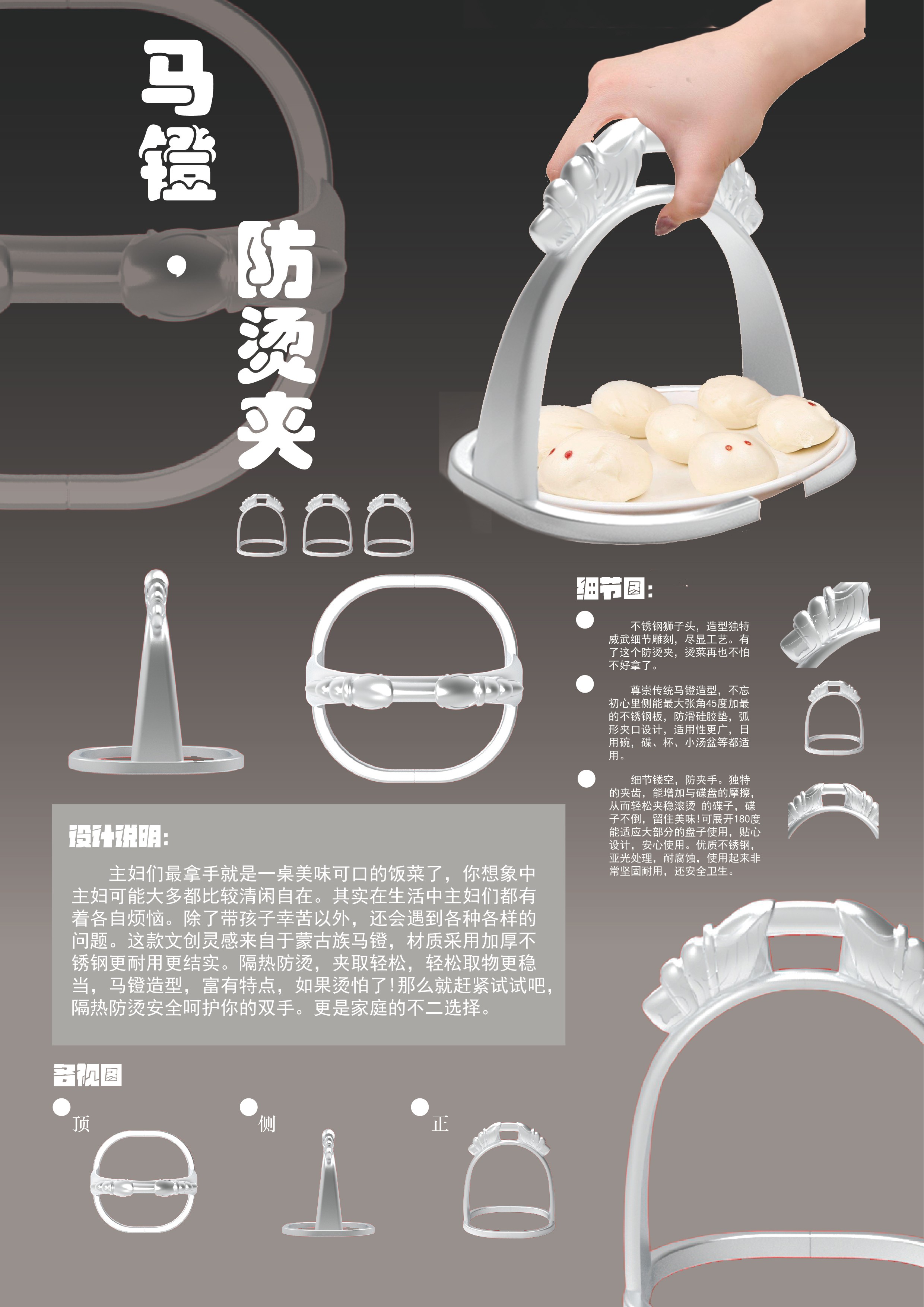 創(chuàng)作思路:這款文創(chuàng)靈感來(lái)自于蒙古族馬鐙,材質(zhì)采用加厚不銹鋼更耐用更結(jié)實(shí)。隔熱防燙,夾取輕松,輕松取物更穩(wěn)當(dāng),馬鐙造型,富有特點(diǎn),如果燙怕了!那么就趕緊試試吧,隔熱防燙安全呵護(hù)你的雙手。更是家庭的不二選擇。