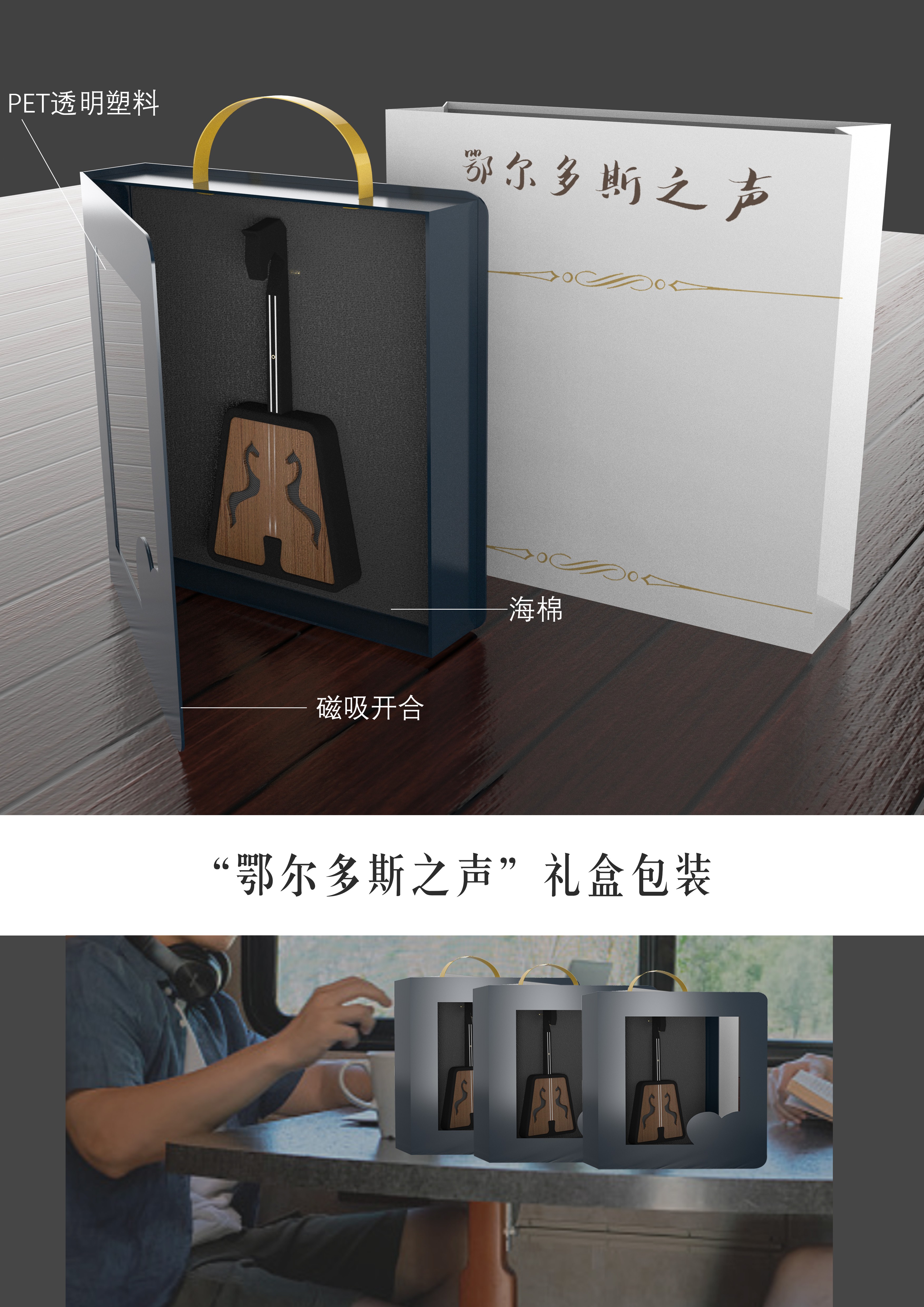 創(chuàng)作思路:以鄂爾多斯著名樂器——馬頭琴為設(shè)計元素,將馬頭琴的關(guān)鍵線條輪廓與琴弦、鏤空的提取造型融入現(xiàn)代家庭小音箱,進(jìn)行設(shè)計。
